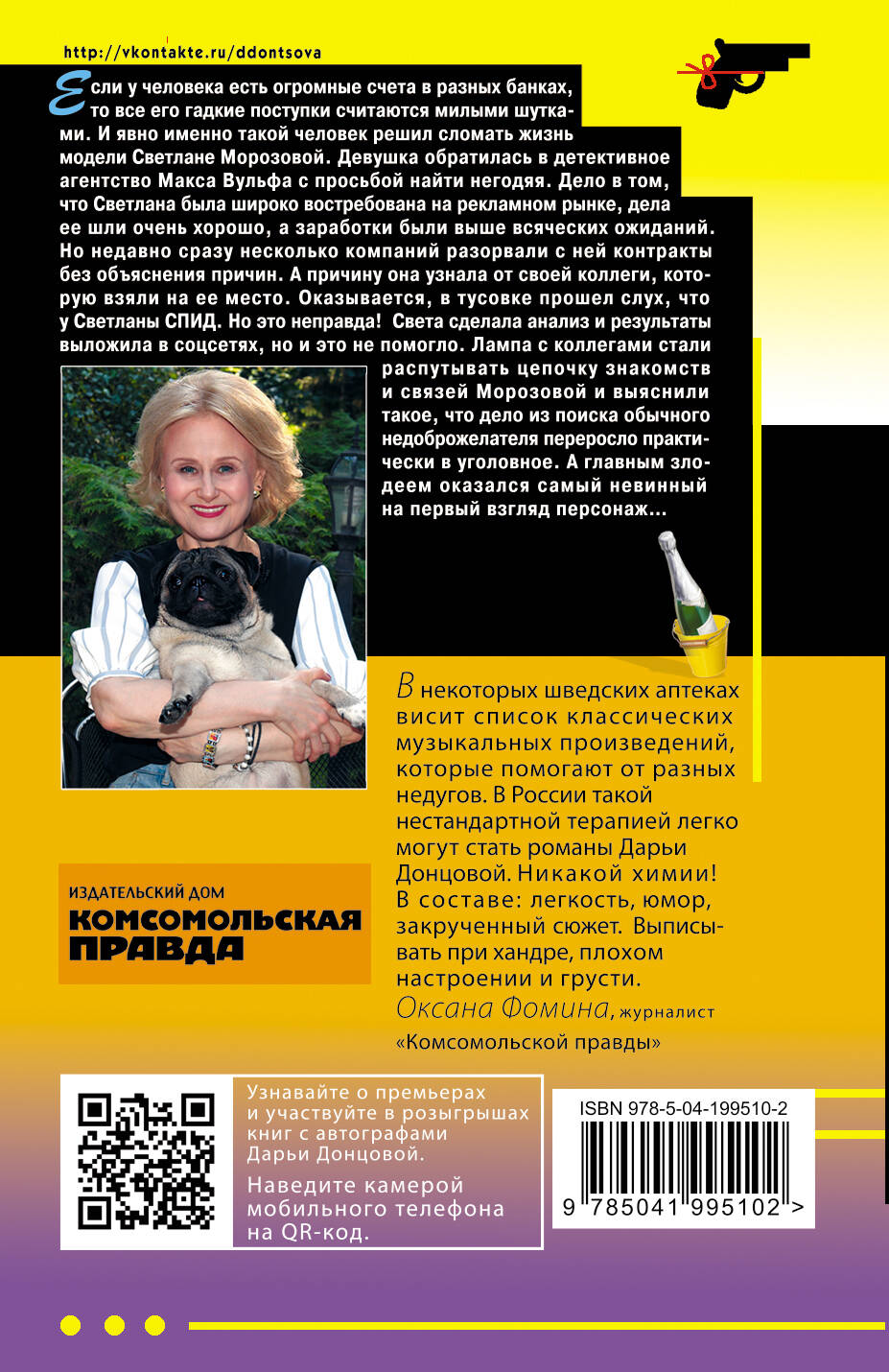 Если у человека есть огромные счета в разных банках, то все его гадкие поступки считаются милыми шутками. И явно именно такой человек решил сломать жизнь модели Светлане Морозовой. Девушка обратилась в детективное агентство Макса Вульфа с просьбой найти негодяя. Дело в том, что Светлана была широко востребована на рекламном рынке, дела ее шли очень хорошо, а заработки были выше всяческих ожиданий. Но недавно сразу несколько компаний разорвали с ней контракты без объяснения причин. А причину она узнала от своей коллеги, которую взяли на ее место. Оказывается, в тусовке прошел слух, что у Светланы СПИД. Но это неправда! Света сделала анализ и результаты выложила в соцсетях, но и это не помогло. Лампа с коллегами стали распутывать цепочку знакомств и связей Морозовой и выяснили такое, что дело из поиска обычного недоброжелателя переросло практически в уголовное. А главным злодеем оказался самый невинный на первый взгляд персонаж… Дарья Донцова - самый популярный и востребованный автор в нашей стране, любимица миллионов читателей. В России продано более 200 миллионов экземпляров ее книг. Ее творчество наполняет сердца и души светом, оптимизмом, радостью, уверенностью в завтрашнем дне! «Донцова невероятная работяга! Я не знаю ни одного другого писателя, который столько работал бы. Я отношусь к ней с уважением, как к образцу писательского трудолюбия. Женщины нуждаются в психологической поддержке и получают ее от Донцовой. Я и сама в свое время прочла несколько романов Донцовой. Ее читают очень разные люди. И очень занятые бизнес-леди, чтобы на время выключить голову, и домохозяйки, у которых есть перерыв 15-20 минут между отвести-забрать детей». - Галина Юзефович, литературный критик| Издательство | ООО "Издательство "Эксмо" |