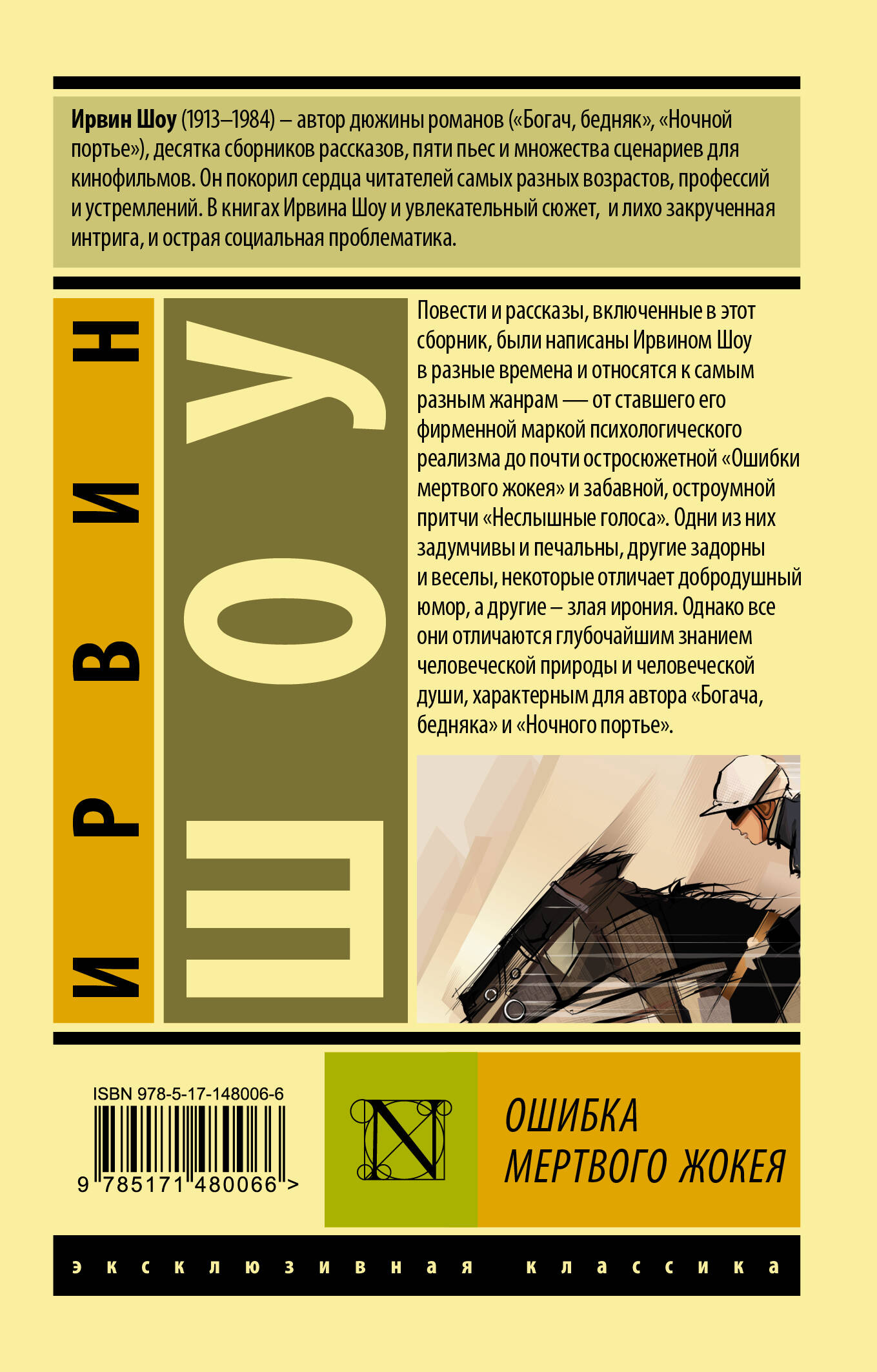 Повести и рассказы, включенные в этот сборник, были написаны Ирвином Шоу в разные времена и относятся к самым разным жанрам - от ставшего его фирменной маркой психологического реализма до почти остросюжетной "Ошибки мертвого жокея" и забавной, остроумной притчи "Неслышные голоса". Одни из них задумчивы и печальны, другие задорны и веселы, некоторые отмечает добродушный юмор, а некоторые - злая ирония. Однако все они отличаются глубочайшим знанием человеческой природы и человеческой души, характерным для автора "Богача, бедняка" и "Ночного портье".| Издательство | ИЗДАТЕЛЬСТВО "АСТ" |