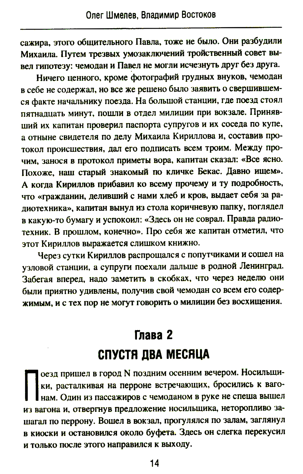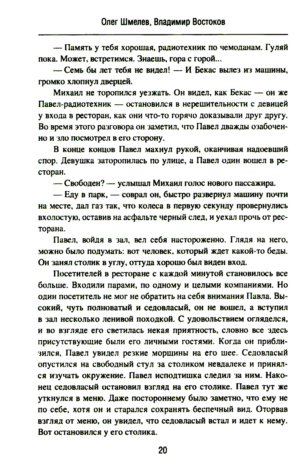 Первая книга приключенческого цикла о резиденте известных писателей Олега Михайловича Шмелева (1924-1987) и Владимира Владимировича Востокова (Петроченкова) (1916-1986) рассказывает о деятельности советских спецслужб. Сын русского эмигранта, профессиональный разведчик Михаил Тульев, завербованный еще гитлеровцами, прибывает в СССР с целью активизации старых агентов и привлечения новых. В поле его зрения попадает беглый вор-рецидивист Матвеев по кличке Бекас... Одноименный фильм был снят в 1968 году режиссером Вениамином Дорманом, в главных ролях: Георгий Жженов, Михаил Ножкин, Олег Жаков.| Издательство | Вече |