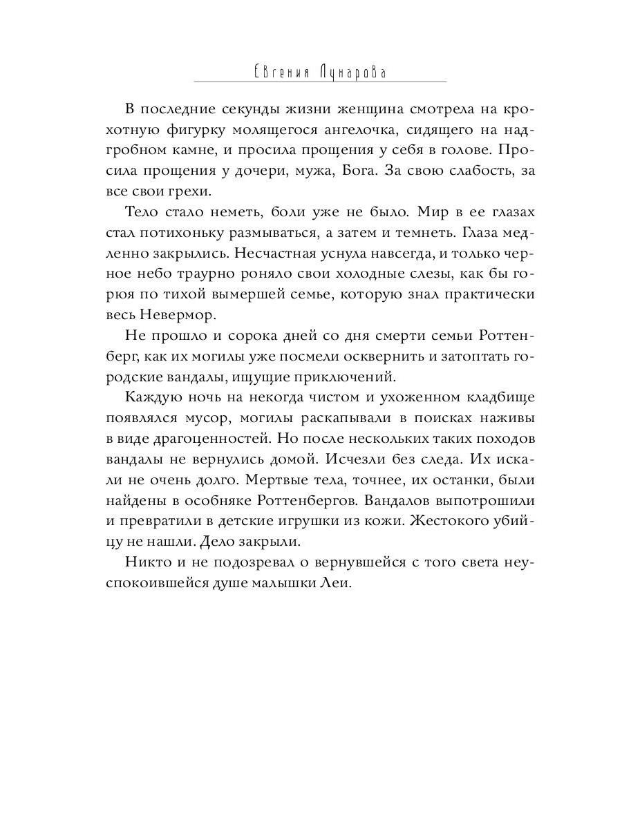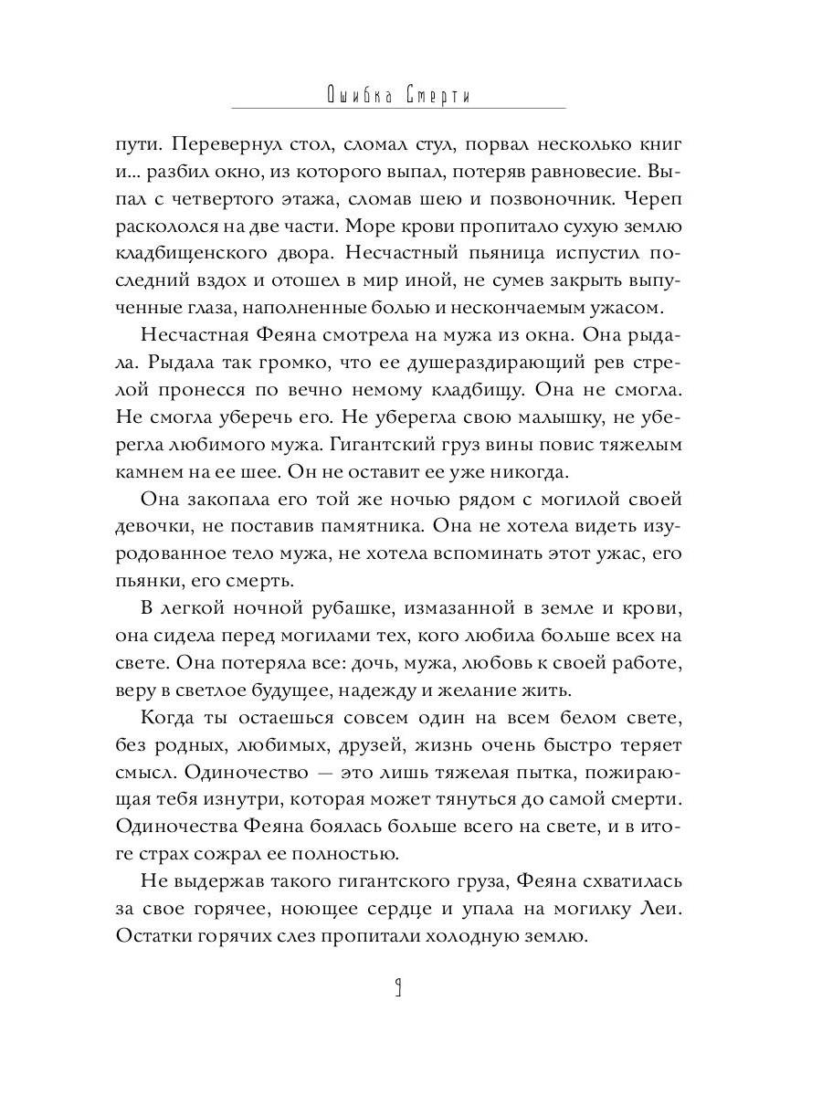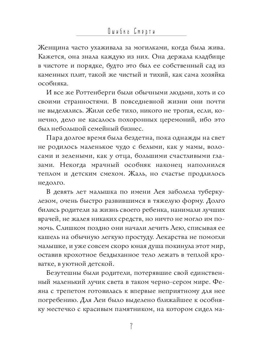 Роман «Ошибка Смерти» - это мрачное, но парадоксально жизнеутверждающее городское фэнтези. Девятилетняя Лея умирает от туберкулеза, но не отправляется в мир иной, а остается в своем доме. Этот недочет обнаруживает Смерть. Вместо того чтобы забрать ее душу, она заключает с Леей сделку - теперь девочка станет преемницей старухи с косой и ее самой большой ошибкой.| Издательство | Т8 RUGRAM |