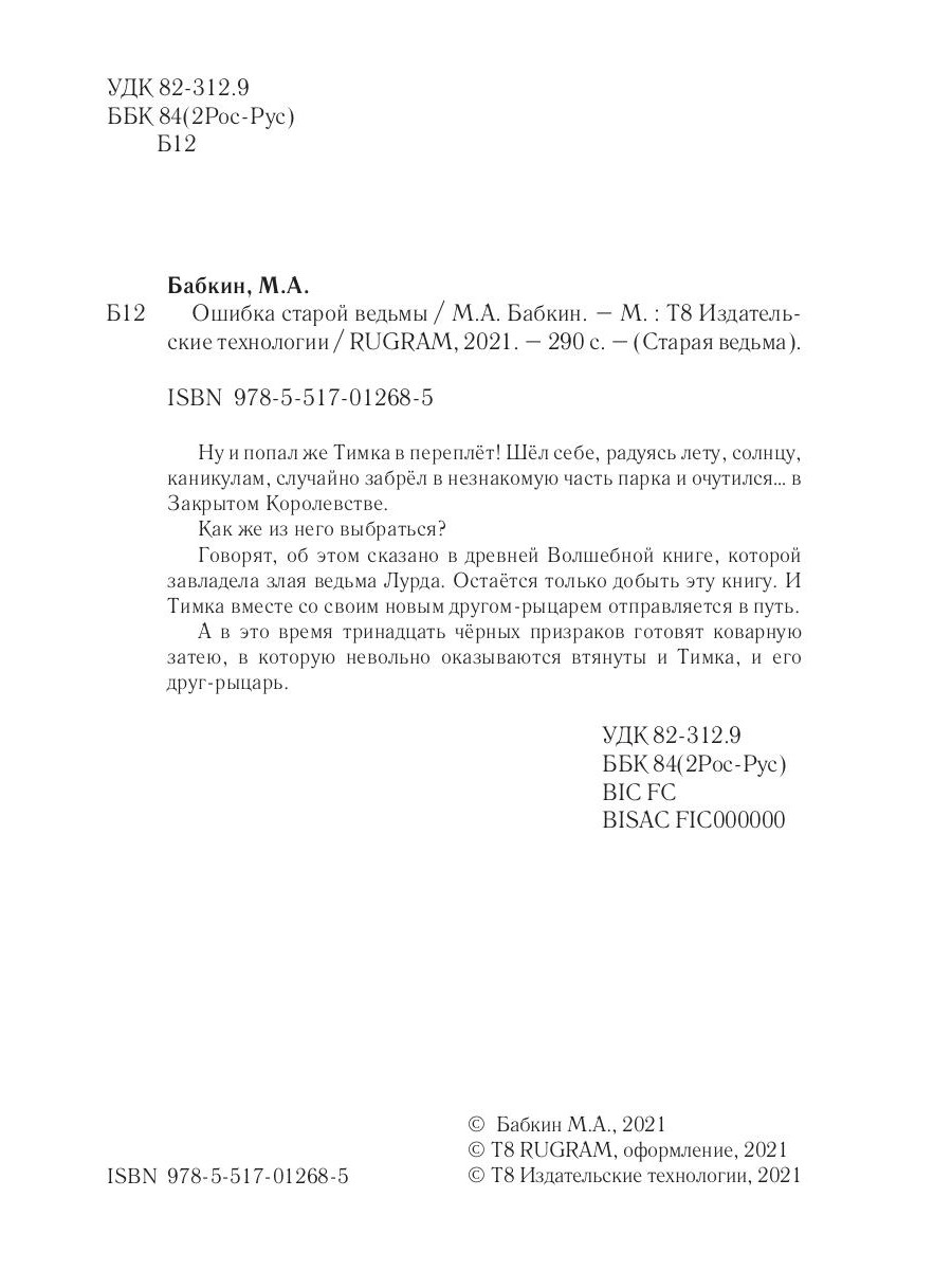Ну и попал же Тимка в переплёт! Шёл себе, радуясь лету, солнцу, каникулам, случайно забрёл в незнакомую часть парка и очутился... в Закрытом Королевстве. Как же из него выбраться? Говорят, об этом сказано в древней Волшебной книге, которой завладела злая ведьма Лурда. Остаётся только добыть эту книгу. И Тимка вместе со своим новым другом-рыцарем отправляется в путь. А в это время тринадцать чёрных призраков готовят коварную затею, в которую невольно оказываются втянуты и Тимка, и его друг-рыцарь.| Издательство | Т8 RUGRAM |
