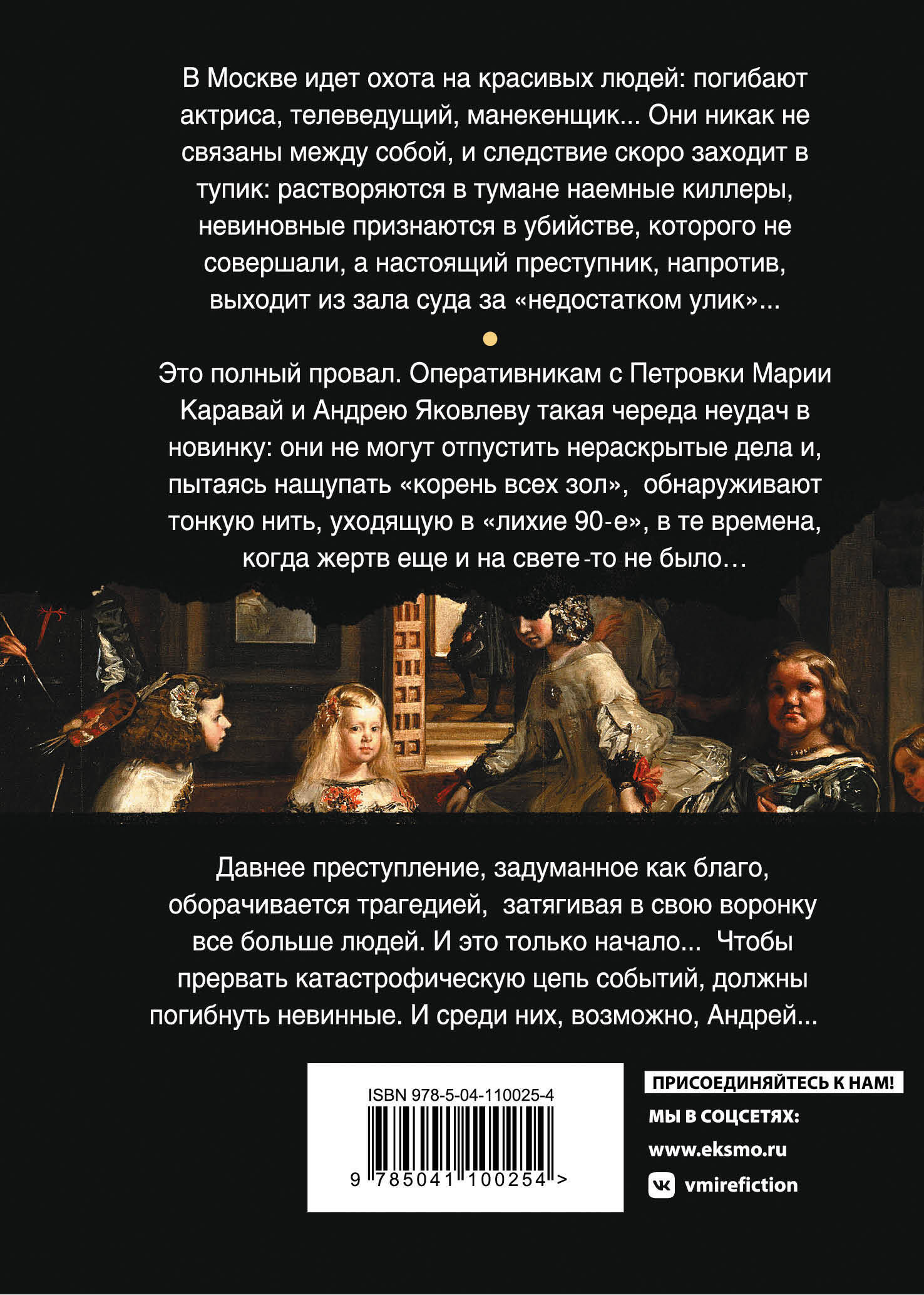 В Москве идет охота на красивых людей: погибают актриса, телеведущий, манекенщик... Они никак не связаны между собой, и следствие скоро заходит в тупик: растворяются в тумане наемные киллеры, невиновные признаются в убийстве, которого не совершали, а настоящий преступник, напротив, выходит из зала суда «за недостатком улик»... Это полный провал. Оперативникам с Петровки Марии Каравай и Андрею Яковлеву такая череда неудач в новинку: они не могут отпустить нераскрытые дела и, пытаясь нащупать «корень всех зол», обнаруживают тонкую нить, уходящую в «лихие 90-е», в те времена, когда жертв еще и на свете-то не было… Давнее преступление, задуманное как благо, оборачивается трагедией, затягивая в свою воронку все больше людей. И это только начало... Чтобы прервать катастрофическую цепь событий, должны погибнуть невинные. И среди них, возможно, Андрей... Детективы Дарьи Дезомбре отличает наличие тонкой интриги, мистических тайн и детального экскурса в историю, культуру и искусство. Над каждой новой книгой Дезомбре работает кропотливо. Воссоздавая прошлое, она читает мемуары, проводит много часов в библиотеках и музеях, собирает фотографии одежды и предметов прошлых эпох из семейных альбомов, журналов. Все книги автора переведены на иностранные языки и пользуются популярностью в Европе.| Издательство | ООО "Издательство "Эксмо" |