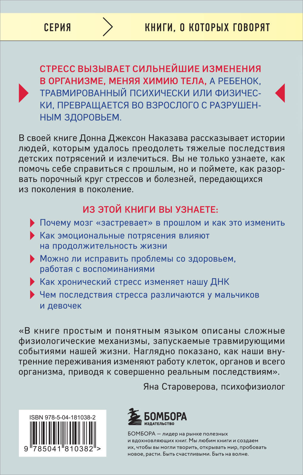 В РОССИИ ПРОДАНО БОЛЕЕ 50 000 ЭКЗЕМПЛЯРОВ! Мы привыкли считать детство самой счастливой и беззаботной порой нашей жизни, забывая, как беззащитны дети перед лицом стресса и боли. Многочисленные исследования подтвердили, что развод или постоянные ссоры родителей, смерть близких, издевательство сверстников или насилие в семье становятся причиной различных болезней и расстройств. Стресс вызывает сильнейшие изменения в организме, меняя химию тела, а психически или физически травмированный ребенок превращается во взрослого с разрушенным здоровьем. В своей книге Донна Джексон Наказава рассказывает истории людей, которым удалось преодолеть тяжелые последствия детских потрясений и излечиться. Вы не только узнаете, как помочь себе справиться с прошлым, но и поймете, как разорвать порочный круг стрессов и болезней, передающихся из поколения в поколение. Из этой книги вы узнаете: - Почему мозг «застревает» в прошлом и как это изменить. - Как эмоциональные потрясения влияют на продолжительность жизни. - Можно ли исправить проблемы со здоровьем, работая с воспоминаниями. - Как хронический стресс изменяет нашу ДНК. - Чем последствия стресса различаются у мальчиков и девочек.| Издательство | ООО "Издательство "Эксмо" |