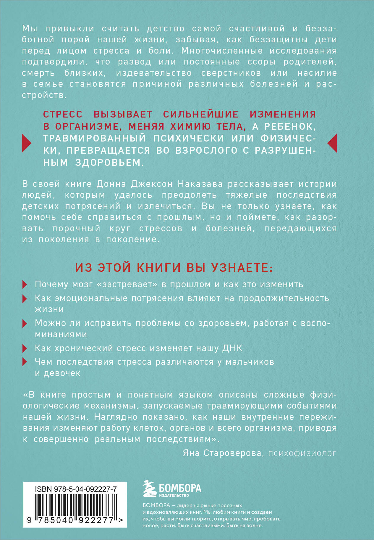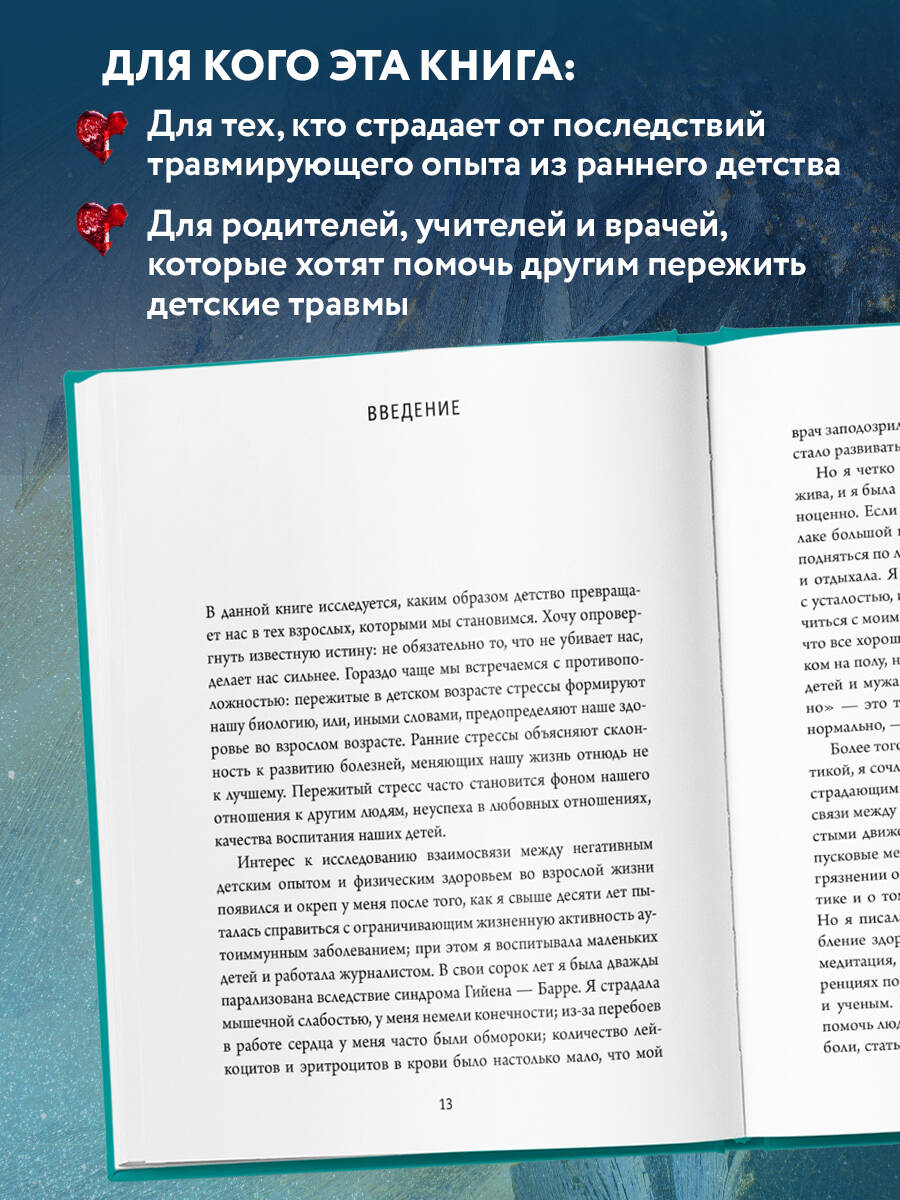 В РОССИИ ПРОДАНО БОЛЕЕ 50 000 ЭКЗЕМПЛЯРОВ! Мы привыкли считать детство самой счастливой и беззаботной порой нашей жизни, забывая, как беззащитны дети перед лицом стресса и боли. Многочисленные исследования подтвердили, что развод или постоянные ссоры родителей, смерть близких, издевательство сверстников или насилие в семье становятся причиной различных болезней и расстройств. Стресс вызывает сильнейшие изменения в организме, меняя химию тела, а психически или физически травмированный ребенок превращается во взрослого с разрушенным здоровьем. В своей книге Донна Джексон Наказава рассказывает истории людей, которым удалось преодолеть тяжелые последствия детских потрясений и излечиться. Вы не только узнаете, как помочь себе справиться с прошлым, но и поймете, как разорвать порочный круг стрессов и болезней, передающихся из поколения в поколение. Из этой книги вы узнаете: - Почему мозг «застревает» в прошлом и как это изменить. - Как эмоциональные потрясения влияют на продолжительность жизни. - Можно ли исправить проблемы со здоровьем, работая с воспоминаниями. - Как хронический стресс изменяет нашу ДНК. - Чем последствия стресса различаются у мальчиков и девочек.| Издательство | ООО "Издательство "Эксмо" |