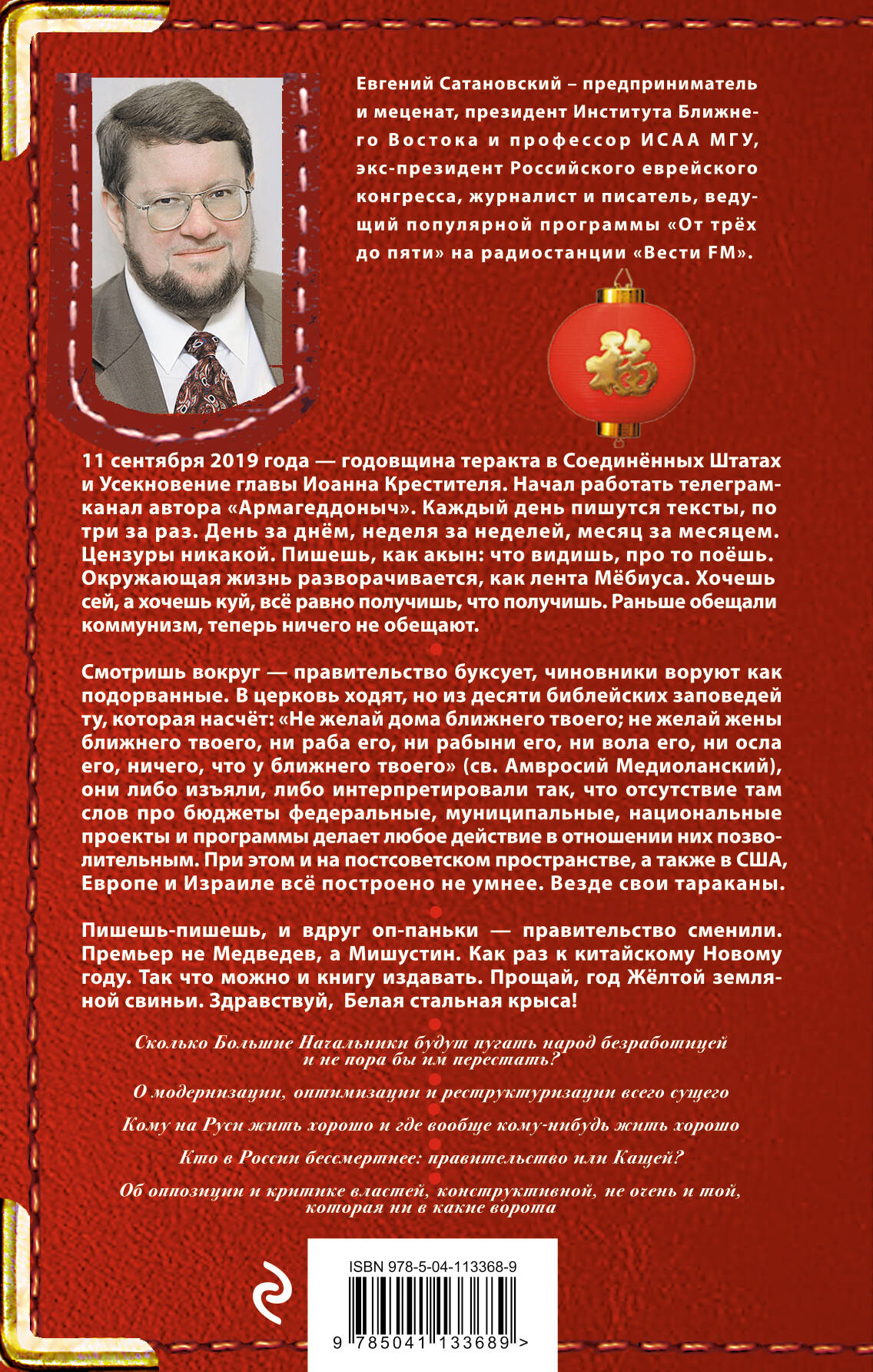 Евгений Сатановский - предприниматель и меценат, президент Института Ближнего Востока и профессор ИСАА МГУ, экс-президент Российского еврейского конгресса, журналист и писатель, ведущий популярной программы "От трёх до пяти" на радиостанции "Вести ФМ". 11 сентября 2019 года - годовщина теракта в Соединённых Штатах и Усекновение главы Иоанна Крестителя. Начал работать телеграм-канал автора "Армагеддоныч". Каждый день пишутся тексты, по три зараз. День за днём, неделя за неделей, месяц за месяцем. Цензуры никакой. Пишешь, как акын: что видишь, про то поёшь. Окружающая жизнь разворачивается как лента Мёбиуса. Хочешь сей, а хочешь куй, всё равно получишь, что получишь. Раньше обещали коммунизм, теперь ничего не обещают. Смотришь вокруг - правительство буксует, чиновники воруют как подорванные. В церковь ходят, но из десяти библейских заповедей ту, которая насчет "Не желай дома ближнего твоего; не желай жены ближнего твоего, ни раба его, ни рабыни его, ни вола его, ни осла его, ничего, что у ближнего твоего" (св. Амвросий Медиоланский), они либо изъяли, либо интерпретировали так, что отсутствие там слов про бюджеты федеральные, муниципальные, национальные проекты и программы делает любое действие в отношении них позволительным. При этом и на постсоветском пространстве, а также в США, Европе и Израиле всё построено не умнее. Везде свои тараканы. Пишешь-пишешь, и вдруг оп-паньки - правительство сменили. Премьер не Медведев, а Мишустин. Как раз к китайскому Новому году. Так что можно и книгу издавать. Прощай, год жёлтой земляной свиньи. Здравствуй, Белая стальная крыса!| Издательство | ООО "Издательство "Эксмо" |