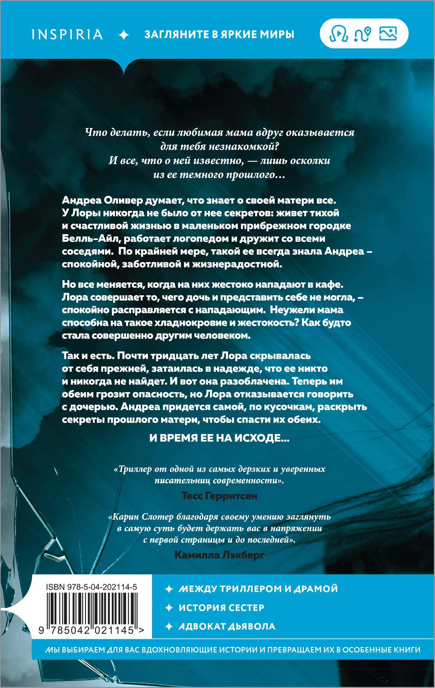 БЕСТСЕЛЛЕР NEW YORK TIMES. ОТ АВТОРА МЕЖДУНАРОДНОГО БЕСТСЕЛЛЕРА «ХОРОШАЯ ДОЧЬ». ЭКРАНИЗАЦИЯ NETFLIX. Что делать, если любимая мама вдруг оказывается для тебя незнакомкой? И все, что о ней известно, - лишь осколки из ее темного прошлого… Андреа Оливер думает, что знает о своей матери все. У Лоры никогда не было от нее секретов: живет тихой и счастливой жизнью в маленьком прибрежном городке Белль-Айл, работает логопедом и дружит со всеми соседями. По крайней мере, такой ее всегда знала Андреа - спокойной, заботливой и жизнерадостной. Но все меняется, когда на них жестоко нападают в кафе. Лора совершает то, чего дочь и представить себе не могла, - спокойно расправляется с нападающим. Неужели мама способна на такое хладнокровие и жестокость? Как будто стала совершенно другим человеком. Так и есть. Почти тридцать лет Лора скрывалась от себя прежней, затаилась в надежде, что ее никто и никогда не найдет. И вот она разоблачена. Теперь им обеим грозит опасность, но Лора отказывается говорить с дочерью. Андреа придется самой, по кусочкам, раскрыть секреты прошлого матери, чтобы спасти их обеих. И время ее на исходе… Яркий и провокационный триллер о разрушительных тайнах, способных разбить привычную жизнь на маленькие осколки, и о том, на что мы готовы пойти ради тех, кого любим. ________________________________________________________________________________________ «Лучший триллер года». - Daily Express «Неизменно популярная писательница Карин Слотер возвращается с новым романом, где в центре событий оказываются запутанные отношения между матерью и дочерью». - Entertainment Weekly «Триллер от одной из самых дерзких и уверенных писательниц современности». - Тесс Герритсен, автор бестселлеров «Я последую за Карин Слотер куда угодно». - Гиллиан Флинн, автор романа «Исчезнувшая» «Карин Слотер, благодаря своему умению заглянуть в самую суть, будет держать вас в напряжении с первой страницы и до последней». - Камилла Лэкберг «Потрясающая писательница на пике своих возможностей!» - Питер Джеймс «Интригующая история, где постепенно раскрываются не только персонажи, но и их тайны». - Guardian