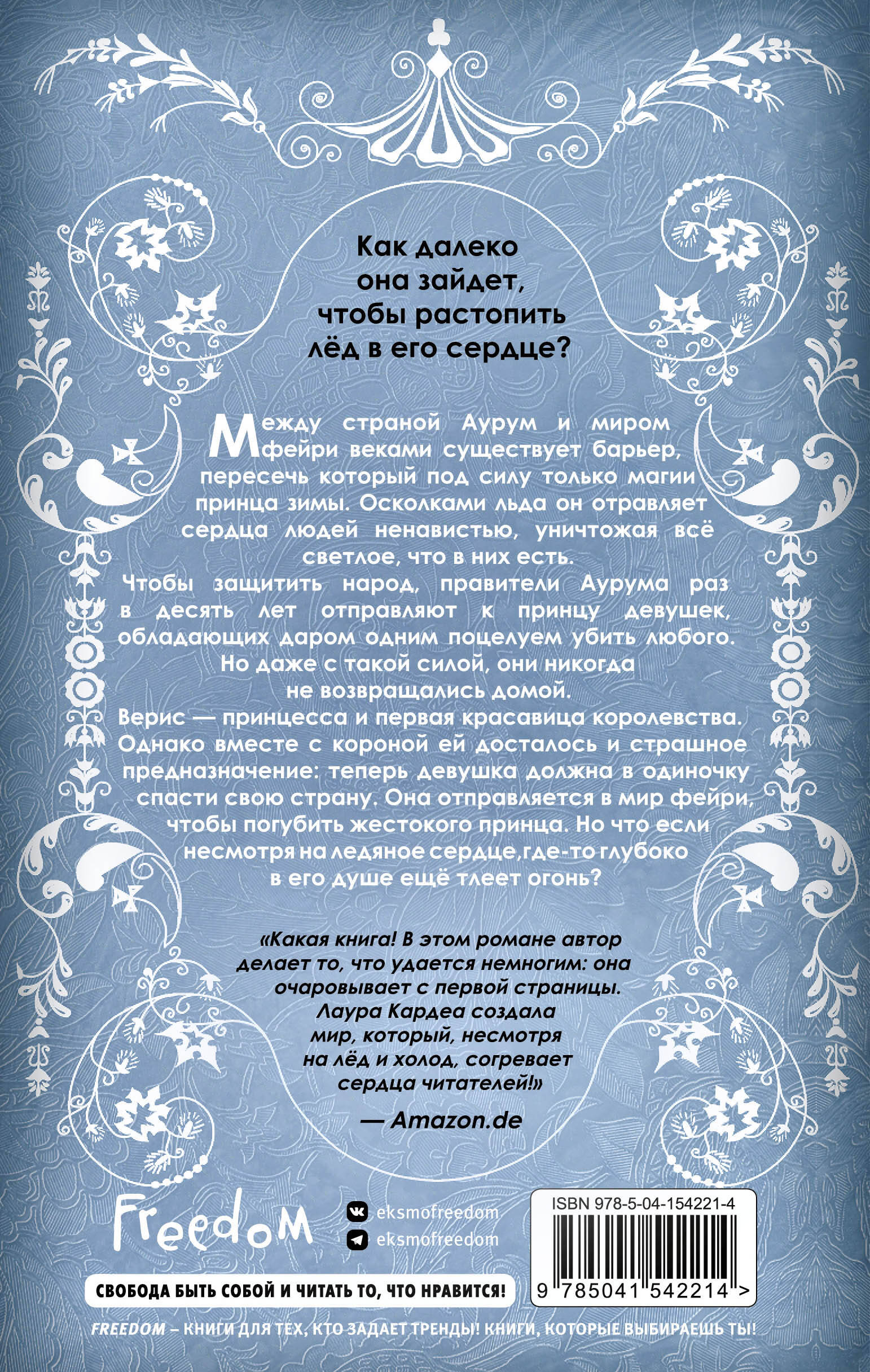 Между страной Аурум и миром фейри веками существует барьер, пересечь который под силу только магии принца зимы. Осколками льда он отравляет сердца людей ненавистью, уничтожая все светлое, что в них есть. Чтобы защитить народ, правители Аурума раз в десять лет отправляют к принцу девушек, обладающих даром одним поцелуем убить любого. Но, даже с такой силой, они никогда не возвращались домой. Верис - принцесса и первая красавица королевства. Однако вместе с короной ей досталось и страшное предназначение: теперь девушка должна в одиночку спасти свою страну. Она отправляется в мир фейри, чтобы погубить жестокого принца. Но что если, несмотря на ледяное сердце, где-то глубоко в его душе еще тлеет огонь? Если вы прочитали серии «Воздушный народ» Холли Блэк и «Железные фейри» Джули Кагава, а теперь хотите еще больше приключений в мире фейри - «Осколки серебра и льда» то, что вы искали! Химия главных героев, от которой щемит сердце! Прекрасная принцесса весны и холодный князь зимы! Какая история их ждет? Лаура Кардеа очень тонко прописывает каждого персонажа, отчего за судьбу героев переживаешь как за свою собственную. Магия времен года и фейри объединяются в одну фантастическую книгу! Настоящий подарок для каждого поклонника романтического фэнтези. От книги невозможно оторваться! Невероятно красивое описание царства зимы пленит читателей с первых страниц. Вам будет страшно представить, что эта история может закончиться!| Издательство | ООО "Издательство "Эксмо" |