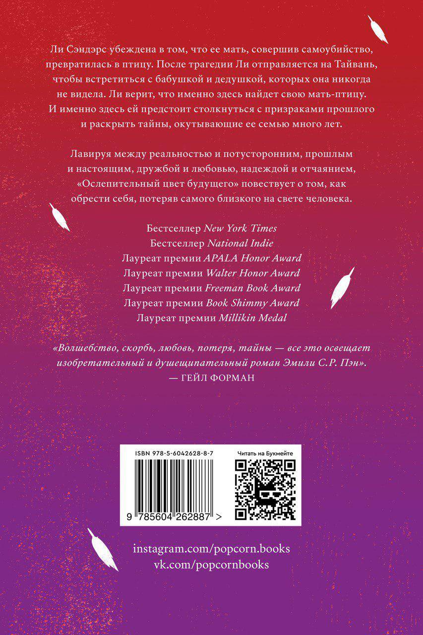 Ли Сэндэрс убеждена в том, что ее мать, совершив самоубийство, превратилась в птицу. После трагедии Ли отправляется на Тайвань, чтобы встретиться с бабушкой и дедушкой, которых она никогда не видела. Ли верит, что именно здесь найдет свою мать-птицу. И именно здесь ей предстоит столкнуться с призраками прошлого и раскрыть тайны, окутывающие ее семью много лет. Лавируя между реальностью и потусторонним, прошлым и настоящим, дружбой и любовью, надеждой и отчаянием, «Ослепительный цвет будущего» - роман, который повествует о том, как обрести себя, потеряв самого близкого на свете человека. Бестселлер New York Times. Бестселлер National Indie. Лауреат премии APALA Honor Award. Лауреат премии Walter Honor Award. Лауреат премии Freeman Book Award. Лауреат премии Book Shimmy Award. Лауреат премии Millikin Medal.| Издательство | ИНДИВИДУУМ ПРИНТ ООО |