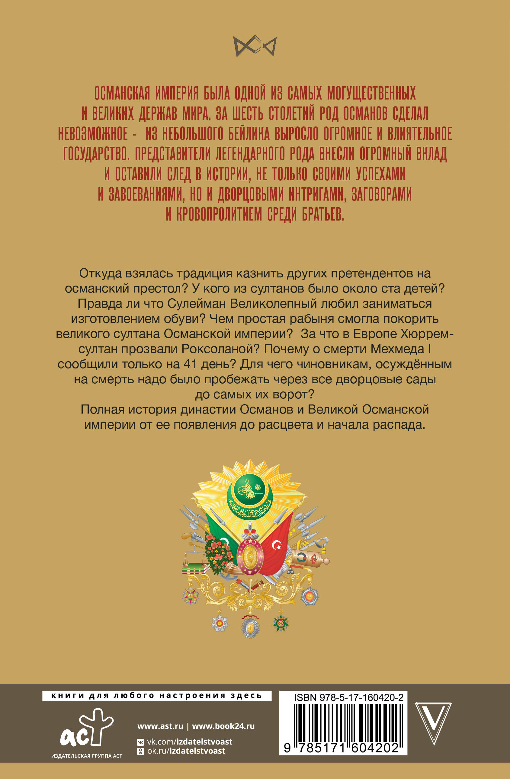 Османская империя одна из самых могущественных и великих держав. За шесть столетий род Осман сделал невозможное, и из небольшого бейлика выросло огромное и влиятельное государство. Представители рода Осман внесли огромный вклад и оставили след в истории, не только своими успехами и завоеваниями, но и дворцовыми интригами, заговорами и кровопролитием среди братьев. Откуда взялась традиция казнить других претендентов на османский престол? У кого из султанов было около ста детей? Правда ли что Сулейман Великолепный любил заниматься изготовлением обуви? Чем простая рабыня смогла покорить великого султана Османской империи? За что в Европе Хюррем-султан прозвали Роксоланой? Почему о смерти Мехмеда I сообщили только на 41 день? Почему должность великого визиря была крайне нежелательной во время правления Селима Грозного? Для чего чиновникам, осуждённым на смерть надо было пробежать через все дворцовые сады до самых их ворот? Вся история династии Осман и Великой Османской империи от ее появления до апогея и начала распада.| Издательство | Издательство "АСТ" |