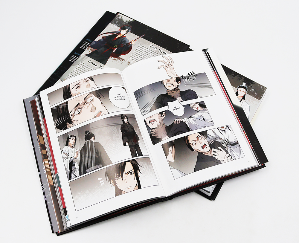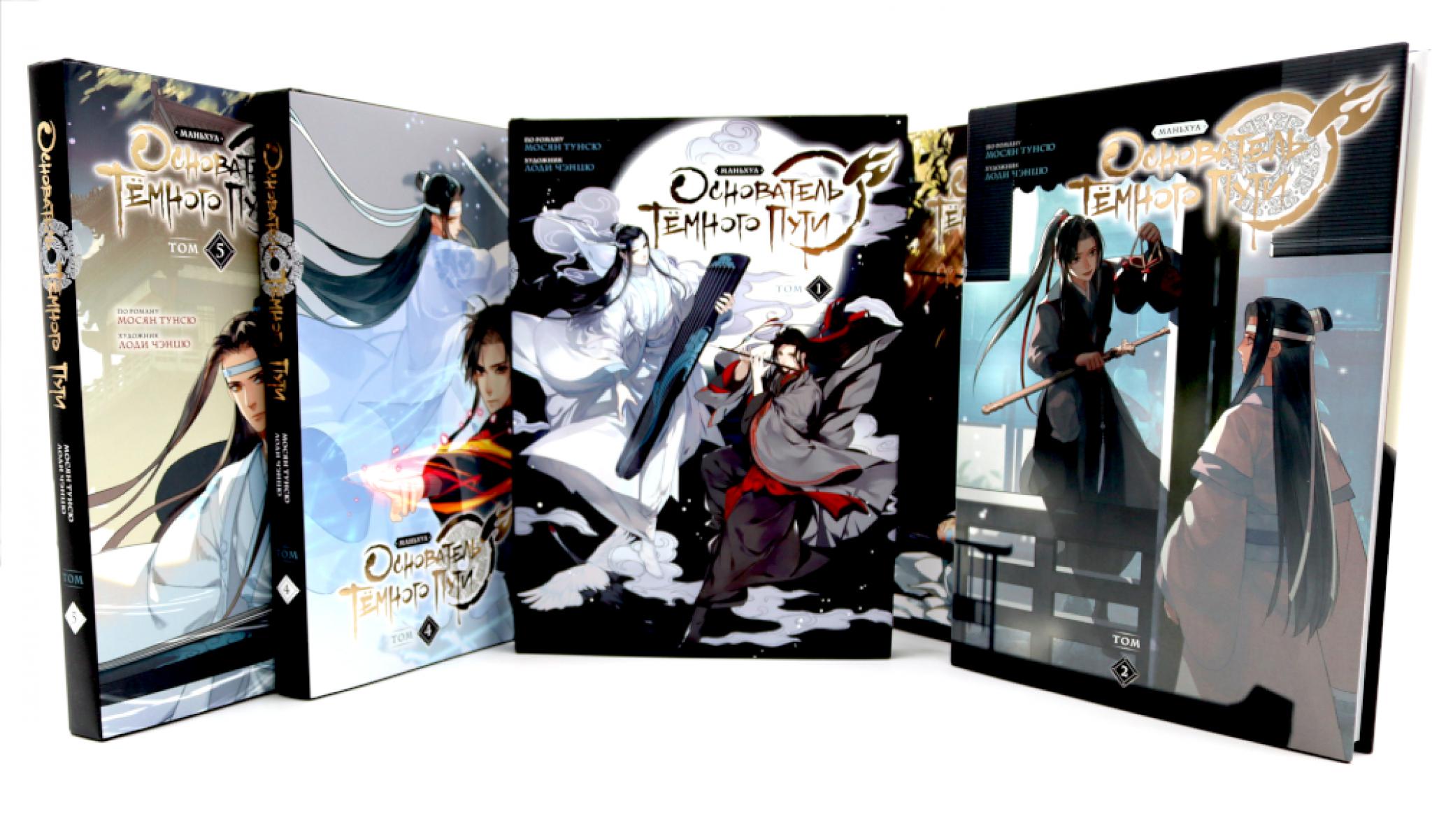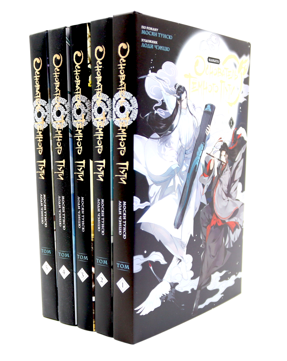 Комплект состоит из пяти книг (1-5) маньхуа Мосян Тунсю «Основатель Темного Пути». В первой книге тринадцать лет назад именитые кланы заклинателей общими усилиями уничтожили Вэй Усяня - талантливого юношу, избравшего Тёмный Путь. Теперь же некто вернул его в мир живых, совершив ритуал добровольного пожертвования тела. Однако за эту услугу придётся исполнить последнее желание предыдущего владельца бренной оболочки: расквитаться со всеми врагами. Не успев освоиться, герой попадает в круговорот загадочных событий. Чтобы защитить неопытных заклинателей от нападения призрачной руки, он вынужден обратиться к Тёмному Пути. Но тут появляется Лань Ванцзи - его давний знакомый из прошлой жизни. Неужели личность Вэй Усяня будет раскрыта? Во второй книге ох и зря Вэй Усянь приблизился к горе Дафань - старых приятелей глупой маскировкой провести не удалось! Теперь Ханьгуан-цзюнь забирает его с собой в Облачные Глубины, да только этот Лань Ванцзи совсем не похож на себя прежнего: хранит в тайнике вино и безропотно терпит все бесчинства Вэй Усяня. Зато Облачные Глубины такие же скучные - даже правил на Стене Наставлений заметно прибавилось. Но герой не унывает: он и в свои пятнадцать вместо учёбы веселился в Гусу так, что достопочтенный учитель Лань хватался за сердце. А уж во что вылилась первая встреча с блистательным Лань Ванцзи... В третьей книге сон Вэй Усяня о беззаботной юности подходит к концу. Остались в прошлом дружеские перепалки с Цзян Чэном, «страшные» библиотечные наказания и беззлобные шуточки над Лань Чжанем. Новое утро приносит новые заботы. Чтобы раскрыть зловещую тайну, нужно собрать воедино тело и душу неизвестного - и как прикажете это сделать, когда от покойника нашлась только левая рука? Ведомые её указательным пальцем, Вэй Усянь и Лань Ванцзи отправляются в путешествие, но вместо ответов их ждут лишь новые загадки... В четвертой книге Случись что в мире совершенствующихся - все тут же бросаются наперебой обвинять Старейшину Илина. Казалось бы, столько людей замешаны в страшной трагедии клана Чан... а зачинщиком всё равно считают Вэй Усяня. Дело в том, что давным-давно он создал ужасающее оружие: ПечатьТьмы. И до сих пор желание обладать ею толкает многих на безумные поступки. Однако Вэй Усянь не отчаивается. Он обязательно отыщет истину даже в таком запутанном деле! Только сперва ещё разок проверит на прочность правила клана Лань, ведь не каждый день удаётся уговорить праведного Ханьгуан-цзюня пригубить вина. Тем временем призрачная рука приводит героев в гиблые края, где они встречают толпы мертвецов и... очень знакомых юных заклинателей. Интересно, кто ещё скрывается в густом тумане зловещего города И? В пятой книге однажды город И приютил в своих стенах необычную компанию: незрячего даоса Сяо Синчэня, бойкую девицу а-Цин и тёмного заклинателя Сюэ Яна. Не так-то просты эти люди, у каждого есть секреты, которые нельзя произносить вслух. И никому не ведомо, когда закончится их мирная жизнь под одной крышей, где главная проблема, на первый взгляд, - чья очередь сегодня идти на рынок за овощами... Но это всё - истории из прошлого. А в настоящем Сюэ Ян готов на любую жестокость, лишь бы заручиться поддержкой печально известного Старейшины Илина. Вот только сможет ли Вэй Усянь ему помочь? Ведь некоторые ошибки не под силу исправит