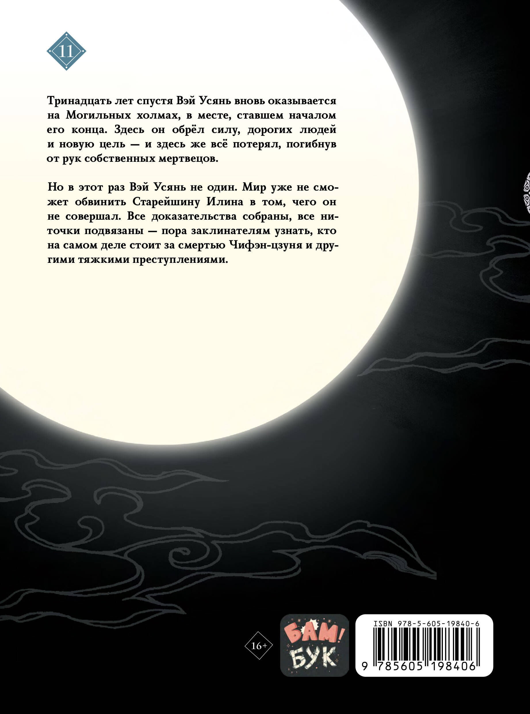 Тринадцать лет спустя Вэй Усянь вновь оказывается на Могильных холмах, в месте, ставшим началом его конца. Здесь он обрёл силу, дорогих людей и новую цель - и здесь же всё потерял, погибнув от рук собственных мертвецов. Но в этот раз Вэй Усянь не один. Мир уже не сможет обвинить Старейшину Илина в том, чего он не совершал. Все доказательства собраны, все ниточки подвязаны - пора заклинателям узнать, кто на самом деле стоит за смертью Чифэн-цзуня и другими тяжкими преступлениями.| Издательство | ООО "Издательство "Эксмо" |