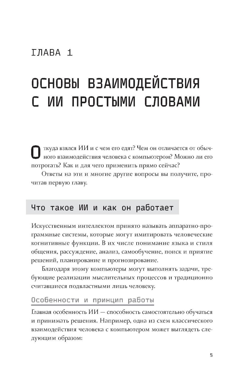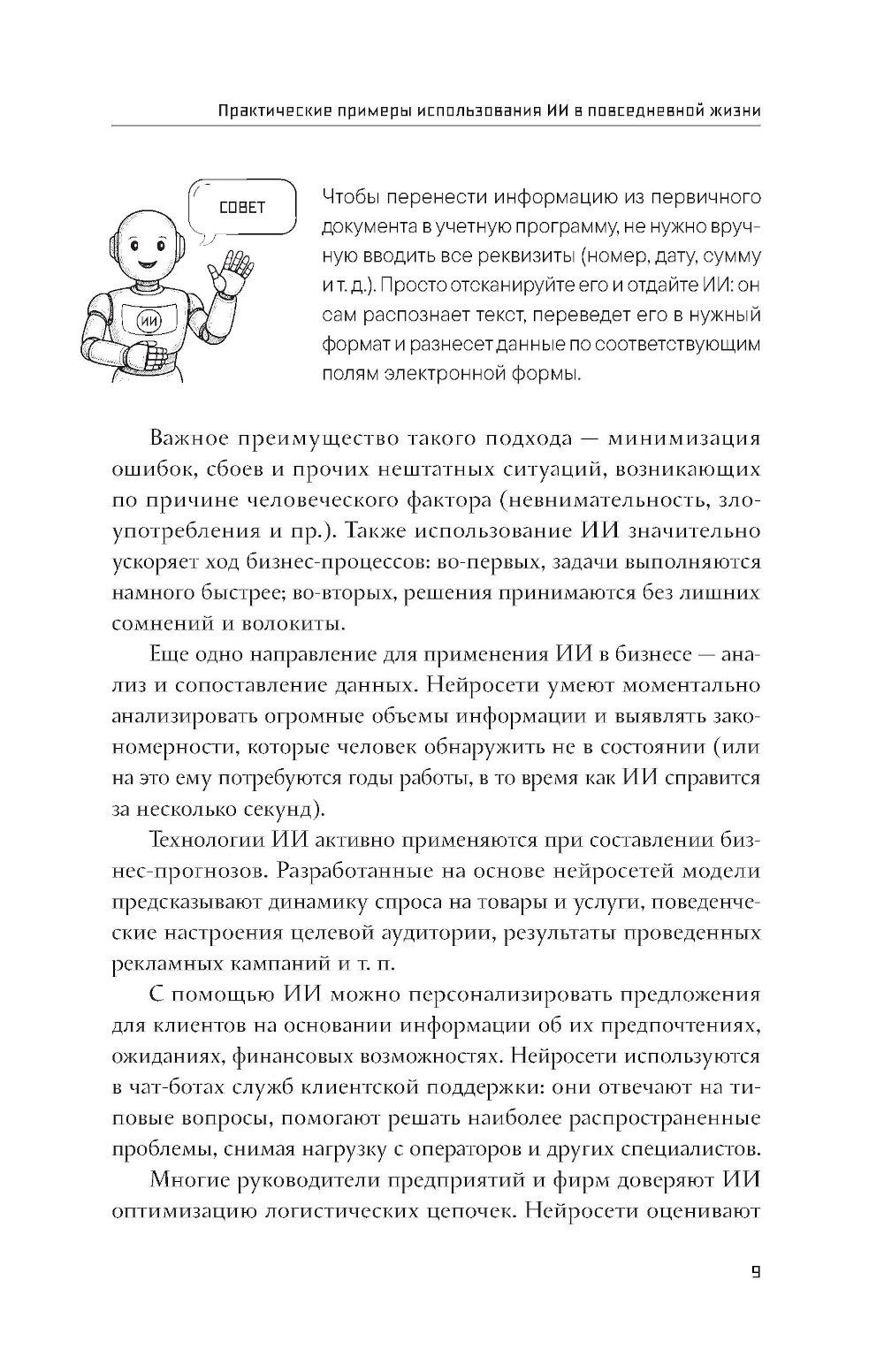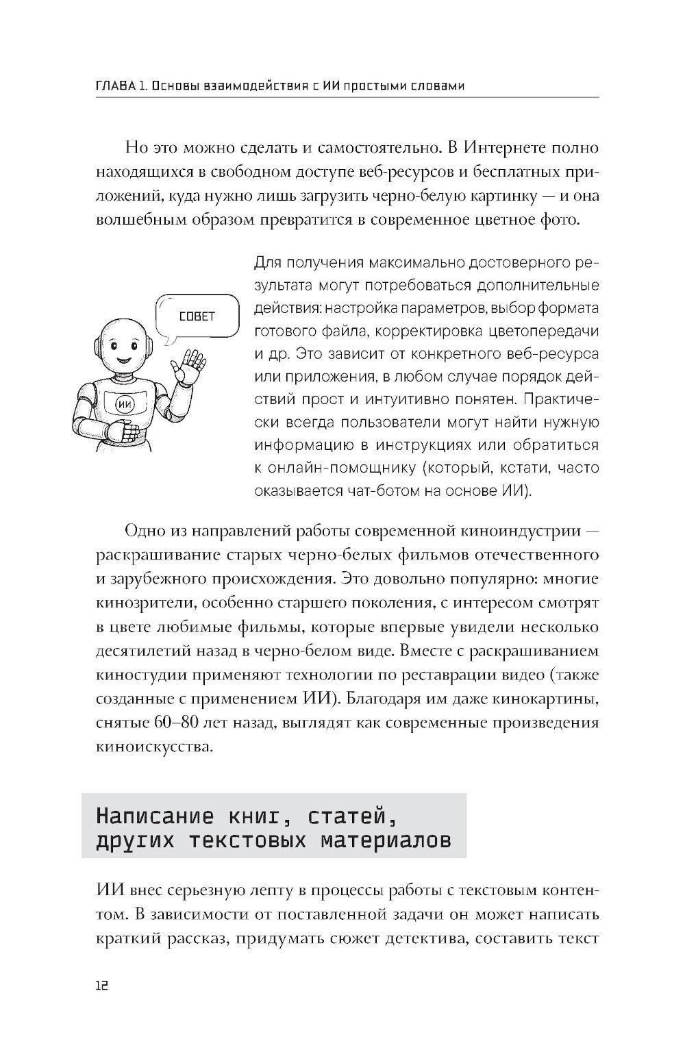 Как использовать искусственный интеллект каждый день без навыков в области высоких технологий. Сегодня не уметь пользоваться искусственным интеллектом - почти то же самое, что не уметь читать. Современные технологии помогают строить здания и фабрики, создавать компьютерные программы и писать книги, рисовать картины и сочинять музыку, улучшать старые фотографии и видео, снимать кинофильмы, справляться с грустью и одиночеством и решать огромное количество повседневных дел. Основы взаимодействия с ИИ простыми словами: - Что такое ИИ и зачем он нужен. - Зачем разговаривать с чат-ботами. - Как создать произведение искусства, не имея специальных навыков. - Кто живет в умной колонке. Легко научиться новому и понять, как устроен современный мир! А главное - вы сможете начать использовать мощные возможности новейших технологий без посторонней помощи. Эти знания помогут адаптироваться к меняющейся цифровой среде и сделают вашу жизнь более интересной.| Издательство | Эксмо |