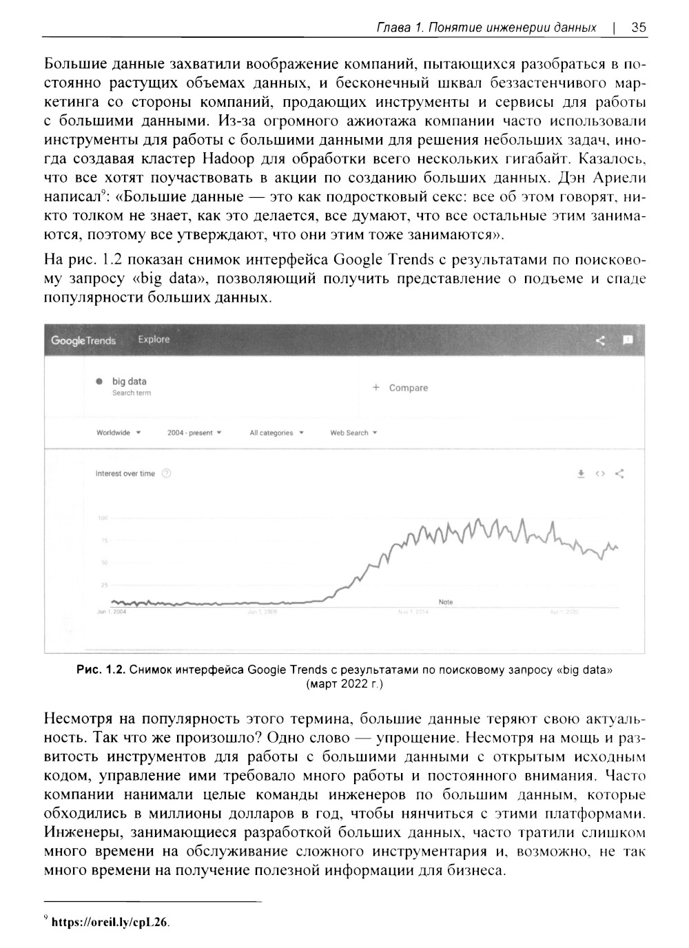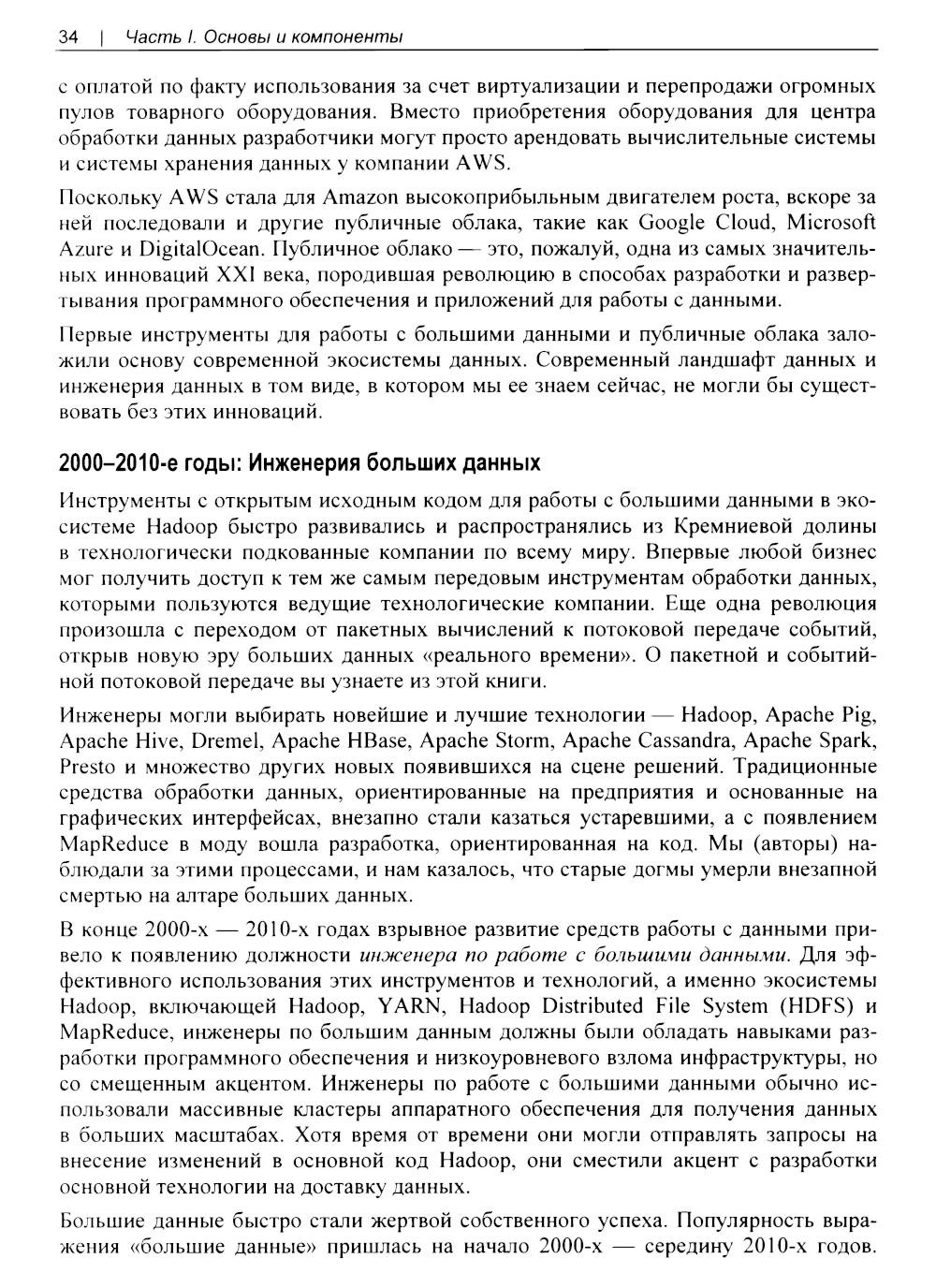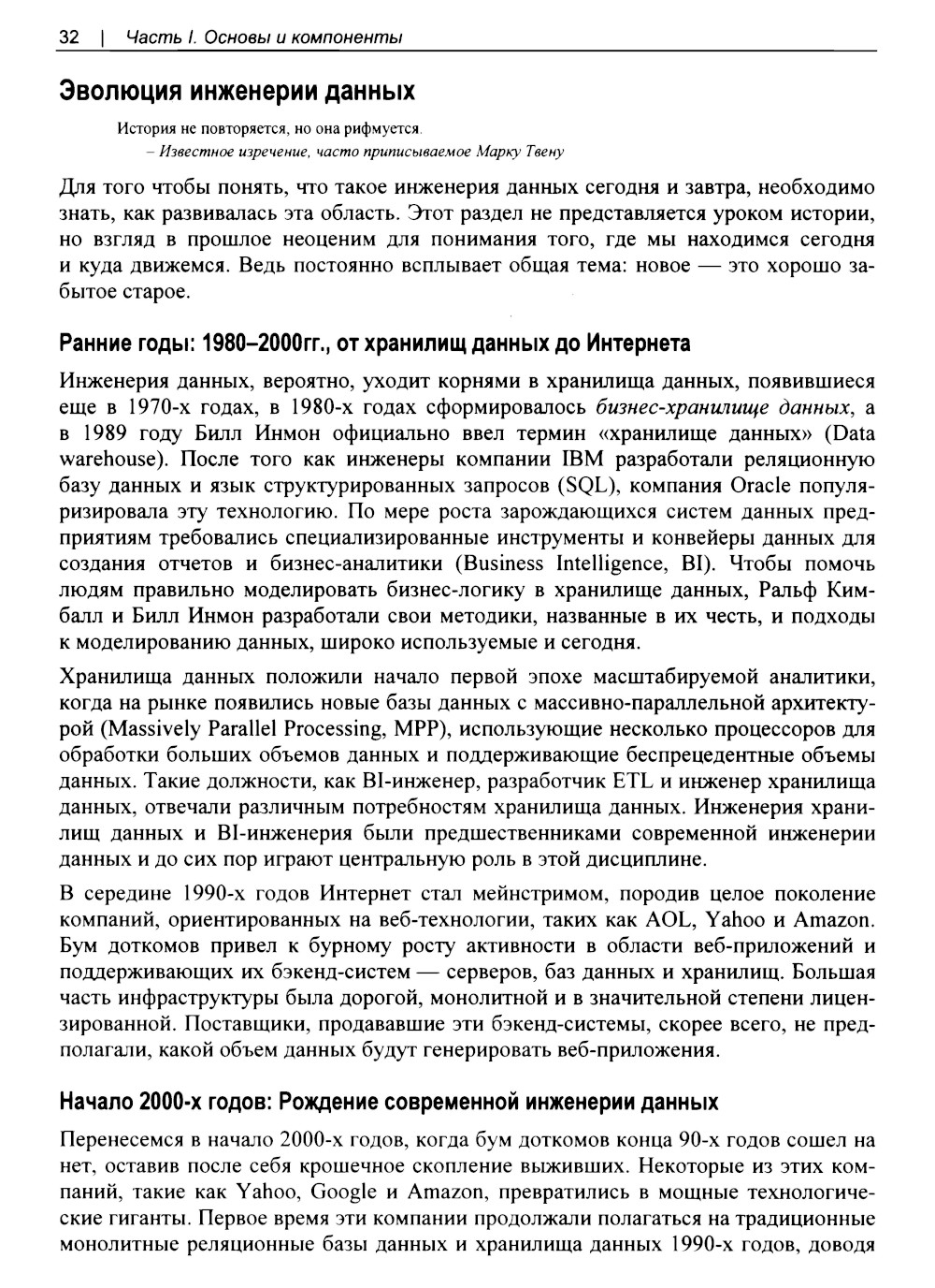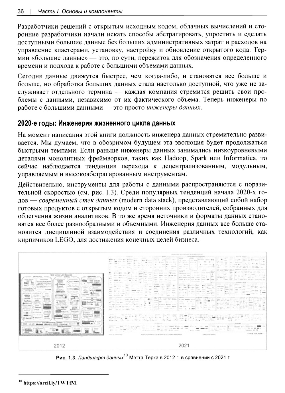 Базовая книга по инженерии данных. Рассмотрены все аспекты проектирования и эксплуатации различных архитектур данных, а также полный жизненный цикл работы с данными: подготовка, поглощение, преобразование, очистка, сочетание, оркестрация, конвейеризация. Особое внимание уделено облачным технологиям, распределению нагрузки и безопасному хранению данных. Разобраны приёмы формирования запросов, работы с базами данных и отслеживания потоков данных. Книга даёт исчерпывающее представление о проектировании систем для обработки разнородных данных, поддержании этих систем в упорядоченном и доступном виде и о тенденциях развития современной индустрии данных. Последнее десятилетие инженерия данных бурно развивается, поэтому среди программистов, исследователей и аналитиков данных растёт запрос на комплексное рассмотрение инженерии данных как цельной парадигмы. Из книги вы узнаете, как проектировать и создавать enterprise-системы для обработкпи данных. Книга помогает оценить разнообразные технологии, доступные в рамках инженерии данных, понять жизненный цикл данных как продукта. Авторы демонстрируют все тонкости инженерии данных в динамике, рассказывают, как объединять и сочетать различные облачные технологии обработки данных для максимального удовлетворения интересов пользователя. Показано, как организовать генерацию, поглощение, оркестрацию, преобразование, хранение и конвейеризацию данных и управление ими в любой среде, независимо от того, на основе какой базовой технологии она построена.| Издательство | АЛИСТ |