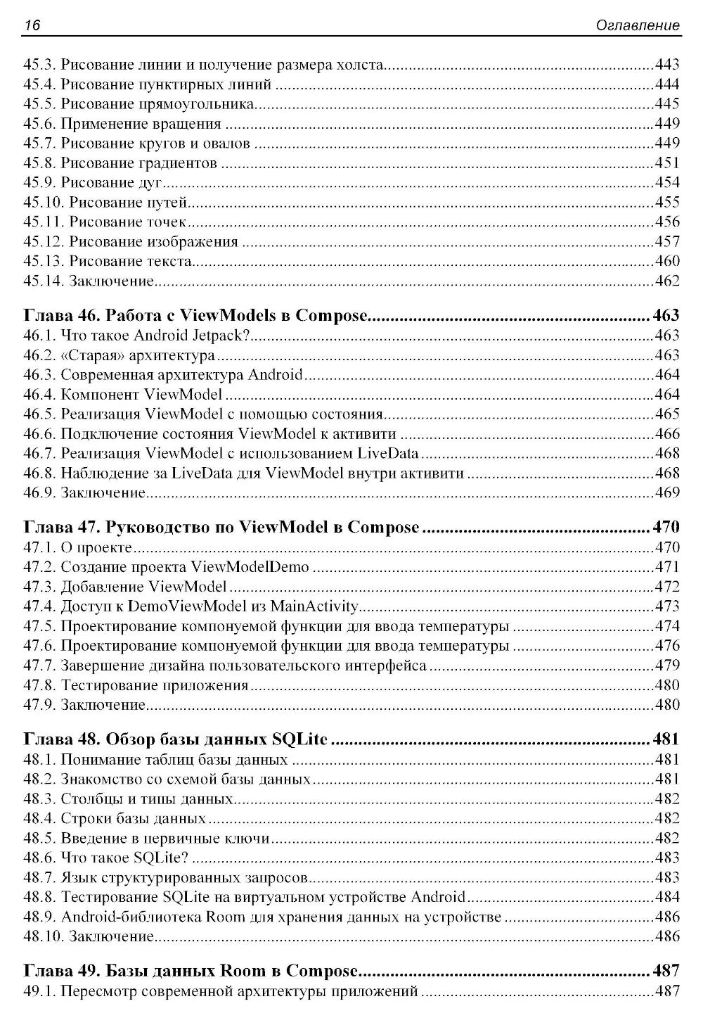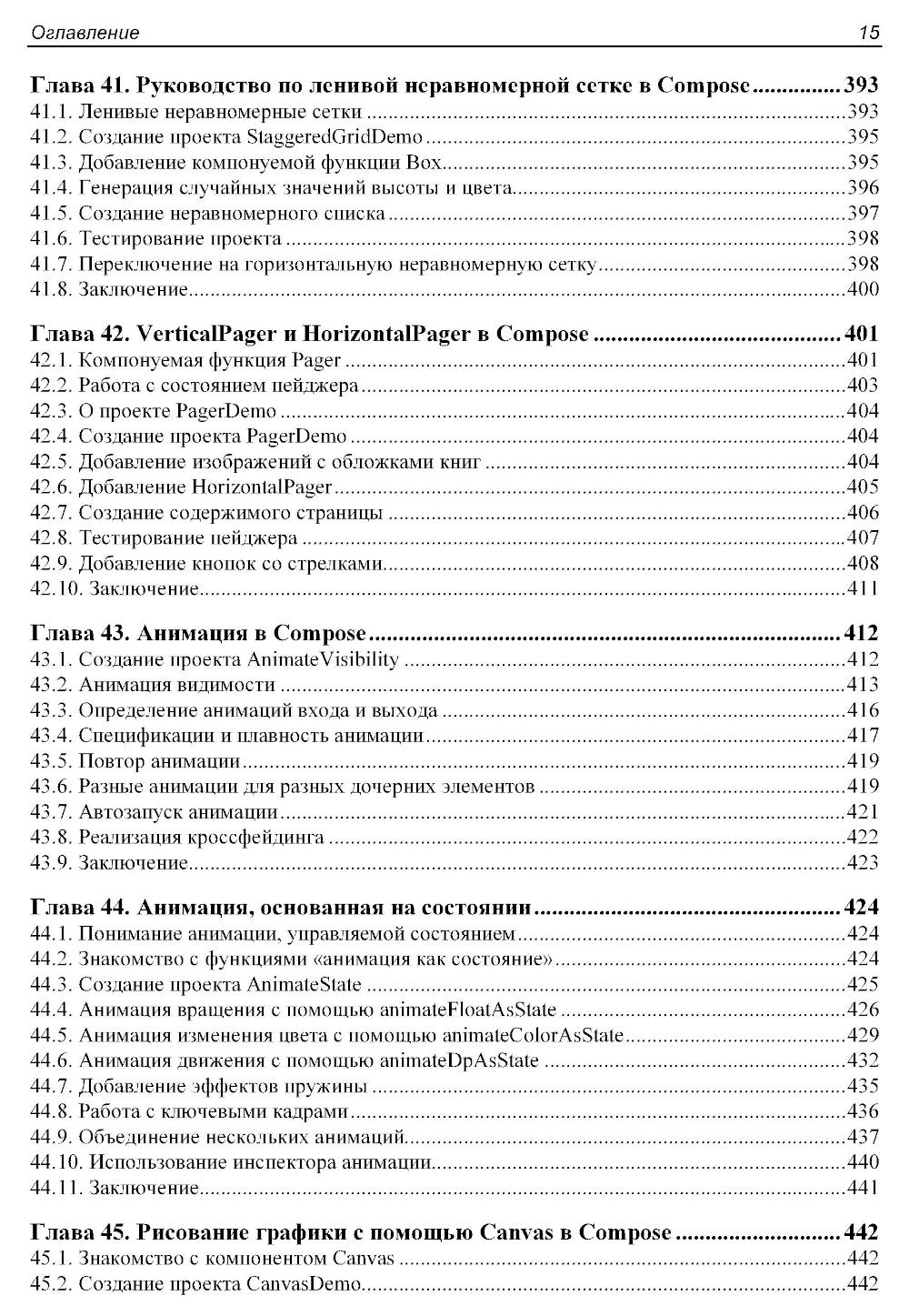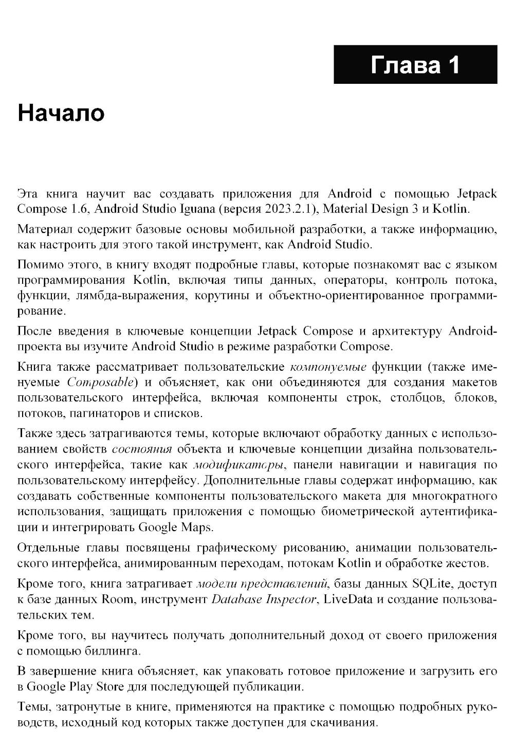 Книга посвящена практическому применению Jetpack Compose - современного декларативного фреймворка для создания пользовательских интерфейсов в Android-приложениях. Показаны основы языка Kotlin, от базовых конструкций до сопрограмм и объектно-ориентированного программирования. Рассматриваются ключевые концепции Compose 1.6, включая построение пользовательских интерфейсов с помощью Composable-функций, управление состоянием, навигация, анимационные эффекты, и архитектура приложений. Отдельное внимание уделено работе с базами данных SQLite и библиотекой Room, биометрической аутентификации, встроенным покупкам, использованию карт Google Maps и публикации приложений в Google Play. В книге представлены практические примеры и подробные пошаговые инструкции по работе в Android Studio Iguana и использованию возможностей Material Design 3.| Издательство | АЛИСТ |