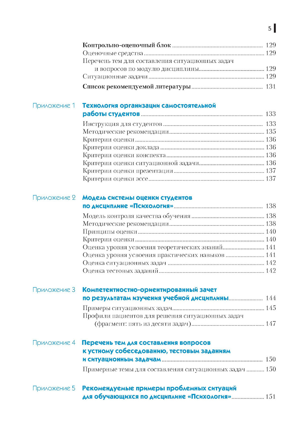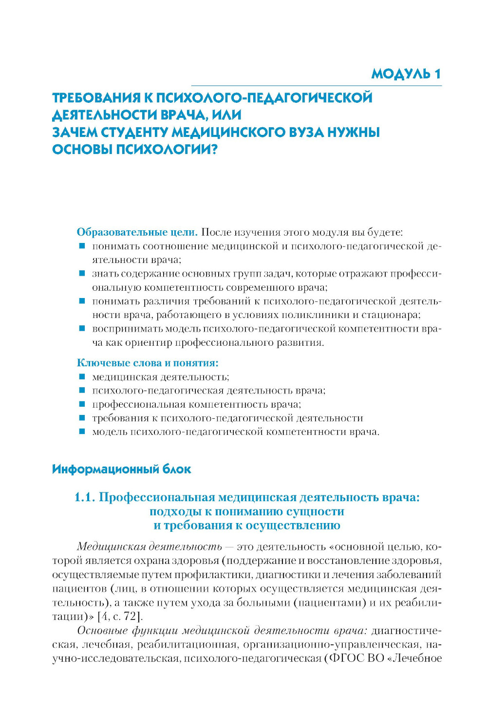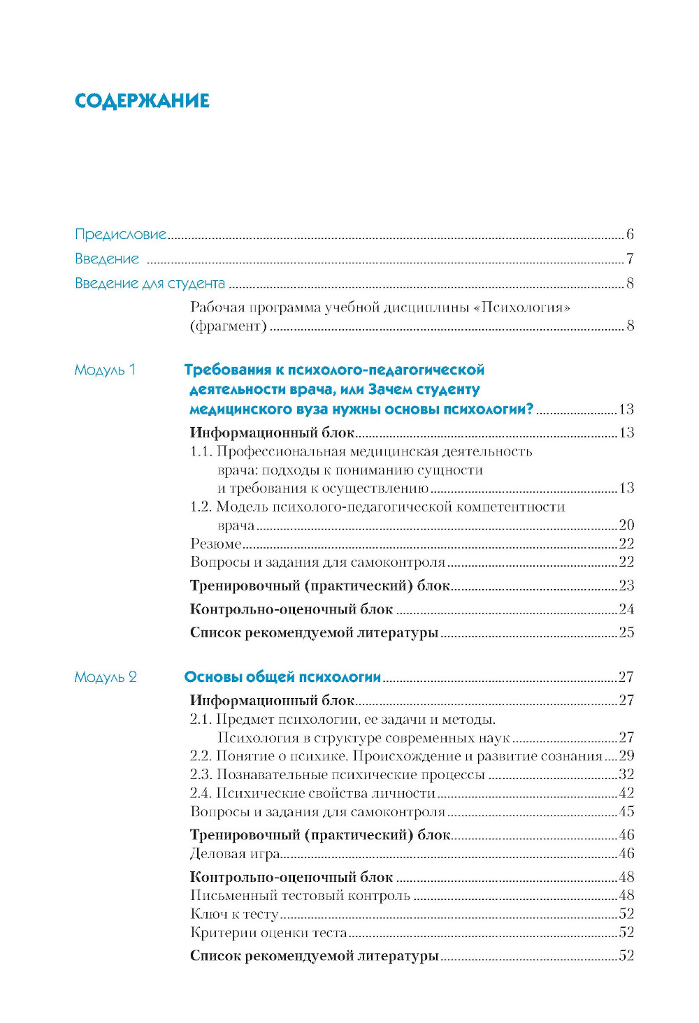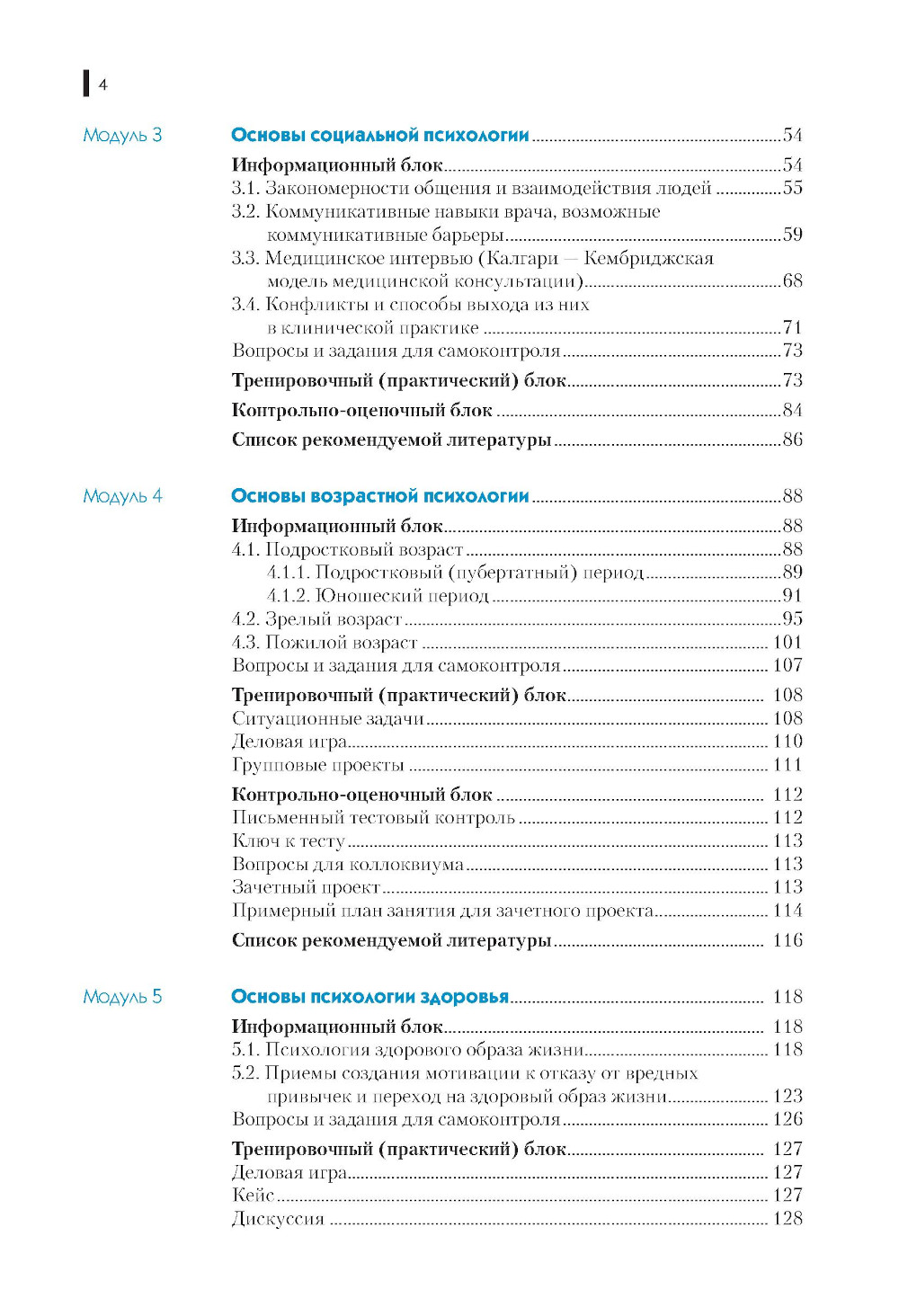 Содержит пять модулей: требования к психолого-педагогической деятельности врача; основы общей психологии; основы социальной психологии; основы возрастной психологии; основы психологии здоровья. Каждый модуль включает в себя информационный, тренировочный (практический) и контрольно-оценочный блоки, а также вопросы для самоконтроля и списки рекомендуемой литературы. Материал, в том числе ситуационные задачи, темы для проектов и рефератов, может быть использован в обучении ординаторов и врачей. Соответствует ФГОС ВО последнего поколения. Для студентов бакалавриата и специалитета медицинских вузов, изучающих дисциплину «Психология».| Издательство | КноРус |