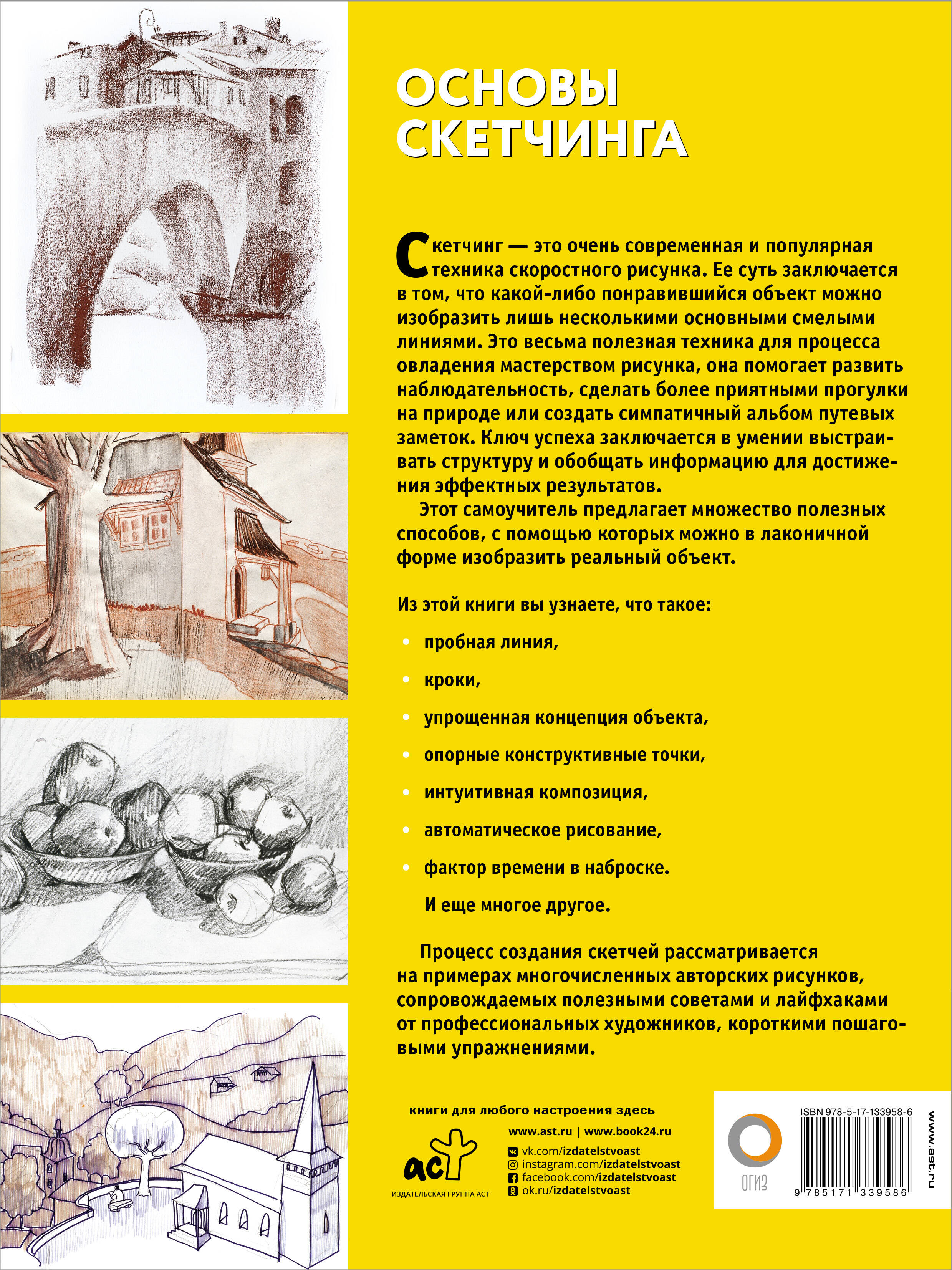 Скетчинг - это очень современная и популярная техника скоростного рисунка. Она позволяет выполнять быстрые рисунки, отражая композицию и основные идеи, передавать эмоции и атмосферу. Какой-либо понравившийся объект можно изобразить лишь несколькими основными смелыми линиями. Этой техникой может овладеть каждый - многие художники и иллюстраторы таким способом создают настоящие произведения искусства. Это весьма полезная техника для процесса овладения мастерством рисунка, она помогает развить наблюдательность, сделать более приятными прогулки на природе или создать симпатичный альбом путевых заметок. Ключ успеха заключается в умении выстраивать структуру и обобщать информацию для достижения эффектных результатов. Этот самоучитель предлагает множество полезных способов, с помощью которых можно в лаконичной форме изобразить реальный объект. Из этой книги вы узнаете что такое: • пробная линия, • кроки, • упрощенная концепция объекта, • опорные конструктивные точки, • интуитивная композиция, • автоматическое рисование, • фактор времени в наброске. И еще многое другое. Процесс создания скетчей рассматривается на примерах многочисленных авторских рисунков, сопровождаемых полезными советами и лайфхаками от профессиональных художников, короткими пошаговыми упражнениями.| Издательство | Издательство "АСТ" |