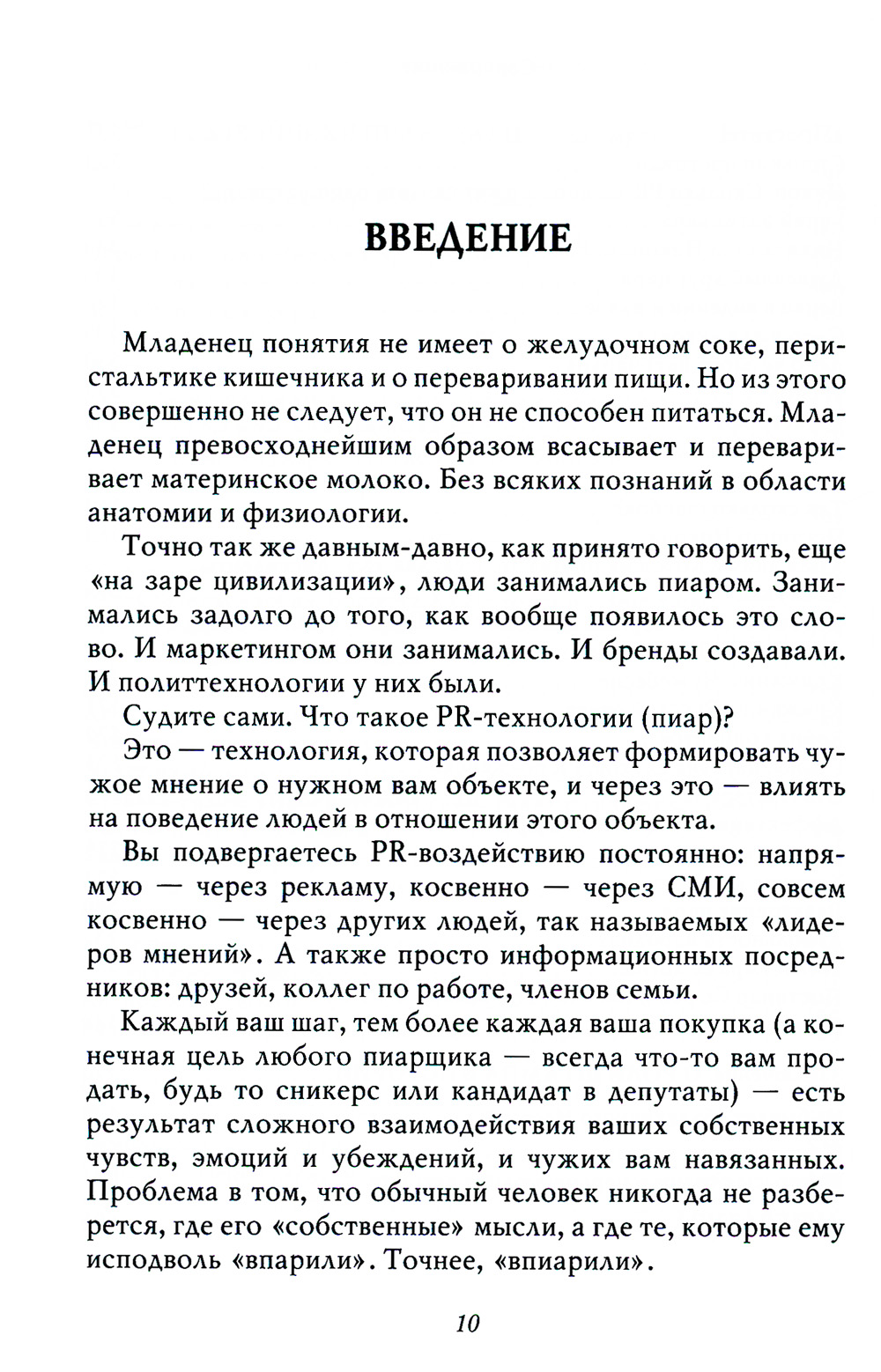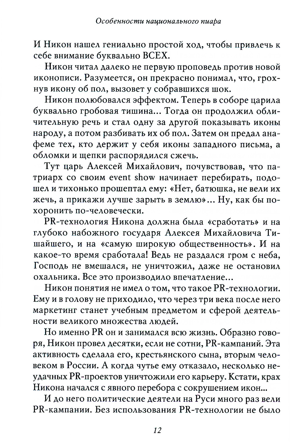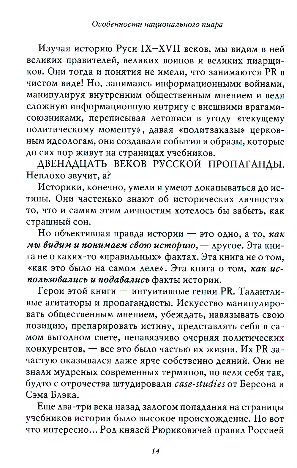 Каждый ваш шаг, тем более каждая ваша покупка (а конечная цель любого РRщика - всегда что-то вам продать, будь то сникерс или кандидат в депутаты) - есть результат сложного взаимодействия ваших собственных чувств, эмоций и убеждений и чужих, вам навязанных. Проблема в том, что обычный человек никогда не разберется, где его «собственные» мысли, а где те, которые ему исподволь «впарили». Точнее, «впиарили». Прямой интерес любой власти - заставить вас как избирателя и налогоплательщика вести себя так, как нужно ей, этой самой власти. Притом желательно, чтобы вы искренне полагали, будто ваше поведение - не есть нечто навязанное вам властной корпорацией, а ваш собственный свободный выбор... А при чем здесь русская история? Искусство управления общественными коммуникациями существовало всегда, и история дает его превосходные образцы - от Владимира Мономаха до Иосифа Сталина. Интуитивные гении PR - государственные мужи, первые профессионалы - PR-наемники (они появились еще в XII веке), классические избирательные кампании в Средние века с полным набором современных политтехнологий, оригинальный креатив - всего этого было вдоволь за нашу историю. Русь IX-XVII веков - эпоха великих правителей, великих воинов и великих пиарщиков. Это не книга о том, «как все было на самом деле». Это книга о том, как использовались и подавались факты истории. Это PRaвдивaя история Руси.| Издательство | Просвещение-Союз |