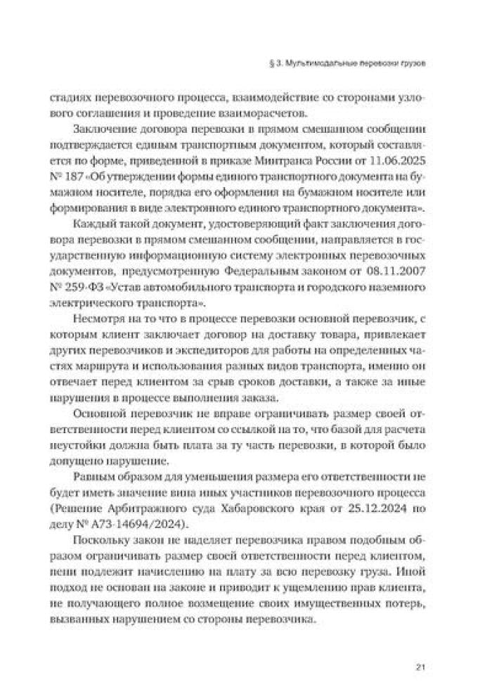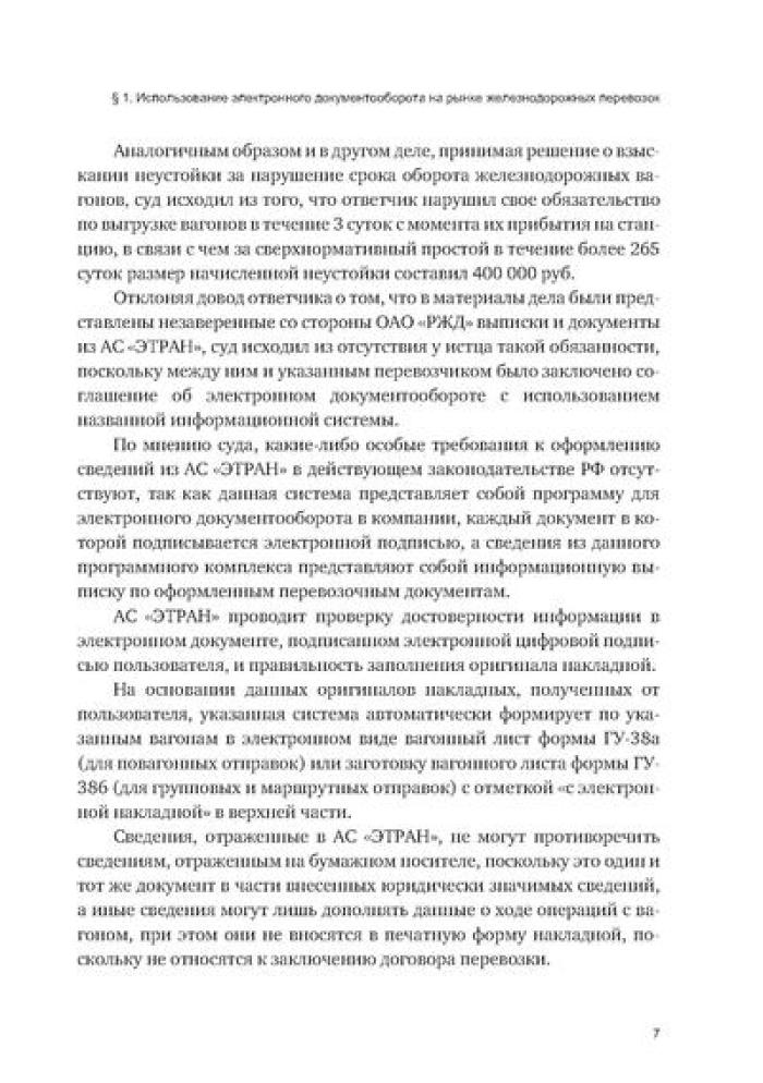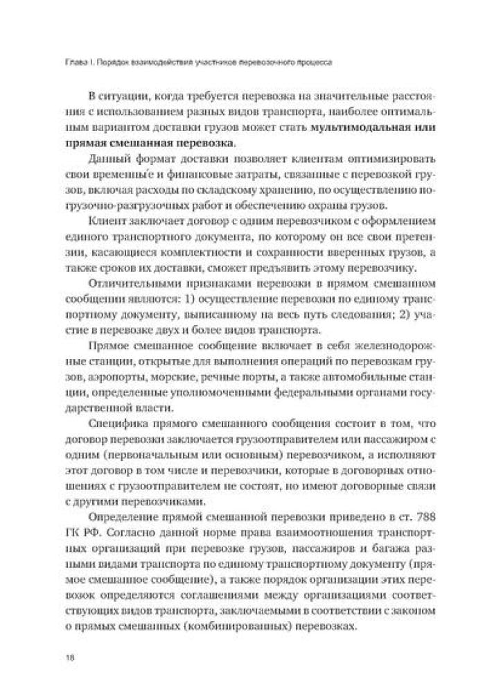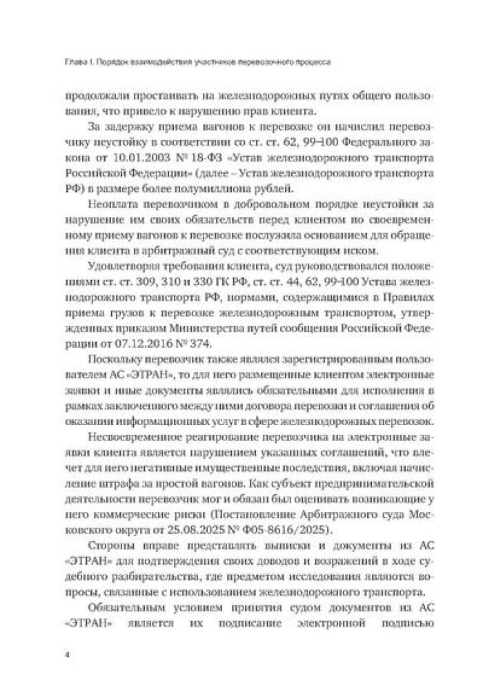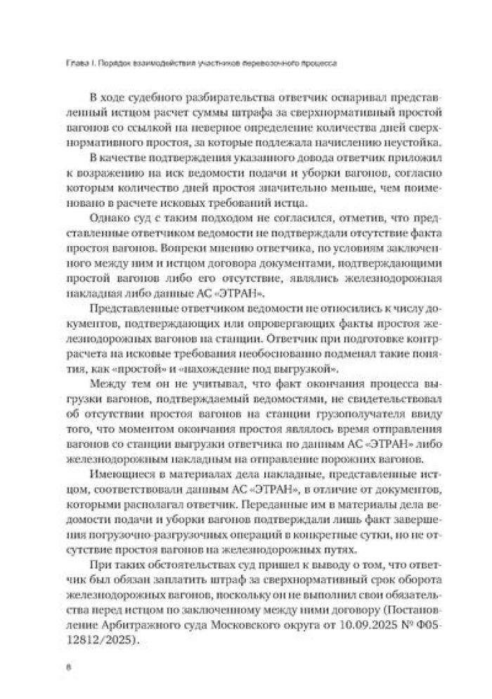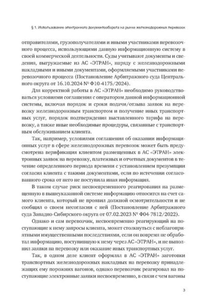 Железнодорожный транспорт является одним из ключевых способов перевозки пассажиров, грузов и грузобагажа. Среди его главных преимуществ в сравнении с иными видами отечественного транспорта можно выделить безопасность, скорость и комфорт, независимость от погодных условий, а также возможность транспортировки крупнотоннажных грузов на дальние расстояния. Несмотря на детальную нормативно-правовую регламентацию отношений, складывающихся на рынке железнодорожных перевозок, а также наличие значительной и в целом достаточно единообразной судебной практики, многие вопросы остаются до сих пор неясными. Первая глава посвящена порядку взаимодействия участников перевозочного процесса, включая использование электронного документооборота на рынке железнодорожных перевозок, правовой режим денег на едином лицевом счете, открытом у перевозчика, и особенности осуществления мультимодальных перевозок грузов. Во второй главе данной книги исследуются отдельные проблемы ответственности перевозчика перед клиентом, а именно: возмещение убытков, причиненных задержкой поездов, взыскание пени за просрочку доставки грузов, порожних вагонов и контейнеров, а также оспаривание уже упомянутого нами незаконного сбора за изменение места подачи /уборки вагона под погрузку /выгрузку. В третьей, завершающей главе мы коснулись важных вопросов, связанных с уклонением перевозчика от составления коммерческого акта, проанализировали досудебный порядок урегулирования споров с перевозчиком, а также соотношение общего и сокращенного сроков исковой давности. Настоящая книга ни в коем случае не претендует на роль комплексного исследования и задумывалась соавторами как дополнительное практическое пособие для изучения отдельных проблем, возникающих в рассматриваемой сфере правоприменения. Хотим выразить надежду, что наша работа будет полезна судьям, адвокатам, практикующим юристам, другим специалистам и всем тем, кто интересуется правовым регулированием рынка железнодорожных перевозок.| Издательство | Инфотропик Медиа |