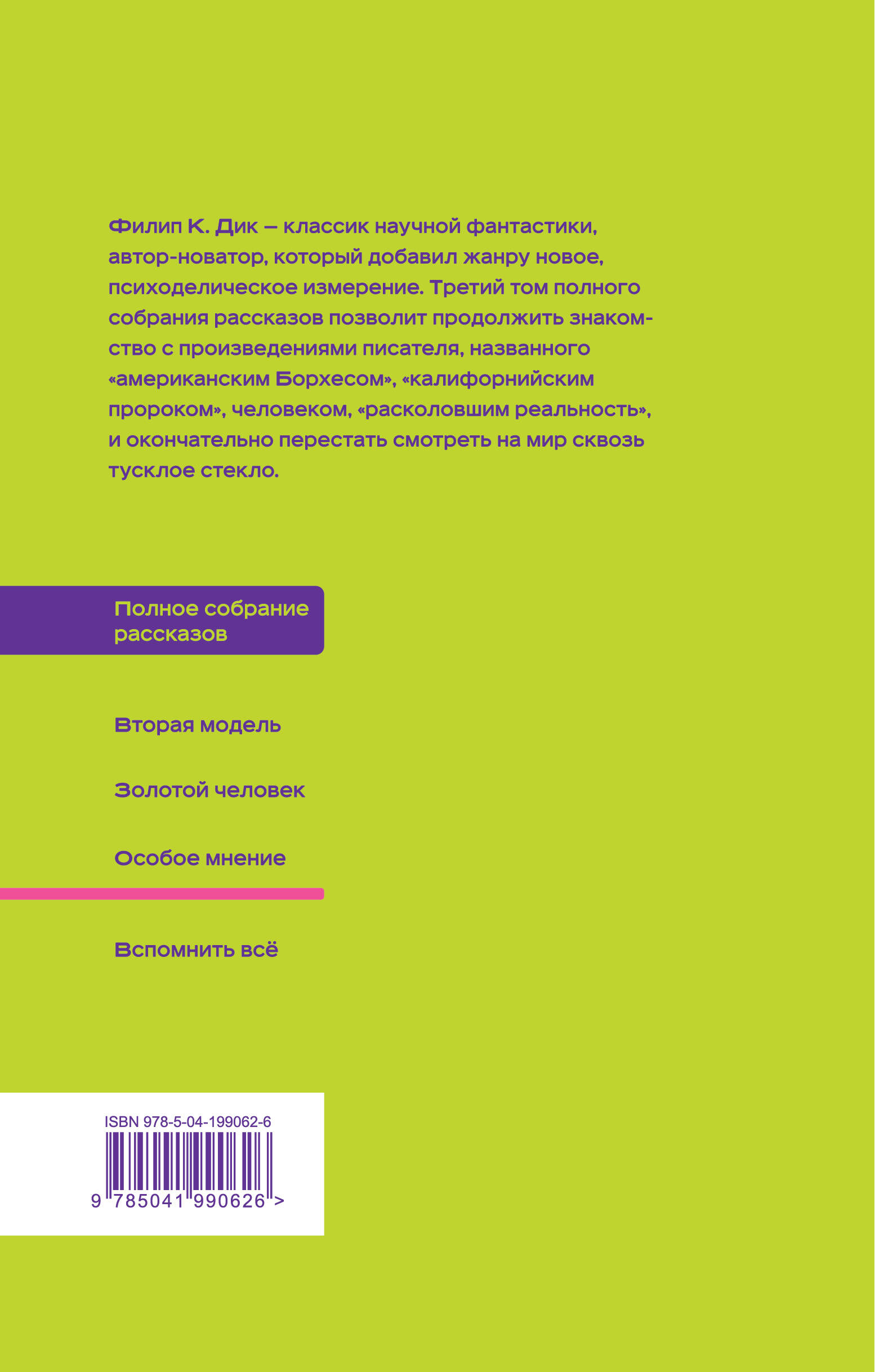 «Если главным мотивом всего моего творчества является вопрос, вправе ли мы считать вселенную реальной, и если да, то в каком смысле, следующим, вторым по важности мотивом станет сомнение: все ли из нас - люди?» - Филип К. Дик Филип К. Дик - классик научной фантастики, автор-новатор, который добавил жанру новое психоделическое измерение. Третий том полного собрания рассказов позволит продолжить знакомство с произведениями писателя, названного «американским Борхесом», «калифорнийским пророком», человеком, «расколовшим реальность», и окончательно перестать смотреть на мир сквозь тусклое стекло. Часть произведений сопровождаются авторскими комментариями. Специально для этого издания выполнен новый перевод. «Загляните в разум гения… Этот сборник рассказов великолепен, заставляет думать, забавен и, если честно, даже немного пугает»… «Дик с легкостью и спокойствием написал серьезную фантастику в популярной форме, и я не знаю, что может быть еще большей похвалой»… «Ни один другой писатель этого поколения не обладает такой мощной интеллектуальной силой. Она отпечатается не только в ваших воспоминаниях, но и в вашем воображении»… «Прекрасная дань уважения великому писателю-философу, который считал научную фантастику идеальной формой выражения своих идей»… - Goodreads