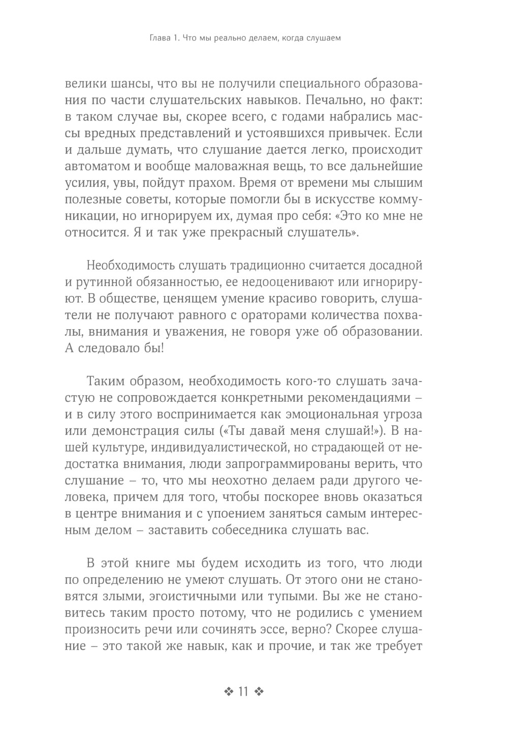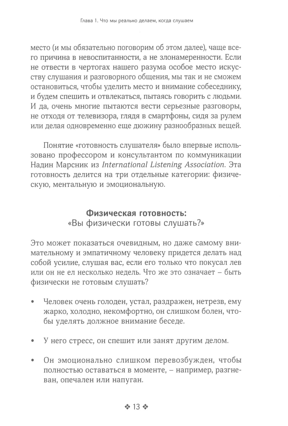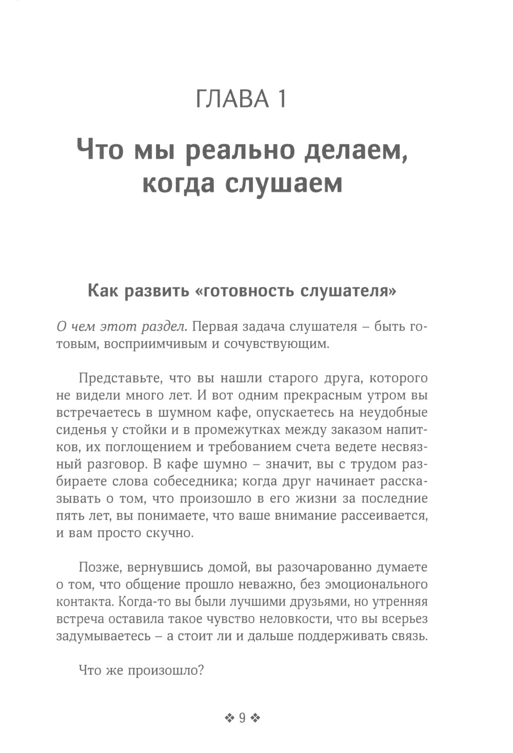 Главное в коммуникации - вовсе не то, что вы говорите. Главное -как вы молчите. Эмпатия и умение слушать... Вроде бы все просто, однако вы сами знаете, что большинство людей, с которыми вы встречаетесь каждый день, справляются с этим неважно. В чем же проблема? Осознанное слушание - это навык, лежащий в основе глубоких отношений. Перед вами книга о взаимоотношениях и о том, что ими движет, а именно, что позволяет проникать в людские сердца. Заставить человека поверить, что его видят и слышат, что он важен для вас, - значит открыть себе дорогу к его душе. Итак, пришло время заняться собой, выявить проблемы, касающиеся умения слушать и налаживать контакты, и взглянуть на старые и новые дружеские связи с точки зрения эмпатии. Это не так уж трудно, но и не легко. Умение слушать сродни телепатии. Ничто не произносится без причины! • Цель пауз в разговоре и как использовать молчание к своей выгоде. • Саботаж осознанного слушания вашим эго и как с этим бороться. • Четыре типа откликов, позволяющих человеку ощутить, что его точно видят и слышат. • Подтверждение значимости опыта и эмоций. • Искусство перефразирования и его влияние на степень доверия. • Грань между слушанием в своих интересах и слушанием ради понимания.| Издательство | Библос |