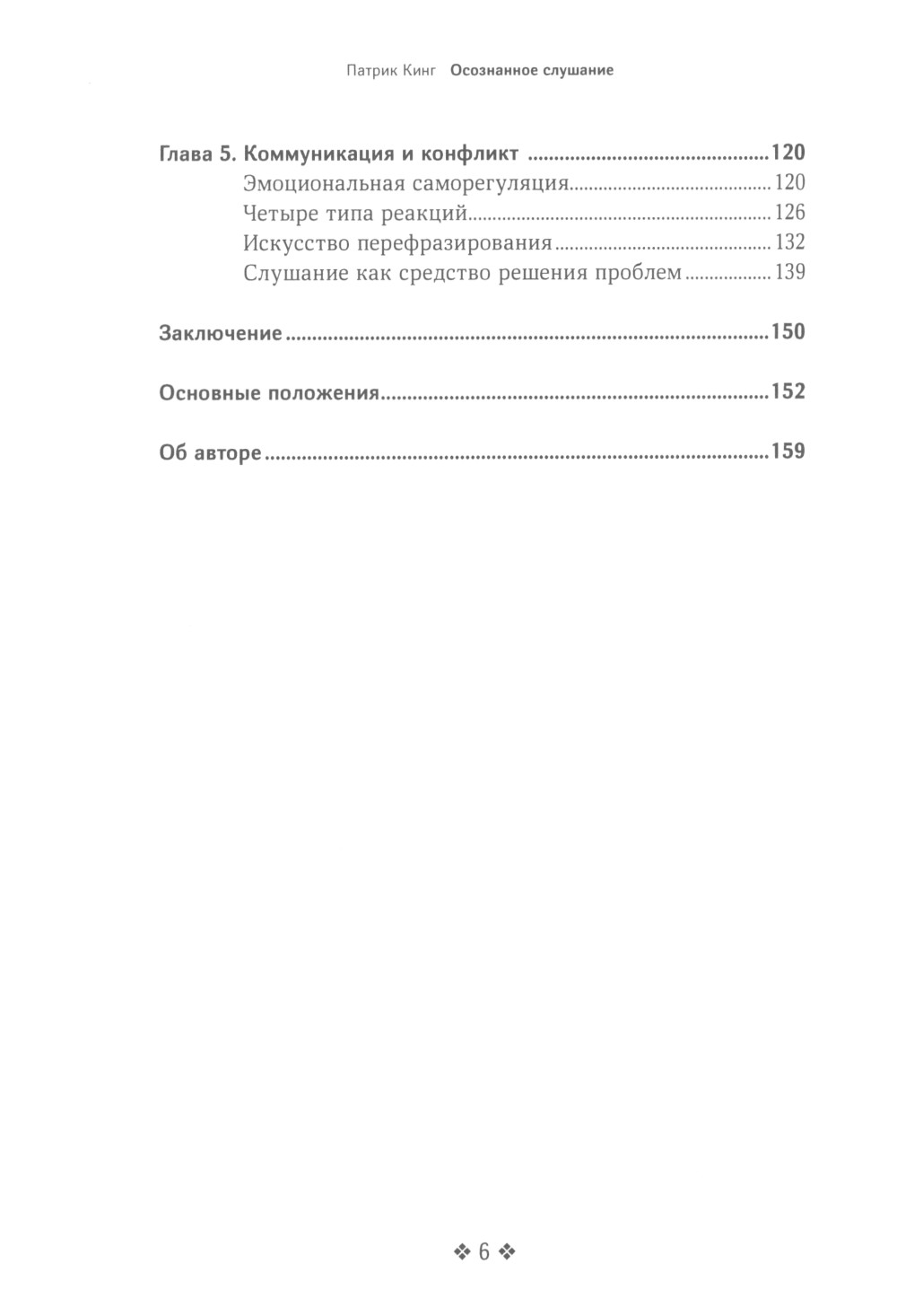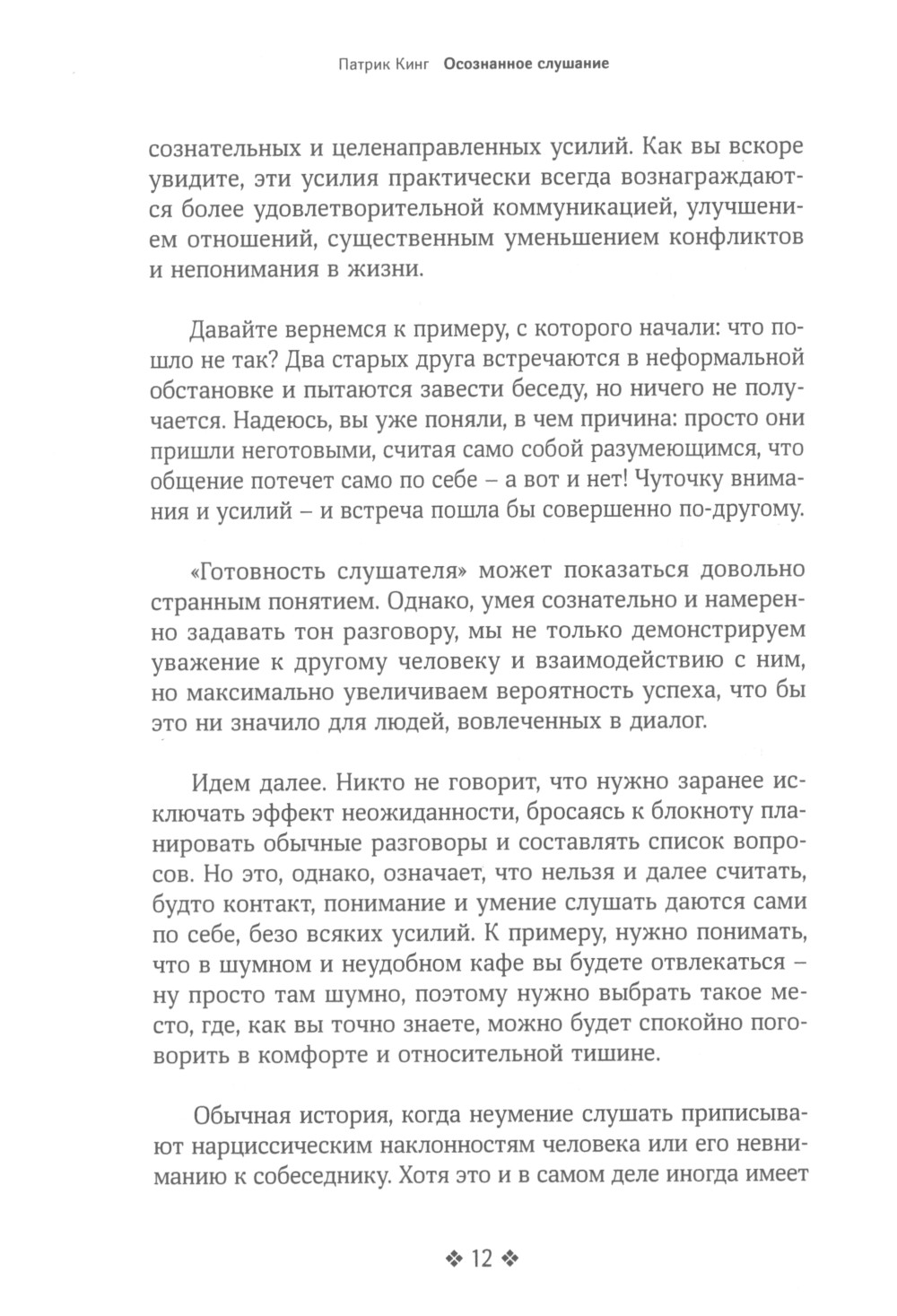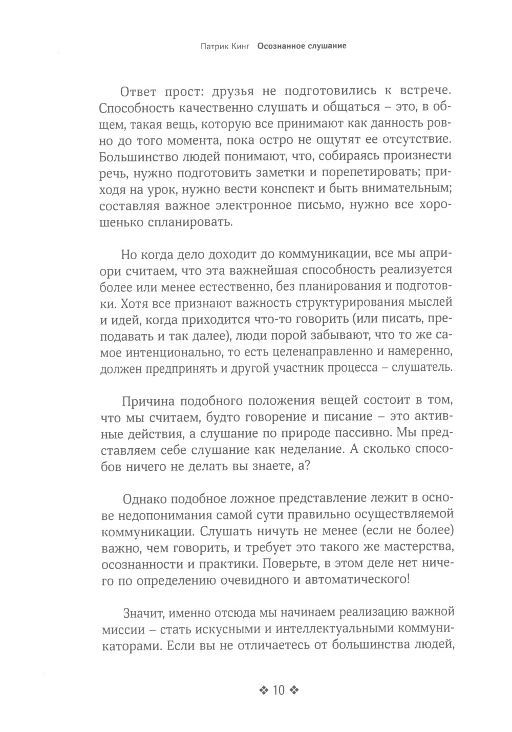Главное в коммуникации - вовсе не то, что вы говорите. Главное -как вы молчите. Эмпатия и умение слушать... Вроде бы все просто, однако вы сами знаете, что большинство людей, с которыми вы встречаетесь каждый день, справляются с этим неважно. В чем же проблема? Осознанное слушание - это навык, лежащий в основе глубоких отношений. Перед вами книга о взаимоотношениях и о том, что ими движет, а именно, что позволяет проникать в людские сердца. Заставить человека поверить, что его видят и слышат, что он важен для вас, - значит открыть себе дорогу к его душе. Итак, пришло время заняться собой, выявить проблемы, касающиеся умения слушать и налаживать контакты, и взглянуть на старые и новые дружеские связи с точки зрения эмпатии. Это не так уж трудно, но и не легко. Умение слушать сродни телепатии. Ничто не произносится без причины! • Цель пауз в разговоре и как использовать молчание к своей выгоде. • Саботаж осознанного слушания вашим эго и как с этим бороться. • Четыре типа откликов, позволяющих человеку ощутить, что его точно видят и слышат. • Подтверждение значимости опыта и эмоций. • Искусство перефразирования и его влияние на степень доверия. • Грань между слушанием в своих интересах и слушанием ради понимания.| Издательство | Библос |