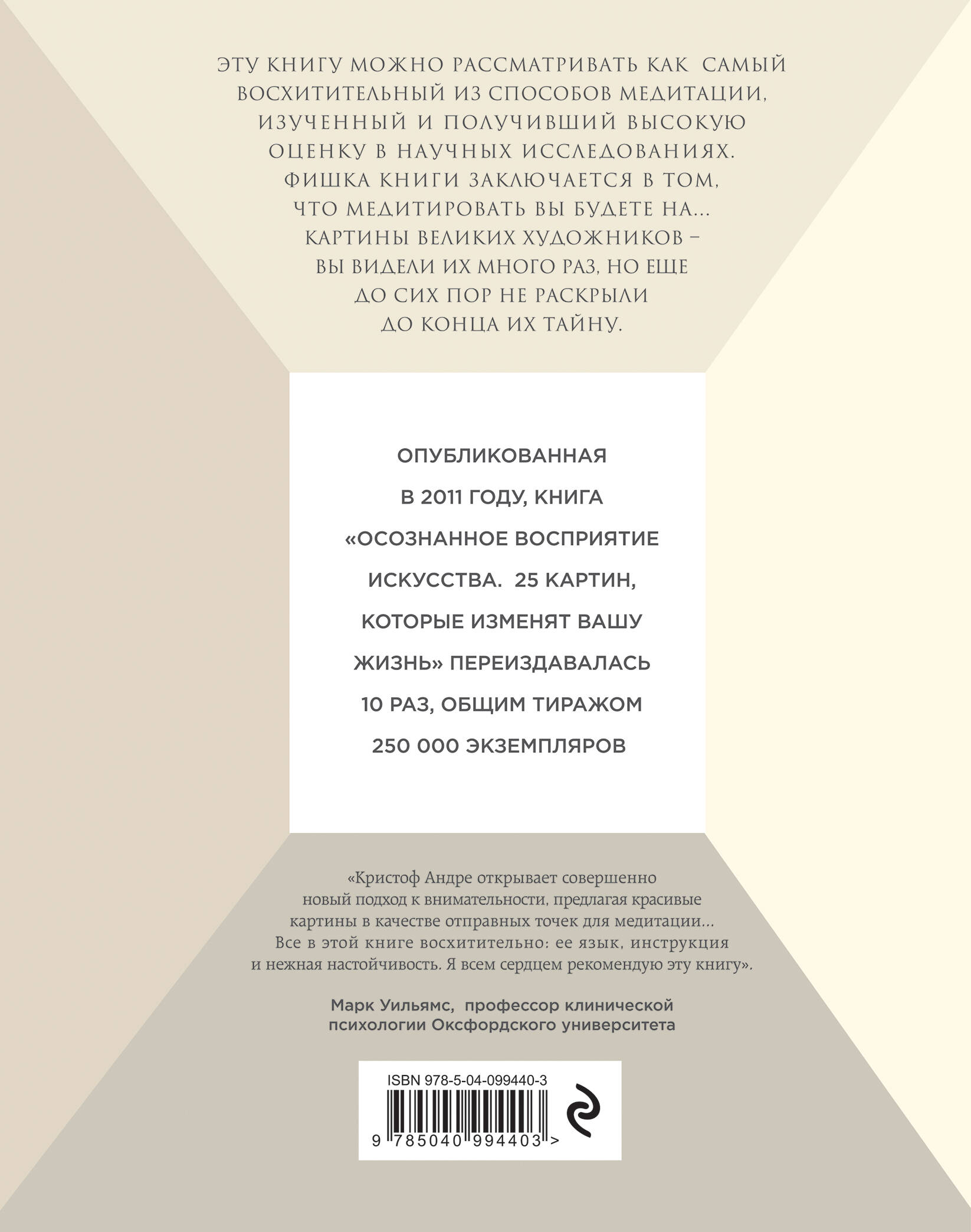 Автор - Кристоф Андре практикует медитацию многие годы. Он использует ее также и для лечения: в парижском госпитале Святой Анны он проводит сеансы медитации, чтобы помочь пациентам освободиться от страданий и наслаждаться своим существованием. Эту книгу можно рассматривать как самый восхитительный из способов медитации, изученный и получивший высокую оценку в научных исследованиях. Фишка книги заключается в том, что медитировать вы будете на… картины великих художников - вы видели их много раз, но еще не раскрыли до конца их тайну. Через 24 урока мы постигаем главное. Начиная с базовых приемов: как пользоваться дыханием, телом, сознанием настоящего момента; и заканчивая углубленной медитацией: как противостоять страданиям, стабилизировать эмоции, построить мир в уме и в сердце... Этот практический и поэтический учебник состоит из: Текстов для понимания Живописи для ощущения «Это произведение искусства само по себе и медитативная экскурсия по вашей скрытой силе». Джон Кабат-Зинн « Кристоф Андре открывает совершенно новый подход к внимательности, предлагая красивые картины в качестве отправных точек для медитации ... Все об этой книге восхитительно: ее язык, инструкция и нежная настойчивость. Я всем сердцем рекомендую эту книгу ». - Марк Уильямс, профессор клинической психологии Оксфордского университета Опубликованная в сентябре 2011 года, книга «Искусство и медитация: 24 урока, которые преображают жизнь» переиздавалась 10 раз, общим тиражом 250000 экземпляров. "Осознанное восприятие искусства" - суперобложка к книге "Искусство и медитация: 24 урока, которые день за днем преображают жизнь"| Издательство | ООО "Издательство "Эксмо" |