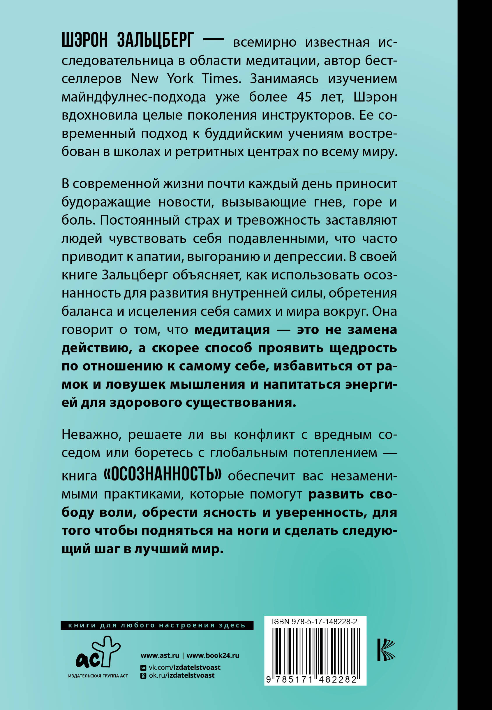 Шэрон Зальцберг - всемирно известная исследовательница в области медитации, автор бестселлеров New York Times. Занимаясь изучением майндфулнес-подхода уже более 45 лет, Шэрон вдохновила целые поколения инструкторов. Ее современный подход к буддийским учениям востребован в школах и ретритных центрах по всему миру. В современной жизни почти каждый день приносит будоражащие новости, вызывающие гнев, горе и боль. Постоянный страх и тревожность заставляют людей чувствовать себя подавленными, что часто приводит к апатии, выгоранию и депрессии. В своей книге Зальцберг объясняет, как использовать осознанность для развития внутренней силы, обретения баланса и исцеления себя самих и мира вокруг. Она говорит о том, что медитация - это не замена действию, а скорее способ проявить щедрость по отношению к самому себе, избавиться от рамок и ловушек мышления и напитаться энергией для здорового существования. Неважно, решаете ли вы конфликт с вредным соседом или боретесь с глобальным потеплением - книга "Осознанность" обеспечит вас незаменимыми практиками, которые помогут развить свободу воли, обрести ясность и уверенность, для того чтобы подняться на ноги и сделать следующий шаг в лучший мир.| Издательство | Издательство "АСТ" |