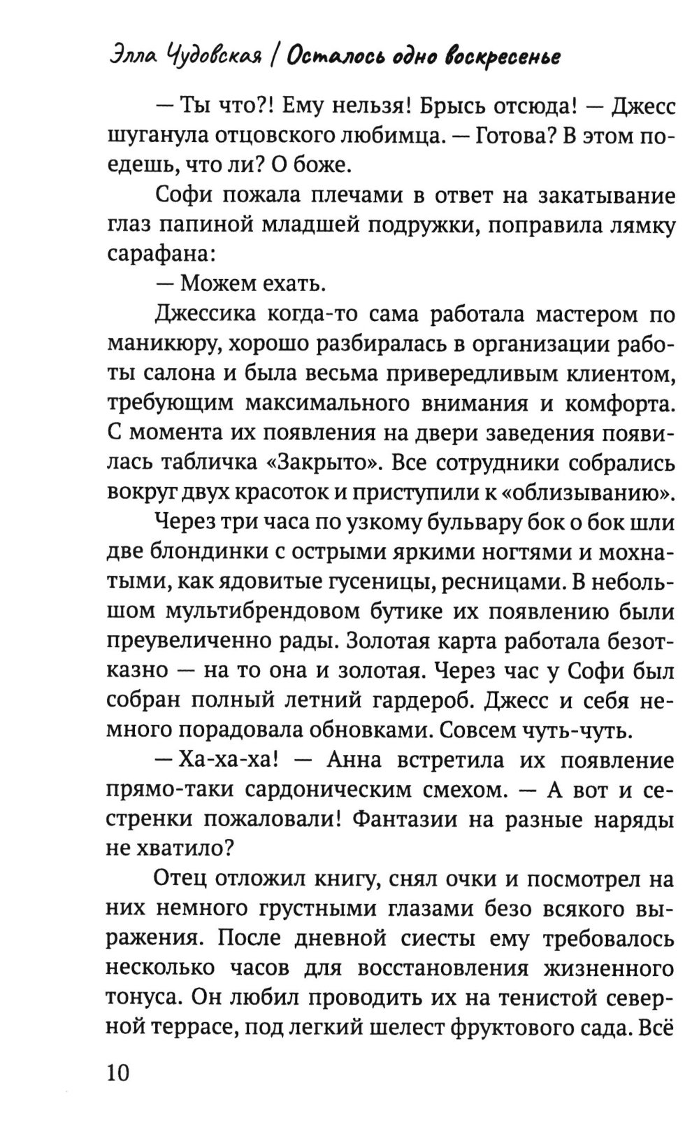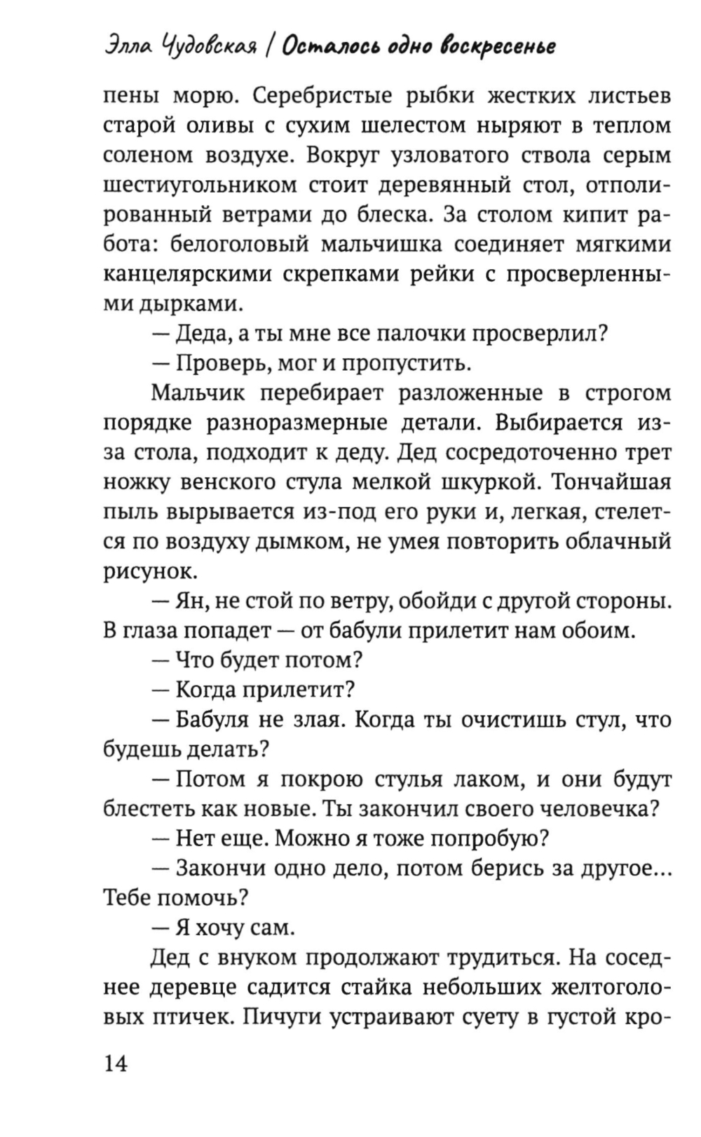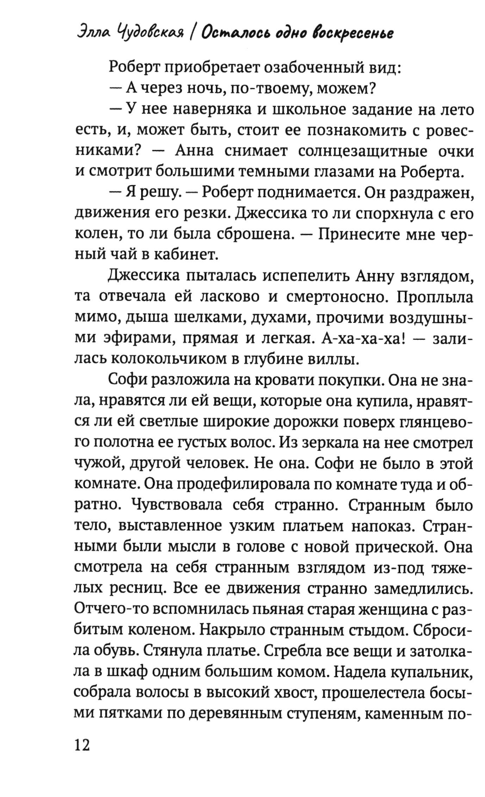 В декорациях острова, на фоне размеренной жизни семьи Макара, появляется девочка-подросток. Она отмечает течение времени воскресеньями, совершенно потеряна в странном взрослом мире полуправд и, кажется, никому не нужна. Единственный близкий человек ушёл, лучшая подруга отправила её в бан, мать занята своей жизнью, а с отцом ещё только предстоит познакомиться. Она хочет понравиться. Хочет спрятаться. Пытается не быть как все. Играет. Сквозные герои и место развития событий объединяют третью книгу автора с двумя предыдущими - «Синева» и «Совсем немного дождя». История продолжается. Стало ли ошибкой приобретение дома-мечты у самого синего моря? Кто заглядывает в окна по ночам? Что случится, когда придёт Зефир? Способны ли меняться взрослые? Кем предстанет Софи в последнее воскресенье лета?| Издательство | Рипол Классик |