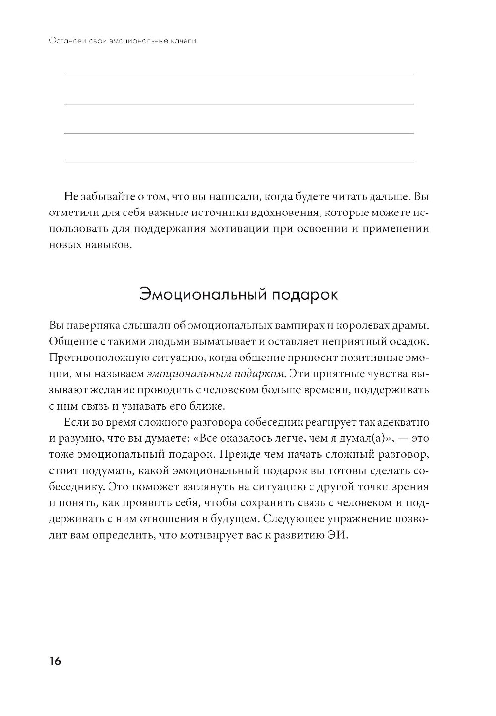 Эмоциональный интеллект не просто модный термин, а ключевой навык, который определяет, насколько успешно мы строим отношения, преодолеваем конфликты и достигаем целей. Человек, умеющий понимать и регулировать свои эмоции, лучше взаимодействует с окружающими и быстрее адаптируется к сложным ситуациям. Психологи и специалисты в области когнитивно-поведенческой терапии Стефани Кателла и Мэтью Маккей разработали практическое руководство, помогающее развить эмоциональный интеллект и применять его в повседневной жизни. В дневнике собраны проверенные методы развития эмоциональной эффективности, терапии принятия и ответственности. Читатели освоят техники эмоционального серфинга, ассертивности, эмпатии, синтонности и управления конфликтами, а также познакомятся с методом экспозиции и рядом копинг-стратегий, чтобы регулировать свои эмоции, слышать других и чувствовать себя уверенно в любой ситуации.