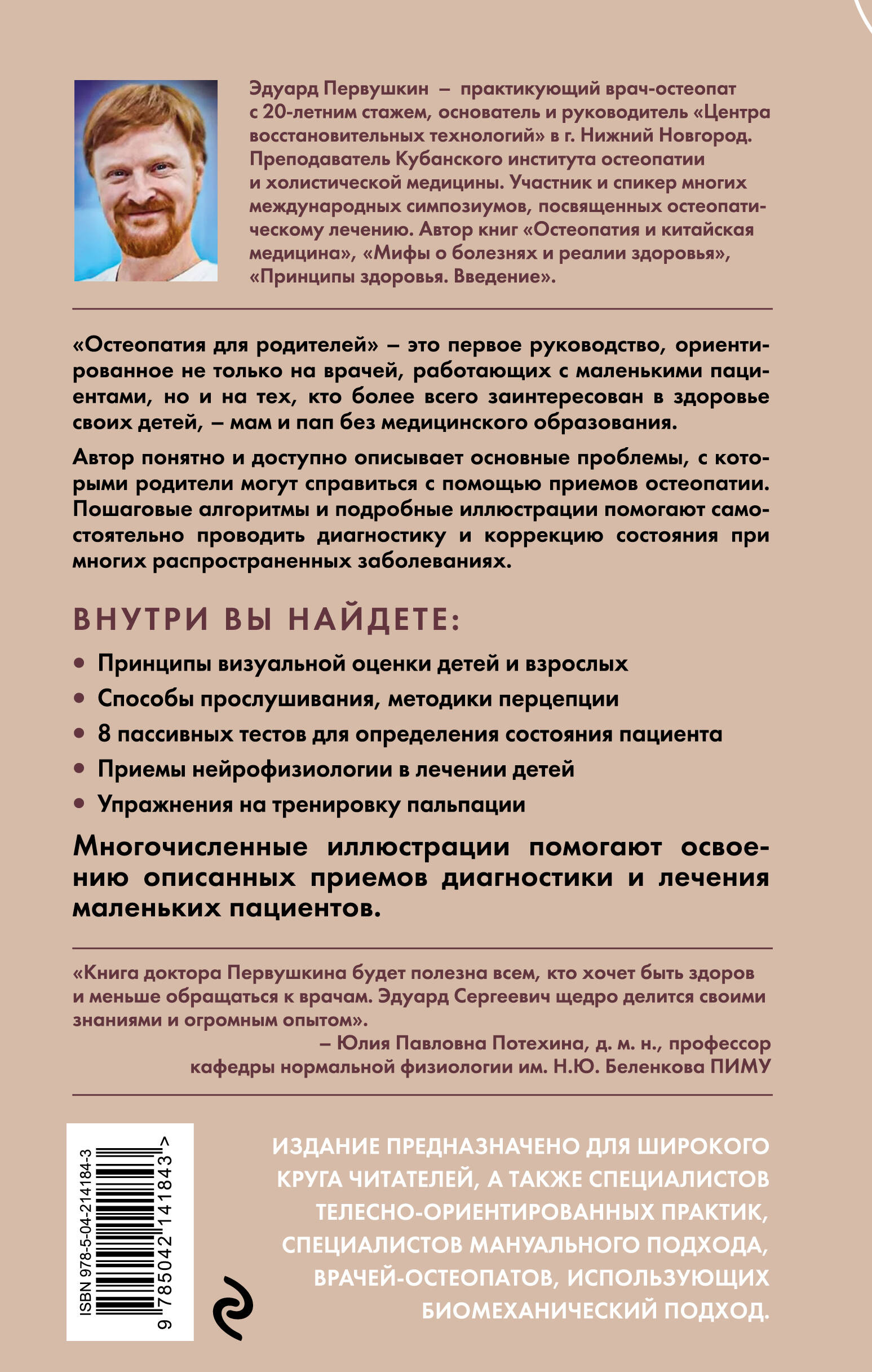 В книге автор развеивает мифы вокруг остеопатии, разбирает теоретические основы, а также дает пошаговый алгоритм, как восстановить свое здоровье и здоровье своих детей собственными руками. Подробно рассмотрены вопросы остеопатической диагностики, пальпации и перцепции. Описаны основные остеопатические техники воздействия. Особое внимание уделено самоподготовке специалиста. Многочисленные иллюстрации помогают закреплять знания визуально. Также в книге читатели найдут QR-коды на видеоиллюстрации тестов и мануальных техник. Издание предназначено для широкого круга читателей, а также специалистов телесно-ориентированных практик, специалистов мануального подхода, врачей-остеопатов, использующих биомеханический подход.| Издательство | ООО "Издательство "Эксмо" |