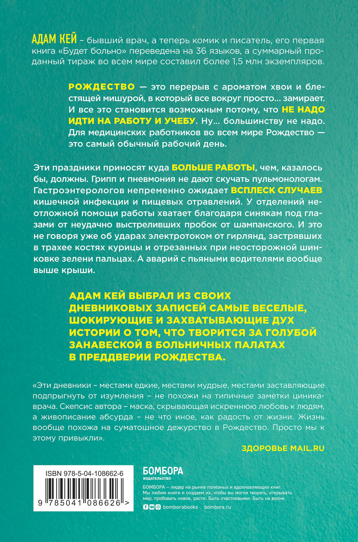 Адам Кей выбрал из своих дневниковых записей самые веселые, шокирующие и захватывающие дух истории о том, что творится за голубой занавеской в больничных палатах в преддверии Рождества. В Рождество пациенты никуда не деваются, а «Скорые» по-прежнему выстраиваются в очередь у отделения неотложной помощи, словно фуры на границе. И медработники не дремлют. Их некому заменить,чтобы они могли провести немного времени с семьей. Вместо отдыха миллионы врачей и медсестер распределяют между собой смены и отрабатывают длинные дежурства, чтобы все остальные непременно пережили этот праздник в целости и сохранности. «Эти дневники - местами едкие, местами мудрые, местами заставляющие подпрыгнуть от изумления - не похожи на типичные заметки циника-врача. Скепсис автора - маска, скрывающая искреннюю любовь к людям, а живописание абсурда - не что иное, как радость от жизни. Жизнь вообще похожа на суматошное дежурство в Рождество. Просто мы к этому привыкли». - ЗДОРОВЬЕ MAIL.RU «Книга прекрасная: очень смешная и при этом необыкновенно трогательная, невероятно правдивая, описывающая истинную обратную и невидимую сторону работы врачей! Множество коротких историй, над которыми можно и посмеяться в голос, и глубоко задуматься, и даже неожиданно для себя всплакнуть. Очень рекомендую всем, кто одинаково как близок, так и далек от медицины!» - АНАСТАСИЯ ПЕВЦОВА, врач-акушер-гинеколог, врач-методист «Дежурство по больнице на Рождество или Новый год заставляет любые события - приятные и неприятные - воспринимать особенно остро. Книга Адама Кея, отдежурившего в рождественские ночи все шесть лет его врачебной карьеры, посвящена именно праздничным сменам. С присущим ему своеобразным юмором автор описывает и забавные случаи, и переживания, связанные с этой работой, - остаться равнодушным невозможно!» - МИХАИЛ ТАРДОВ, доктор медицинских наук, невролог, ведущий сотрудник НИКИО