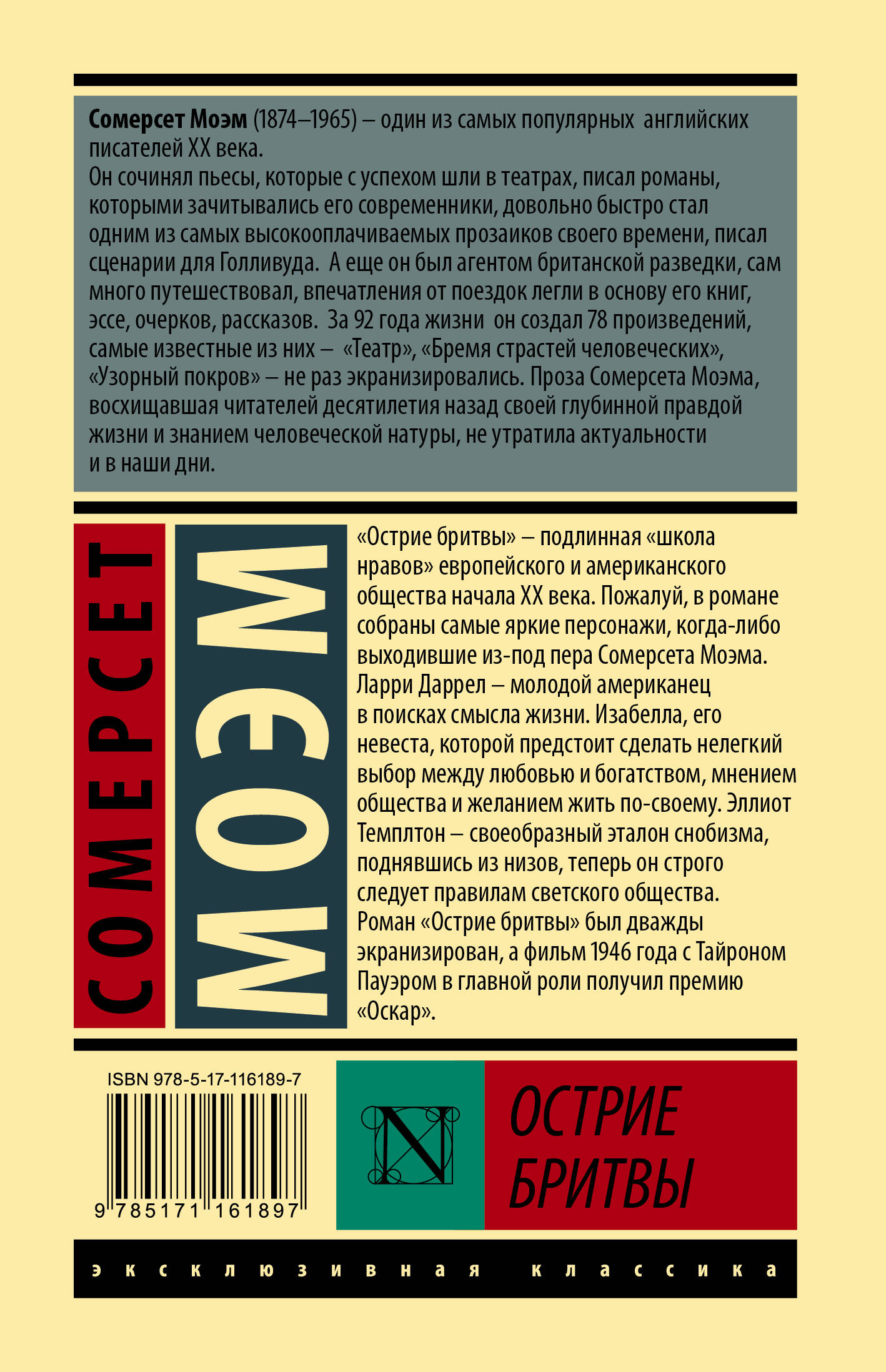 "Острие бритвы" - подлинная "школа нравов" европейского и американского общества начала XX века. Пожалуй, в романе собраны самые яркие персонажи, когда-либо выходившие из-под пера Сомерсета Моэма. Ларри Даррел - молодой американец в поисках смысла жизни. Изабелла, его невеста, которой предстоит сделать нелегкий выбор между любовью и богатством, мнением общества и желанием жить по-своему. Эллиот Темплтон - своеобразный эталон снобизма, поднявшись из низов, теперь он строго следует правилам светского общества. Роман "Острие бритвы" был дважды экранизирован, а фильм 1946 года с Тайроном Пауэром в главной роли получил премию "Оскар".| Издательство | Издательство "АСТ" |