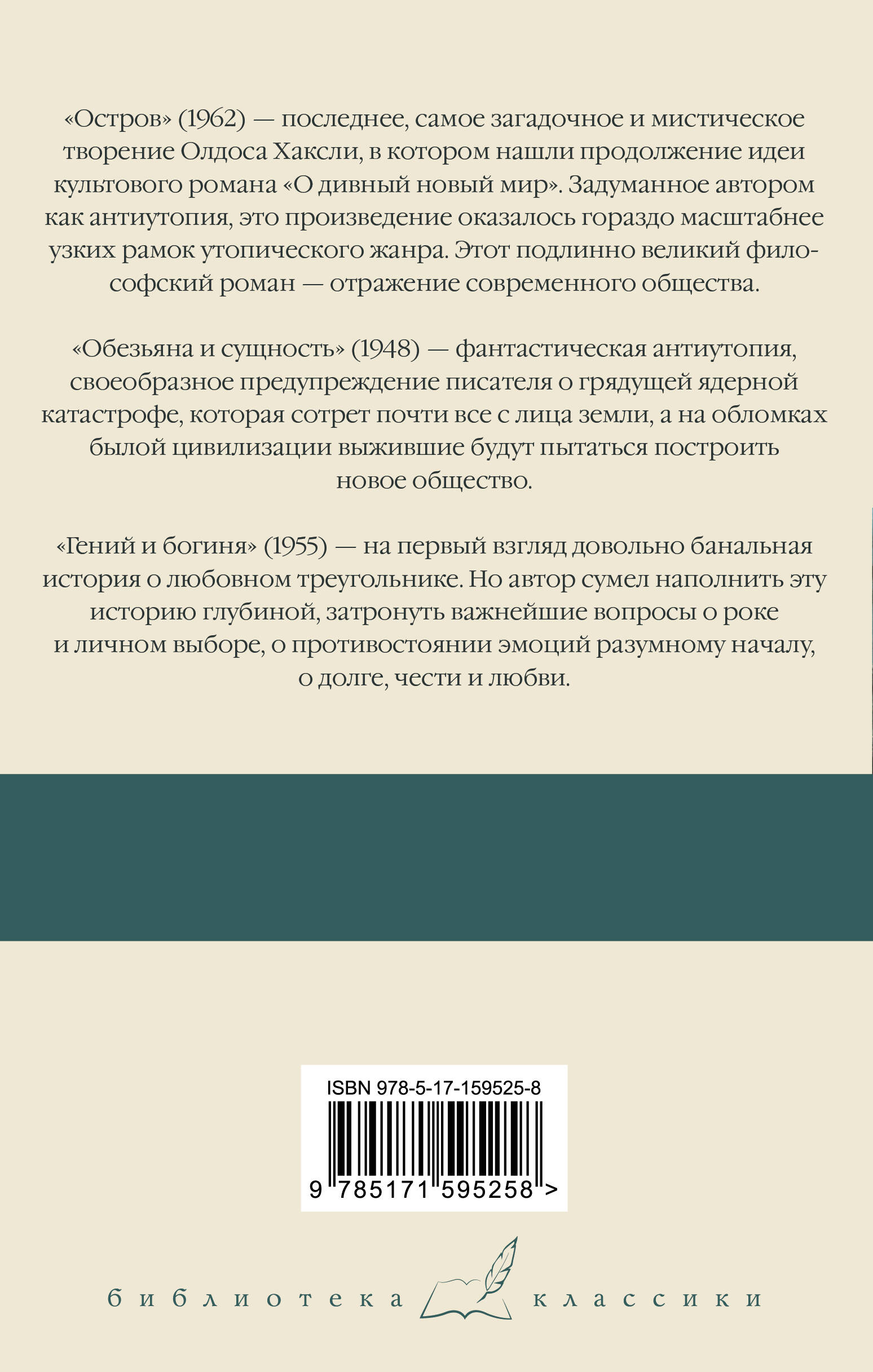 "Остров" (1962) - последнее, самое загадочное и мистическое творение Олдоса Хаксли, в котором нашли продолжение идеи культового романа "О дивный новый мир". Задуманное автором как антиутопия, это произведение оказалось гораздо масштабнее узких рамок утопического жанра. Этот подлинно великий философский роман - отражение современного общества. "Обезьяна и сущность" (1948) - фантастическая антиутопия, своеобразное предупреждение писателя о грядущей ядерной катастрофе, которая сотрет почти все с лица земли, а на обломках былой цивилизации выжившие будут пытаться построить новое общество. "Гений и богиня" (1955) - на первый взгляд довольно банальная история о любовном треугольнике. Но автор сумел наполнить эту историю глубиной, затронуть важнейшие вопросы о роке и личном выборе, о противостоянии эмоций разумному началу, о долге, чести и любви.| Издательство | ИЗДАТЕЛЬСТВО "АСТ" |