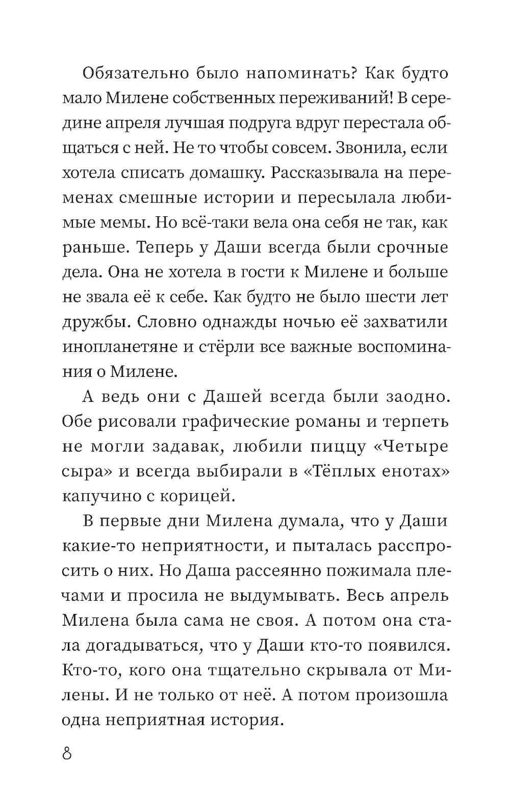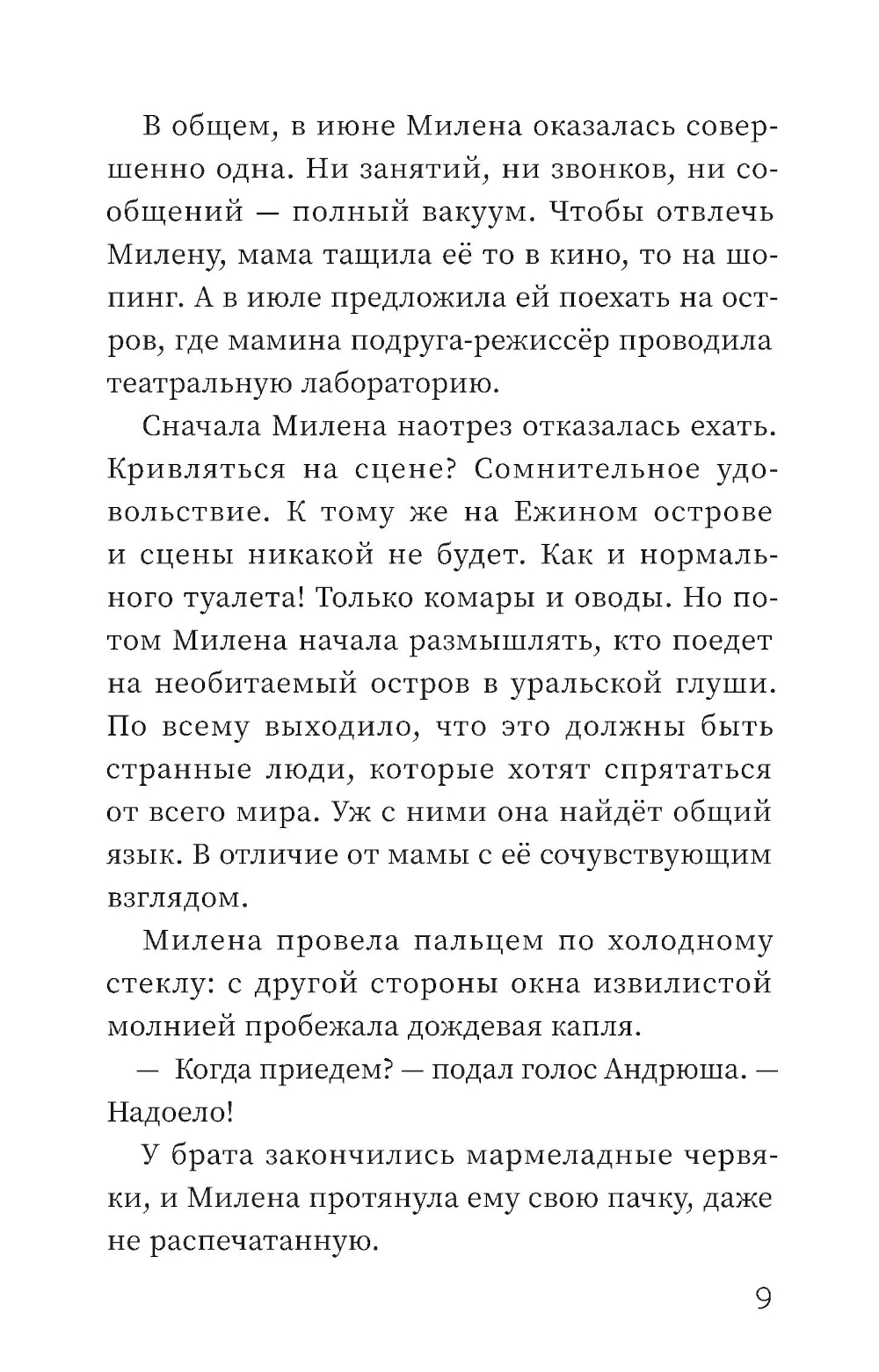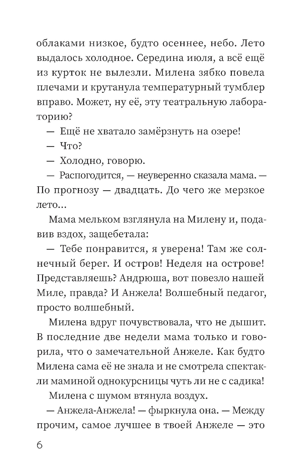 Лето Милены однозначно испорчено: мало того что она рассорилась с лучшей подругой, так ещё и мама навязала ей какую-то творческую лабораторию. Богом забытый остров, кругом одни театралы, и каждый из них мечтает стать знаменитым актёром. Поэтому все тут же бросаются выполнять любое, даже самое странное задание Анжелы - руководителя студии. То молча бродят по острову, то разговаривают с деревьями... Ну какой в этом смысл, и где логика? Но, кажется, не всё так безнадёжно. Симпатичный фотограф Фёдор помогает Милене освоиться. С ним интересно - может, стоит ему довериться?| Издательство | Пять четвертей |