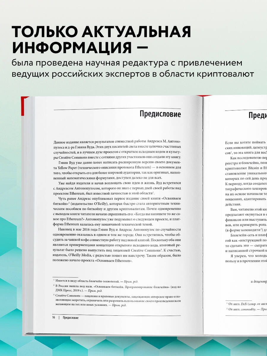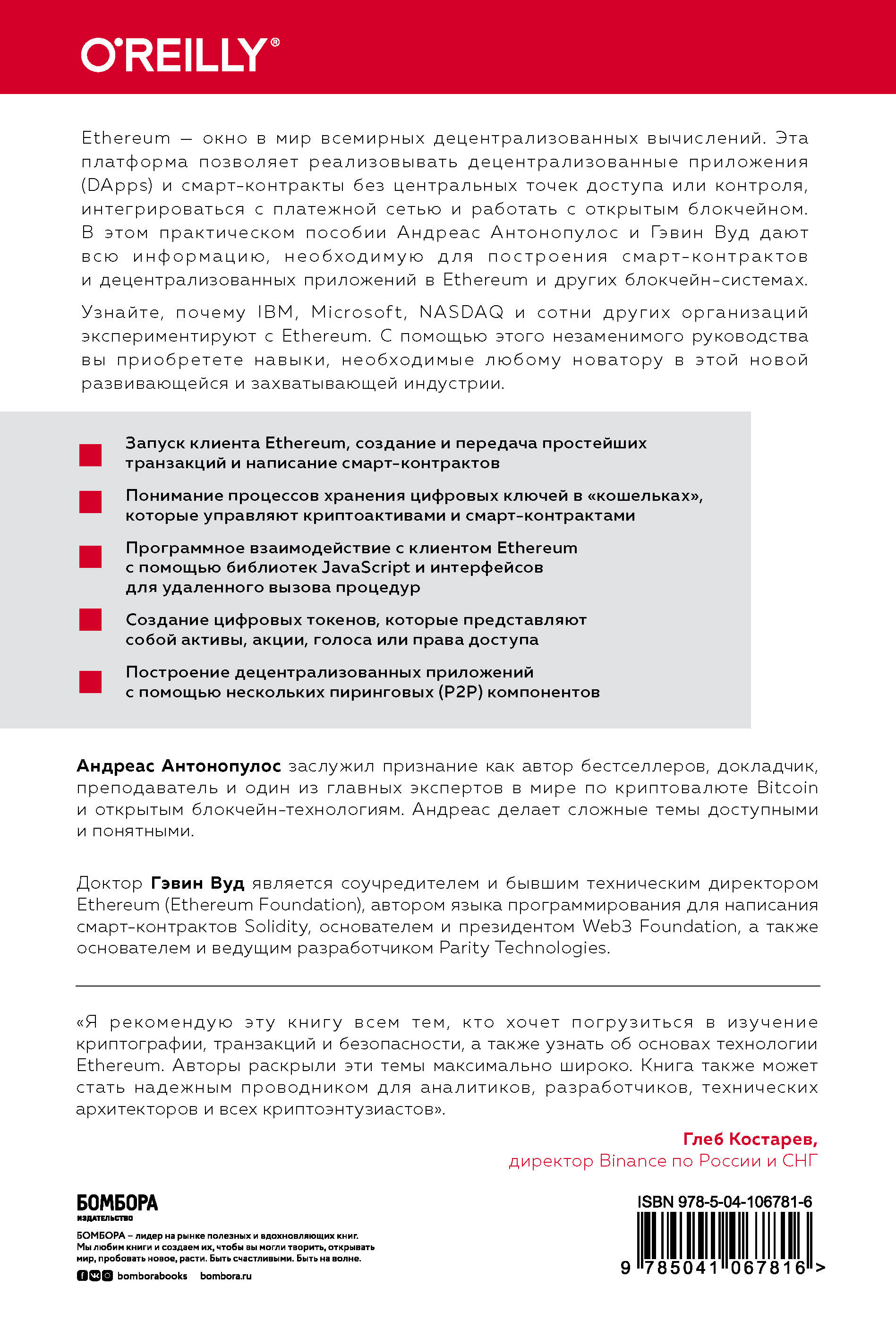 Эта книга - библия блокчейна Ethereum. В ней содержится вся необходимая информация для построения в нем децентрализованных приложений и смарт-контрактов. На сегодняшний день это лучшее пособие для разработчиков, а также всех, кто хочет узнать больше об Ethereum: в чем его особенности и что делает его второй по популярности криптовалютой в мире? Авторы книги - всемирно признанный эксперт в области криптовалюты Андреас Антонопулос и соучредитель и бывший технический директор Ethereum Гэвин Вуд.