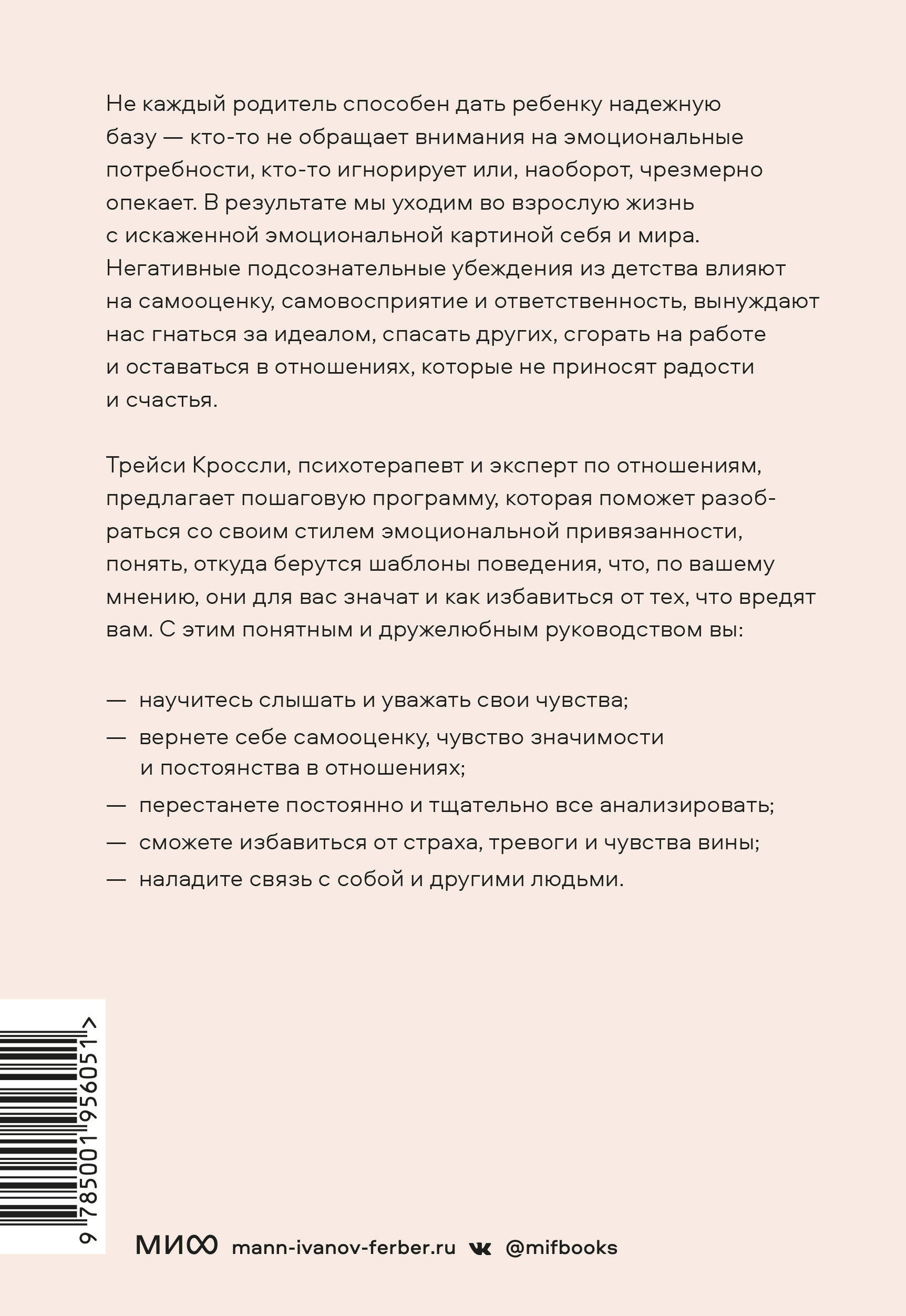 Практическое руководство, которое шаг за шагом поможет разобрать проблемы, связанные с эмоциональной привязанностью, и построить крепкие, надежные и счастливые отношения. Не каждый родитель способен дать ребенку надежную базу - кто-то не обращает внимания на эмоциональные потребности, кто-то игнорирует или, наоборот, чрезмерно опекает. В результате мы уходим во взрослую жизнь с искаженной эмоциональной картиной себя и мира. Негативные подсознательные убеждения из детства влияют на самооценку, самовосприятие и ответственность, вынуждают нас гнаться за идеалом, спасать других, сгорать на работе и оставаться в отношениях, которые не приносят радости и счастья. Трейси Кроссли, психотерапевт и эксперт по отношениям, предлагает пошаговую программу, которая поможет разобраться со своим стилем эмоциональной привязанности, понять, откуда берутся шаблоны поведения, что, по вашему мнению, они для вас значат и как избавиться от тех, что вредят вам. С этим понятным и дружелюбным руководством вы: - научитесь слышать и уважать свои чувства; - вернете себе самооценку, чувство значимости и постоянства в отношениях; - перестанете постоянно и тщательно все анализировать; - сможете избавиться от страха, тревоги и чувства вины; - наладите связь с собой и другими людьми. Для кого эта книга: Для тех, чья ненадежная привязанность в детстве привела к эмоциональным проблемам во взрослом возрасте. Для тех, кто стремится оставить прошлое в прошлом, строить здоровые отношения и идти по жизни с легкостью.| Издательство | МАНН, ИВАНОВ И ФЕРБЕР ООО |