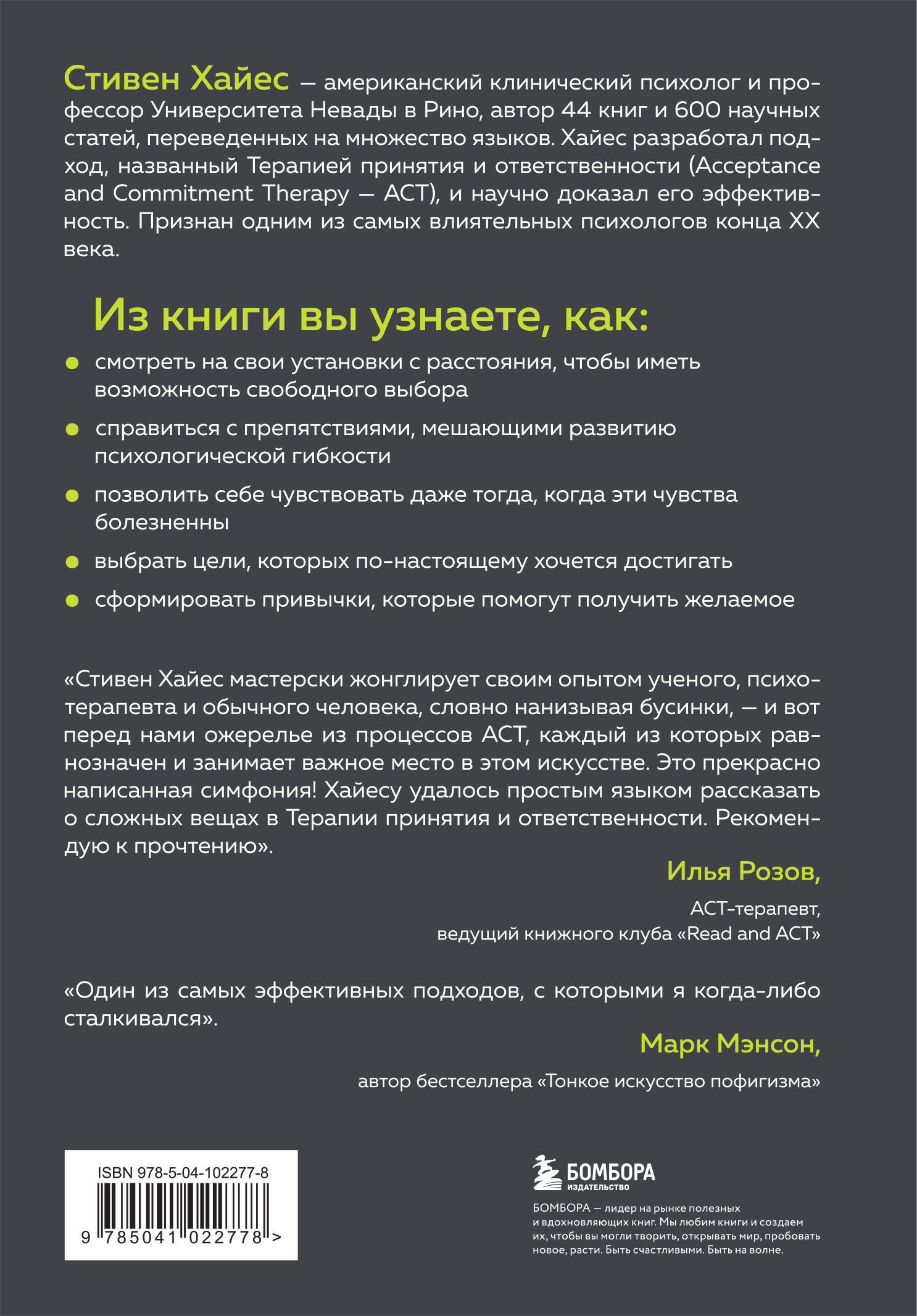 Психологическая гибкость - одно из главных качеств, которым должен обладать современный человек. Благодаря ей мы можем постоянно учиться, легко менять работу или сферу деятельности, выстраивать отношения с новыми людьми и не отчаиваться, когда в жизни случаются неприятности. Как же развить это замечательное качество? Внутри каждого из нас уже есть нужные семена. А новинка от всемирно известного психолога Стивена Хайес поможет их взрастить. Из книги вы узнаете, как: - смотреть на свои установки с расстояния, чтобы иметь возможность свободного выбора; - справиться с препятствиями, мешающими развитию психологической гибкости; - позволить себе чувствовать даже тогда, когда чувства болезненны; - выбрать цели, которых по-настоящему хочется достигать; - сформировать привычки, которые помогут достичь желаемого.