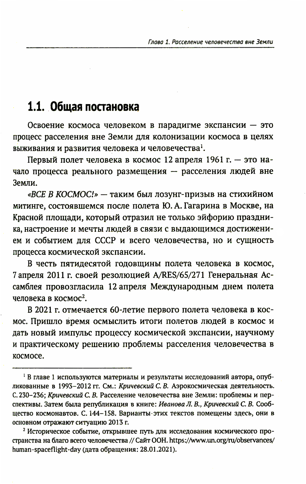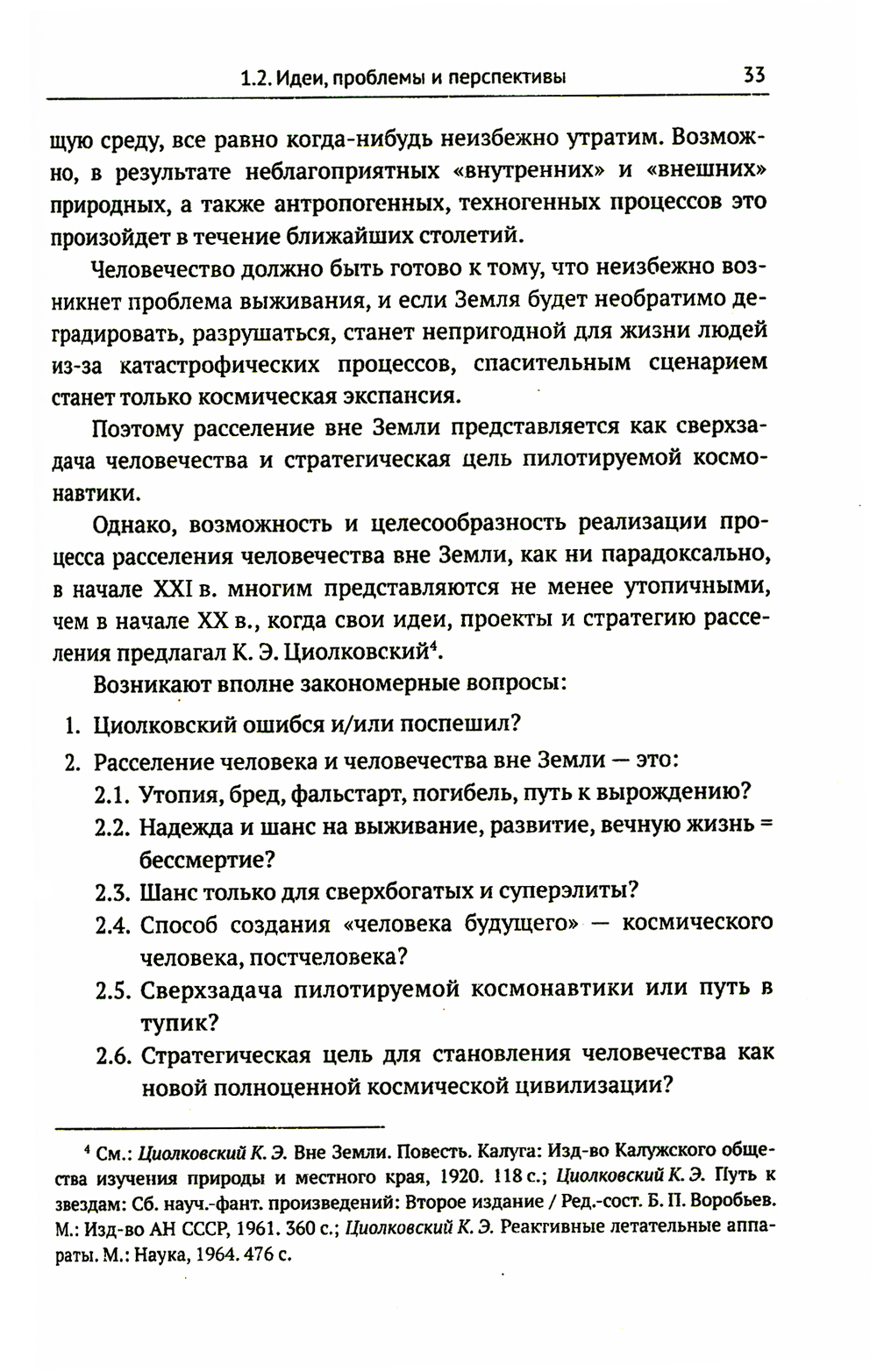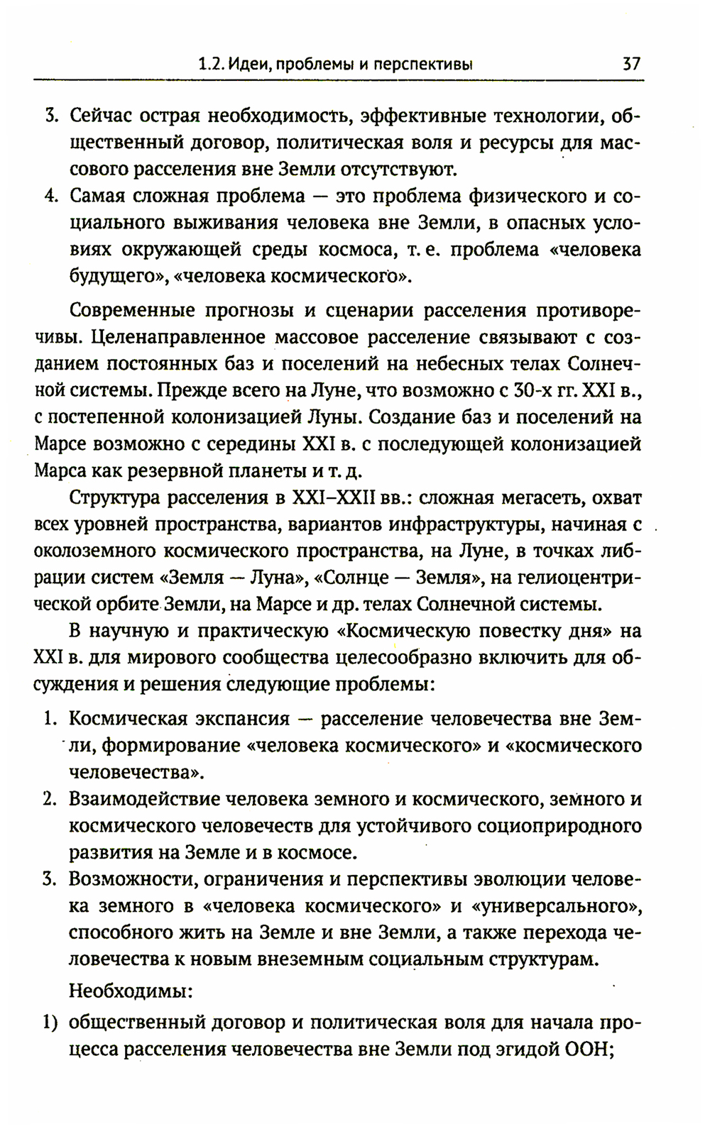 В междисциплинарной постановке рассмотрены методологические, исторические, правовые, политические, социальные, технические, экологические, футурологические аспекты проблемы освоения космоса человеком в России и мире. Даны новые понятия и определения. Главное внимание уделено истории и перспективам Космической эры, идеям, парадигмам, концепциям, стратегиям, проектам, технологиям освоения космоса человеком, экспансии и космическому будущему. Процесс освоения космоса человеком представлен в виде трех периодов - земного, переходного, космического и двух стратегий - ограниченной и безграничной экспансии. Систематизированы эволюция космических полетов, технологий, условий, качества жизни людей вне Земли в XX-XXI вв. и ее перспективы. Изложен оптимистический сценарий новой стратегии освоения космоса в модели «единого человечества», развития космических сообществ, государств, создания Всемирного космического союза, экспансии для постоянной жизни вне Земли, освоения Луны, Марса, Солнечной системы, создания космического человека и человечества как космической цивилизации с реализацией сверхглобальных проектов и экологичных технологий в балансе с решением проблем на Земле. Предложены: концепции космического человека, резервного человечества вне Земли как космического Ноева ковчега, качества жизни людей в космосе; модель процесса освоения космоса человеком в парадигме экспансии; новая парадигма для новой волны освоения космоса - сохранение Homo sapiens как высший приоритет деятельности человека и человечества на Земле и в космосе для выживания, безопасности и развития. Для специалистов в областях истории и философии науки и техники, социальной философии, космических исследований, космической деятельности, новых экологичных технологий и охраны окружающей среды, и для всех, кто интересуется освоением космоса.