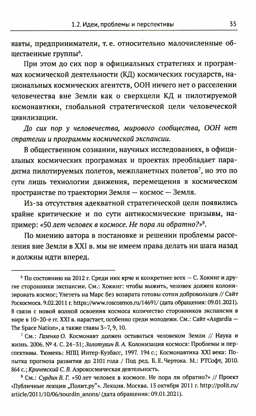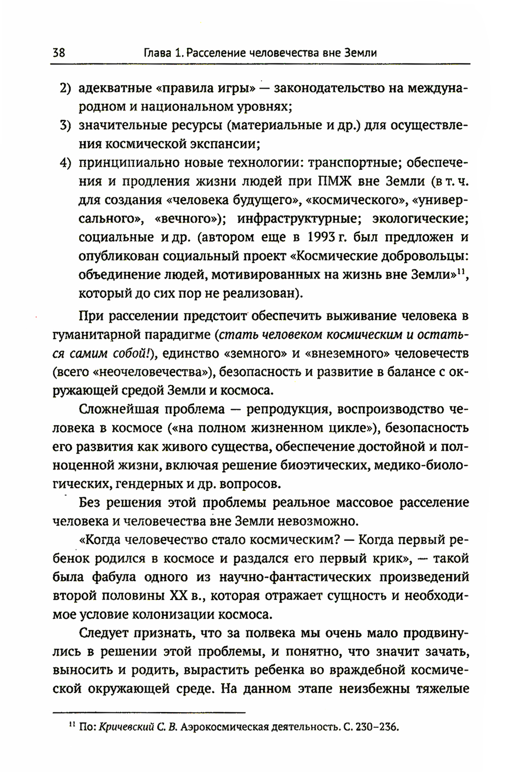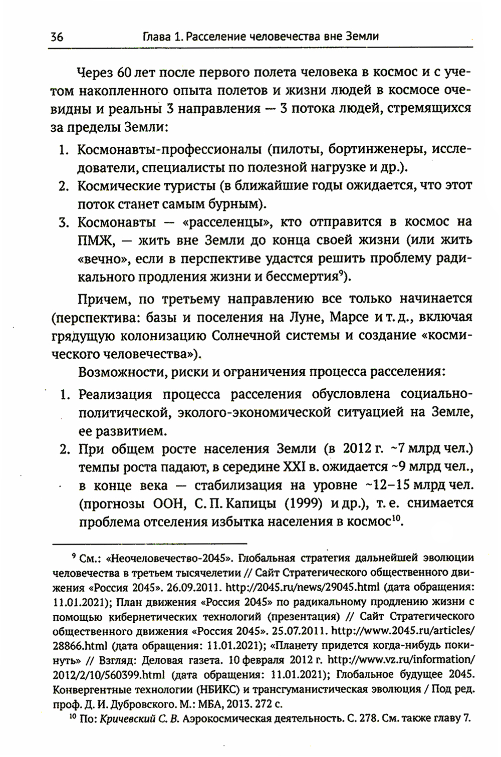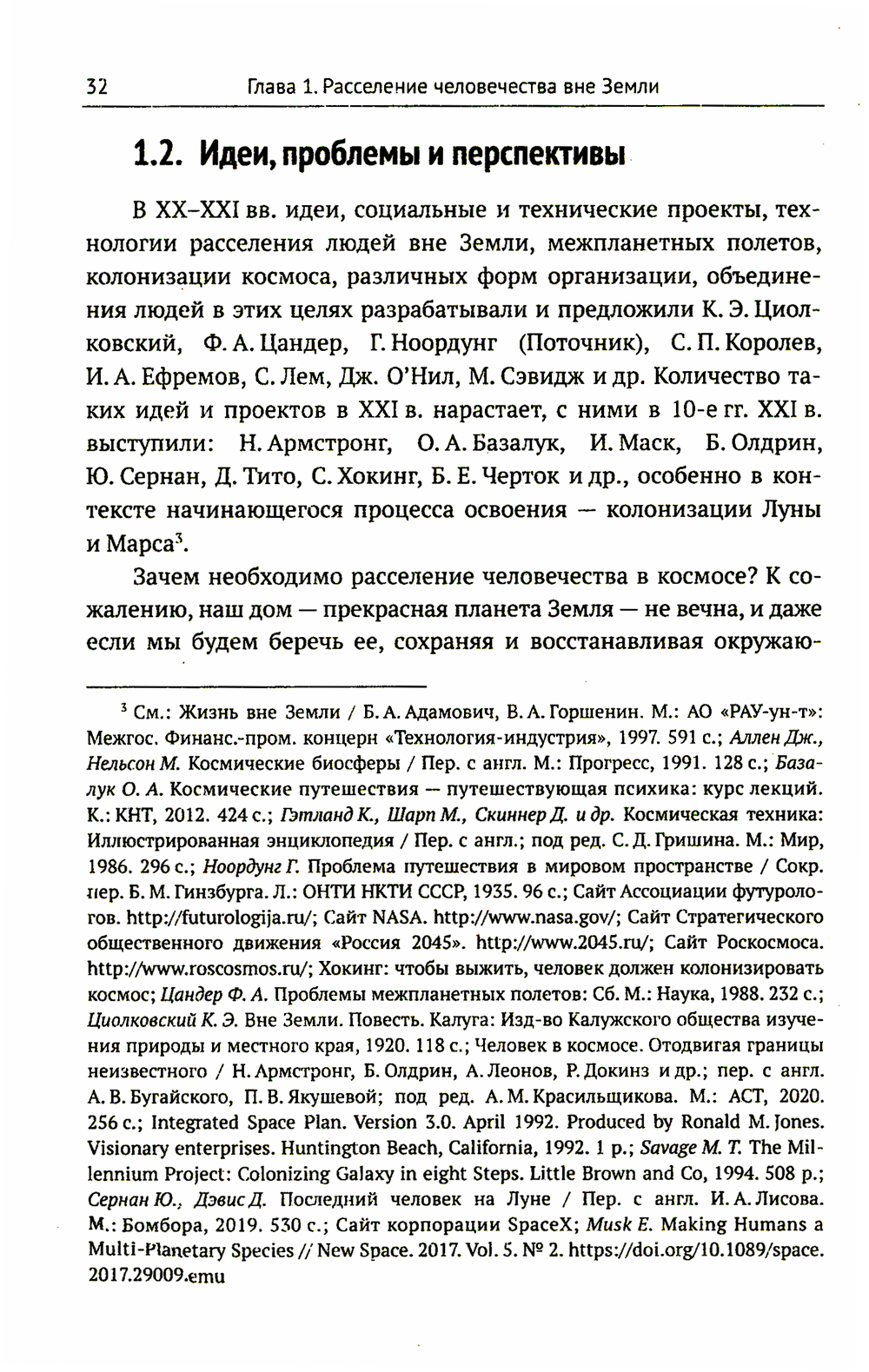 В междисциплинарной постановке рассмотрены методологические, исторические, правовые, политические, социальные, технические, экологические, футурологические аспекты проблемы освоения космоса человеком в России и мире. Даны новые понятия и определения. Главное внимание уделено истории и перспективам Космической эры, идеям, парадигмам, концепциям, стратегиям, проектам, технологиям освоения космоса человеком, экспансии и космическому будущему. Процесс освоения космоса человеком представлен в виде трех периодов - земного, переходного, космического и двух стратегий - ограниченной и безграничной экспансии. Систематизированы эволюция космических полетов, технологий, условий, качества жизни людей вне Земли в XX-XXI вв. и ее перспективы. Изложен оптимистический сценарий новой стратегии освоения космоса в модели «единого человечества», развития космических сообществ, государств, создания Всемирного космического союза, экспансии для постоянной жизни вне Земли, освоения Луны, Марса, Солнечной системы, создания космического человека и человечества как космической цивилизации с реализацией сверхглобальных проектов и экологичных технологий в балансе с решением проблем на Земле. Предложены: концепции космического человека, резервного человечества вне Земли как космического Ноева ковчега, качества жизни людей в космосе; модель процесса освоения космоса человеком в парадигме экспансии; новая парадигма для новой волны освоения космоса - сохранение Homo sapiens как высший приоритет деятельности человека и человечества на Земле и в космосе для выживания, безопасности и развития. Для специалистов в областях истории и философии науки и техники, социальной философии, космических исследований, космической деятельности, новых экологичных технологий и охраны окружающей среды, и для всех, кто интересуется освоением космоса.