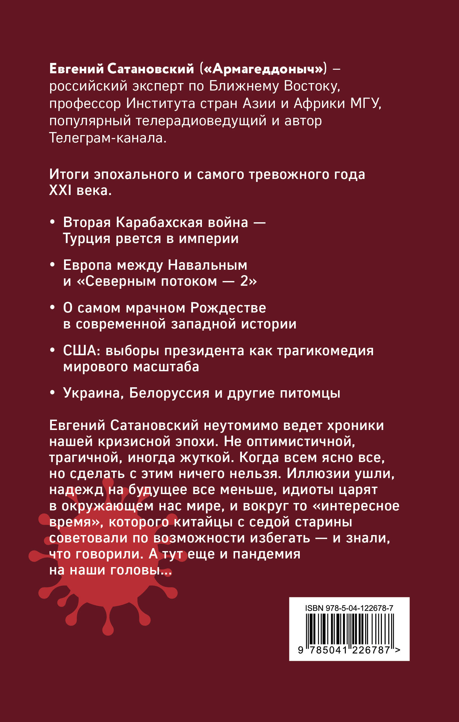 Евгений Сатановский («Армагеддоныч») - главный российский эксперт по Ближнему Востоку, профессор Института стран Азии и Африки МГУ и популярный теле-, радиоведущий и блогер. Итоги эпохального и самого тревожного года XXI века. • Вторая Карабахская война - Турция рвётся в империи. • Европа между Навальным и «Северным потоком-2». • О самом мрачном Рождестве в современной западной истории. • США: выборы президента как трагикомедия мирового масштаба. • Украина, Белоруссия и другие питомцы нашего зоопарка. Последние месяцы 2020 года... Коронавирус каким был, таким и остался. Привыкли немного к заразе и население, и руководство, да и вакцина появилась. Спасибо медикам и армейскому начальству, которое, как всегда, доделывает то, что должны были делать другие. Ну, Шойгу же... При этом помирать народ в стране не прекратил, причём помирают лучшие - из умных. Что характерно, сволочь живёт и в ус не дует. И столичная, и провинциальная, и которая на федеральном уровне. Неважно, из начальства или оппозиции. Заговорённые они все, что ли? На Украине продолжается и разрастается маразм. В Белоруссии борьба протестующих с Батькой перешла в хроническую фазу. Европа пляшет вокруг Навального, но и «Северный поток-2» достроить хочет. НАТО к нашим границам военную технику подтаскивает и маневры в Евросоюзе на тему ядерной войны проводит. В Америке президентские выборы с подтасовками, чтоб и духа трамповского на второй срок не было. Вот так и заканчиваются сверхдержавы. Ну и, понятно, подарок из Турции под конец года - война в Карабахе. По поводу тюркского мира у турецкой власти насчёт гегемонии и роли старшего брата, большие амбиции. Россия, кто помнит, Закавказье у Турции и Ирана отвоёвывала. Лет триста там варилась эта каша и вот - снова закипает. Такие дела... Евгений Сатановский продолжает вести хроники нашей коронавирусной эпохи. Неоптимистичной, трагичной, иногда жуткой. Когда всем ясно всё, но сделать с этим ничего нельзя. Иллюзии ушли, надежд на будущее всё меньше, идиоты царят в окружающем нас мире, и вокруг, по сути, то «интересное время», которого китайцы с седой старины советовали по возможности избегать - и знали, что говорили. А тут ещё и пандемия на наши головы...| Издательство | Эксмо |