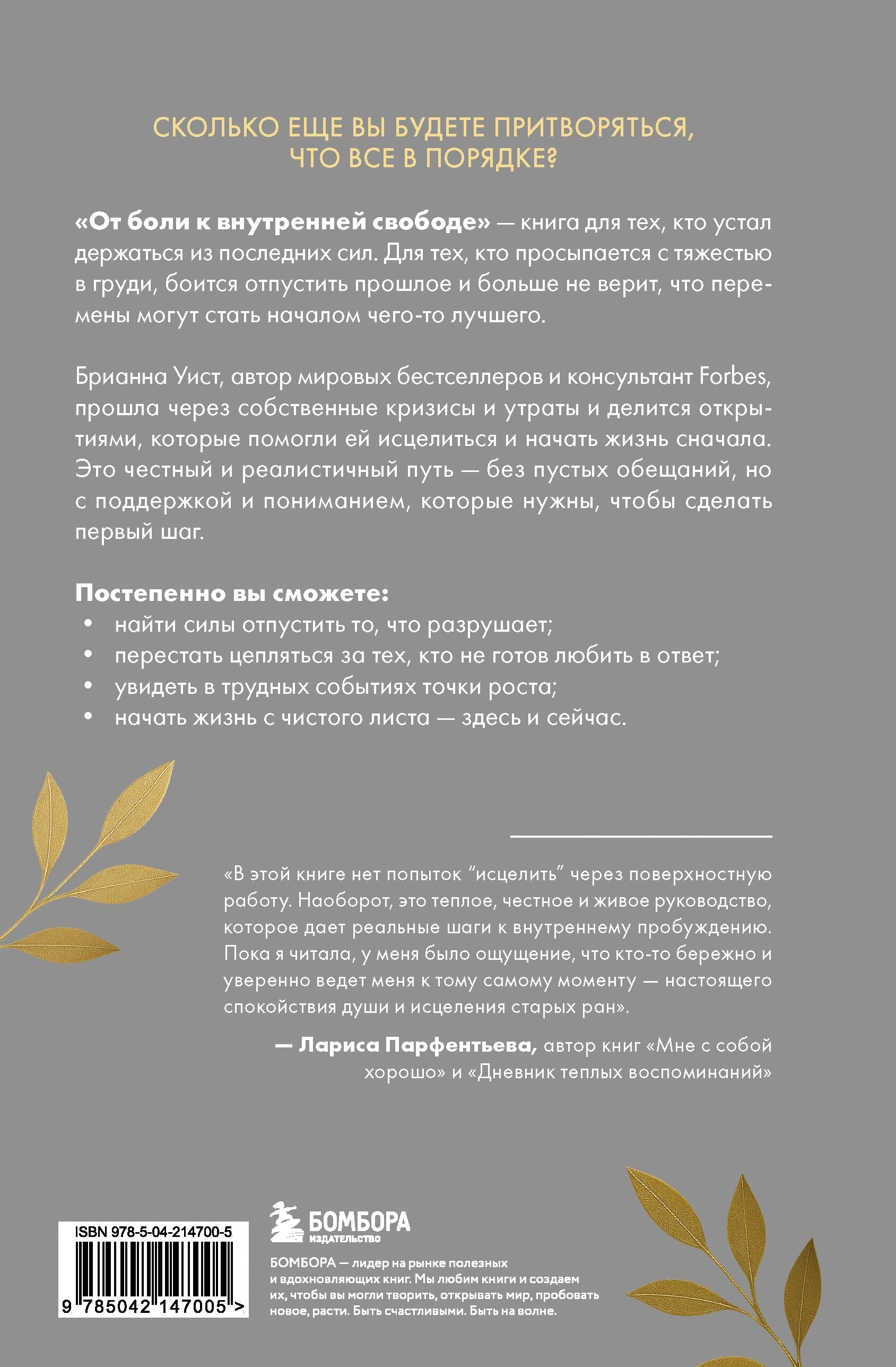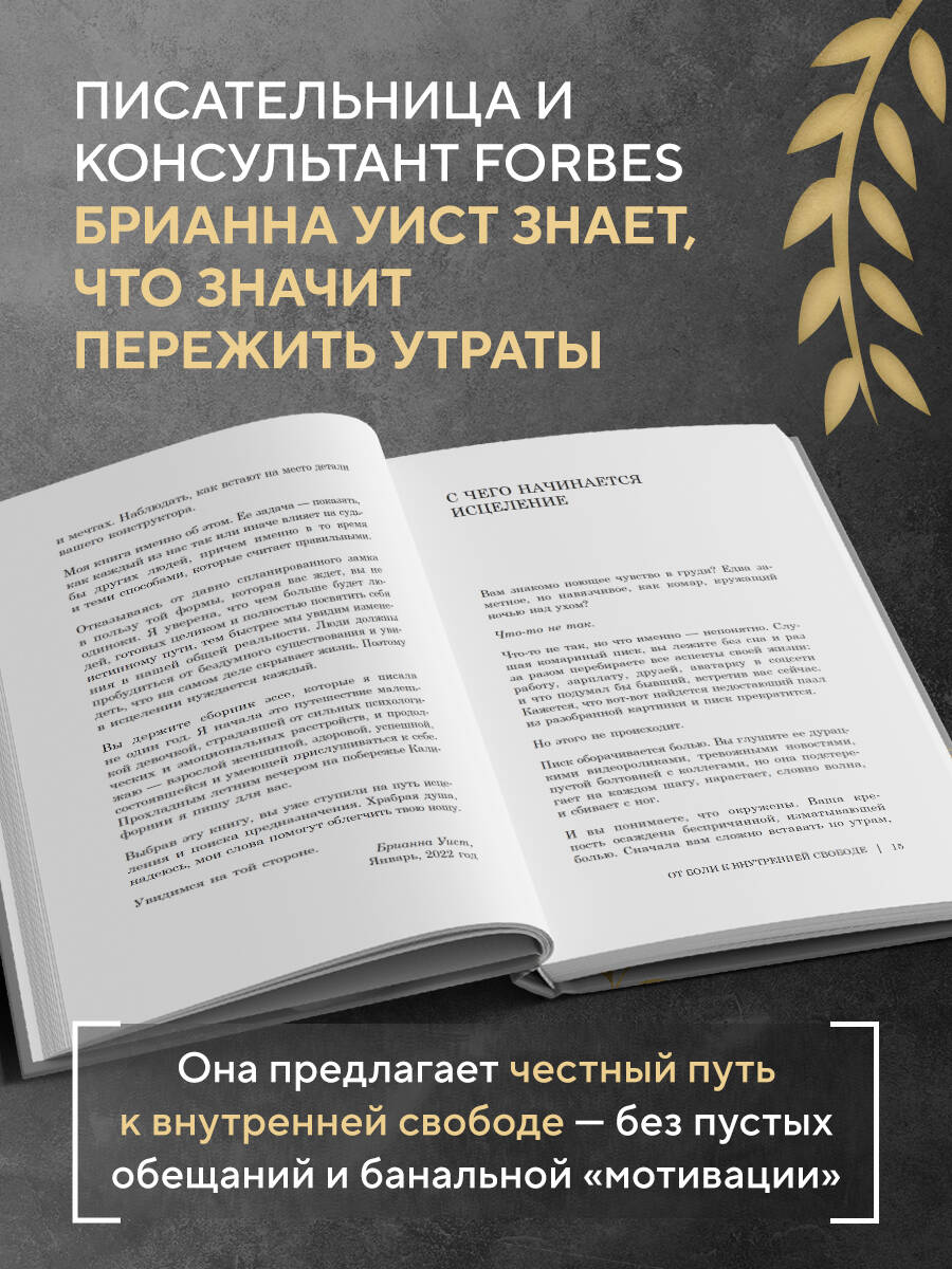 Сколько еще вы будете притворяться, что все в порядке? «От боли к внутренней свободе» - книга для тех, кто устал держаться из последних сил. Для тех, кто просыпается с тяжестью в груди, боится отпустить прошлое и больше не верит, что перемены могут стать началом чего-то лучшего. Брианна Уист, автор мировых бестселлеров и консультант Forbes, прошла через собственные кризисы и утраты и делится открытиями, которые помогли ей исцелиться и начать жизнь сначала. Это честный и реалистичный путь - без пустых обещаний, но с поддержкой и пониманием, которые нужны, чтобы сделать первый шаг. Постепенно и бережно вы сможете: • найти силы отпустить то, что разрушает; • перестать цепляться за тех, кто не готов любить в ответ; • увидеть в трудных событиях точки роста; • начать жизнь с чистого листа - здесь и сейчас. «Брианна пишет для тех, кого уже не цепляют фразы вроде "Просто настройся, ты справишься" или "Грустишь? Не грусти". Для тех, кто устал от пустых лозунгов и мотивации на пять минут. В этой книге нет попыток "исцелить" через поверхностную работу. Наоборот, это теплое, честное и живое руководство, которое дает реальные шаги к внутреннему пробуждению. Пока я читала, у меня было ощущение, что кто-то бережно и уверенно ведет меня к тому самому моменту - настоящего спокойствия души и исцеления старых ран». - Лариса Парфентьева, автор книг «Мне с собой хорошо» и «Дневник теплых воспоминаний»| Издательство | ООО "Издательство "Эксмо" |