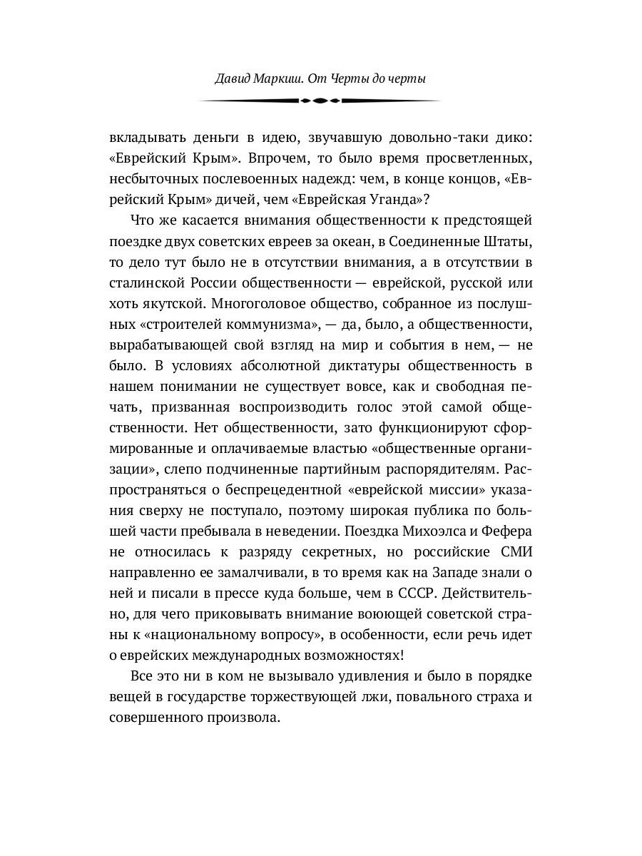 Документальный роман Давида Маркиша «От Черты до черты» об истории общественной организации Еврейского антифашистского комитета (ЕАК), созданной по указанию Сталина в начале 1942 года при Совинформбюро. В комитет вошли представители советской еврейской интеллигенции из разных сфер деятельности: руководитель Совинформбюро Соломон Лозовский, писатели Илья Эренбург и Давид Бергельсон, поэты Самуил Маршак, Перец Маркиш, Лев Квитко, кинорежиссер Сергей Эйзенштейн, музыканты Давид Ойстрах, Самуил Гилельс, актер Вениамин Зускин. генералы Яков Крейзер и Арон Кац, академики Александр Фрумкин, Петр Капица, председателем комитета стал главный режиссер Московского государственного еврейского театра Соломон Михоэлс.