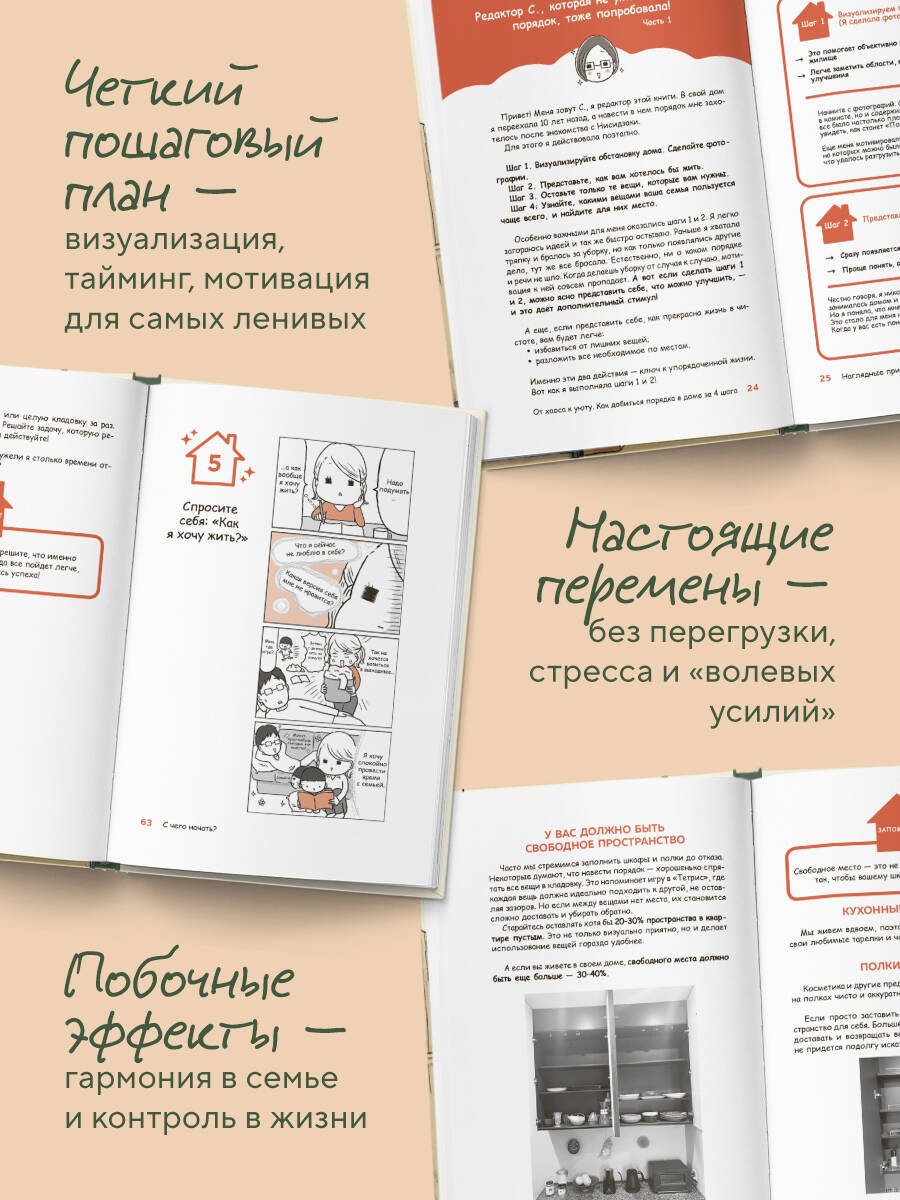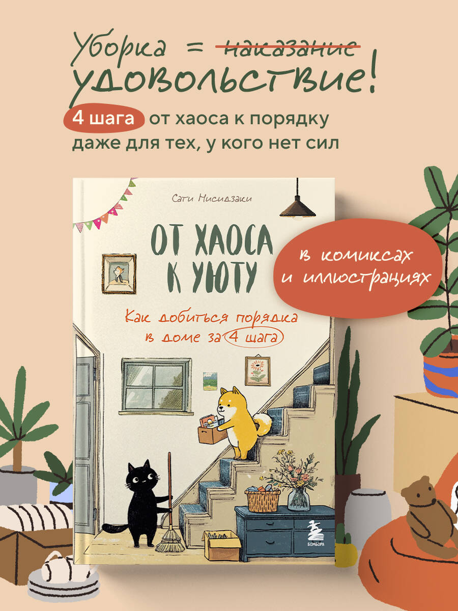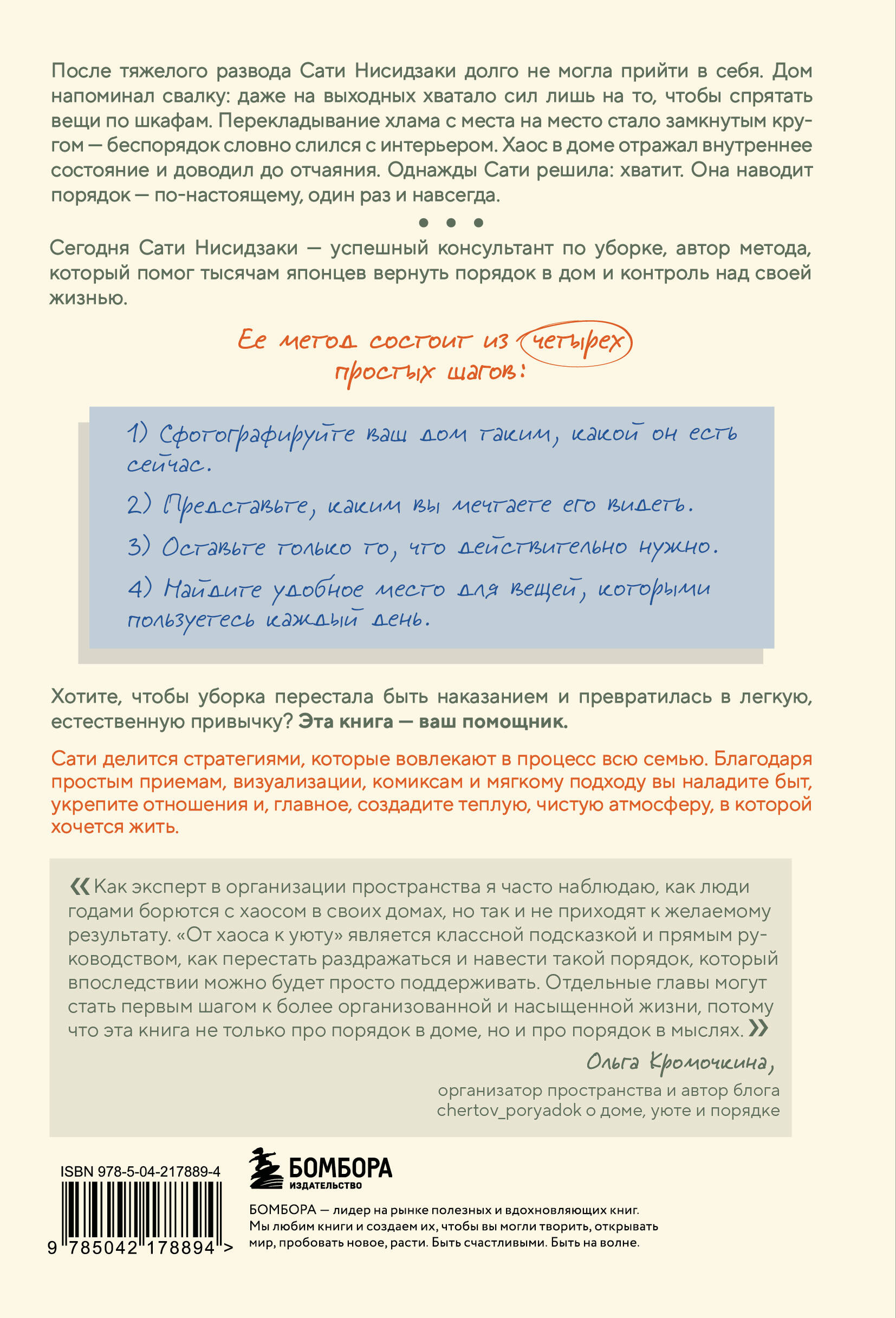 Как навести порядок дома, когда совсем нет сил? Этот вопрос знаком многим. Консультант по уборке Сати Нисидзаки нашла на него ответ. Она помогла тысячам японцев избавиться от хлама и вернуть ощущение спокойствия и контроля. Почему обычная уборка не работает? Потому что вы просто перекладываете хлам с места на место. А Сати предлагает убрать источник беспорядка, а не только его внешние проявления. Что даст вам эта книга? - Четкий пошаговый план - визуализация, тайминг, мотивация - даже ленивый справится. - Настоящие перемены - без перегрузки, стресса и «волевых усилий». - Побочные эффекты - улучшатся отношения в семье, вы почувствуете контроль над жизнью, а жить станет легче и радостнее. Метод Сати Нисидзаки - не просто про наведение порядка. Это путь к внутренним переменам. Книга наполнена яркими иллюстрациями и комиксами.| Издательство | ООО "Издательство "Эксмо" |