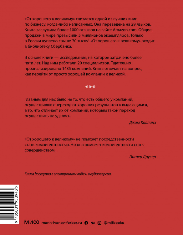 Эта книга рассказывает о том, как хорошая компания может стать великой. В ее основу легли результаты масштабного анализа развития наиболее успешных компаний-долгожителей| Издательство | Манн, Иванов и Фербер |