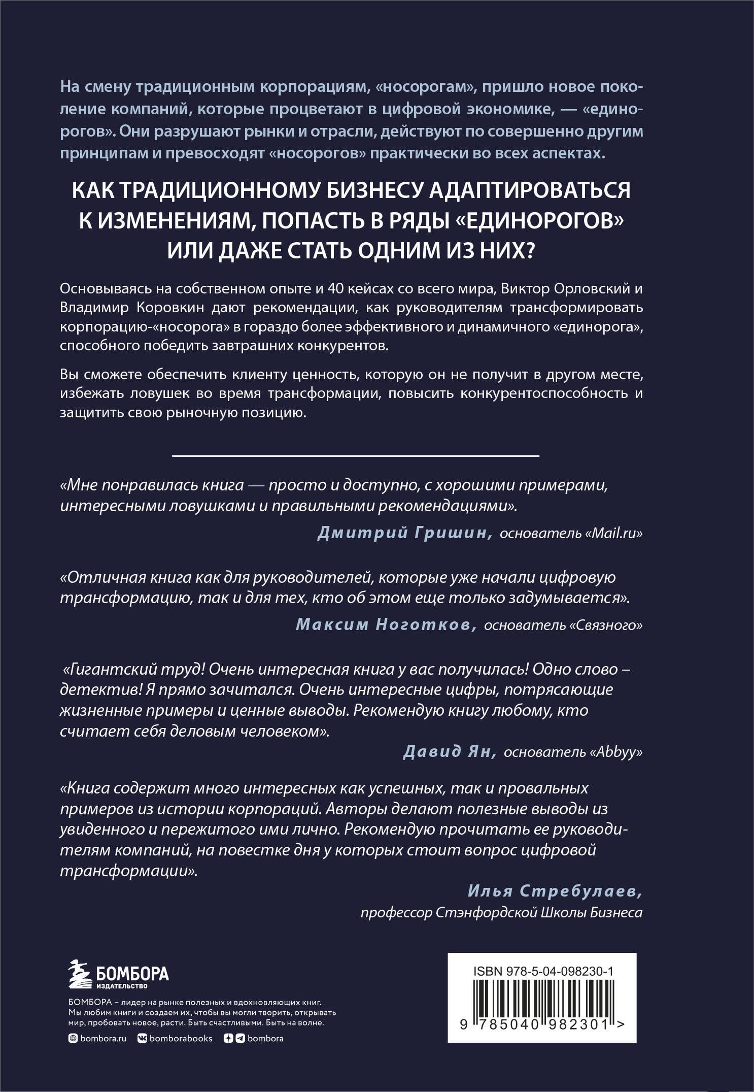 Победитель премии PwC "Деловая книга года в России" 2021! На смену традиционным корпорациям, «носорогам», пришло новое поколение компаний, которые процветают в цифровой экономике, - «единороги». Они разрушают рынки и отрасли, действуют по совершенно другим принципам и превосходят «носорогов» практически во всех аспектах. Как традиционному бизнесу адаптироваться к изменениям, попасть в ряды «единорогов» или даже стать одним из них? Основываясь на собственном опыте и 40 кейсах со всего мира, Виктор Орловский и Владимир Коровкин дают рекомендации, как руководителям трансформировать корпорацию-«носорога» в гораздо более эффективного и динамичного «единорога», способного победить завтрашних конкурентов. Вы сможете обеспечить клиенту ценность, которую он не получит в другом месте, избежать ловушек во время трансформации, повысить конкурентоспособность и защитить свою рыночную позицию. Виктор Орловский - управляющий партнер венчурного фонда Fort Ross Ventures. Владимир Коровкин - руководитель направления «Инновации и цифровые технологии» МШУ «Сколково». «Мне понравилась книга - просто и доступно, с хорошими примерами, интересными ловушками и правильными рекомендациями». - Дмитрий Гришин, основатель «Mail.ru» «Отличная книга как для руководителей, которые уже начали цифровую трансформацию, так и для тех, кто об этом еще только задумывается». - Максим Ноготков, основатель «Связного» «Гигантский труд! Очень интересная книга у вас получилась. Одно слово - детектив! Я прямо зачитался. Очень интересные цифры, потрясающие жизненные примеры и ценные выводы. Рекомендую книгу любому, кто считает себя деловым человеком». - Давид Ян, основатель «Abbyy»| Издательство | ООО "Издательство "Эксмо" |