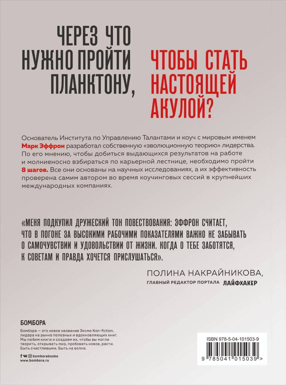 Через что нужно пройти планктону, чтобы стать настоящей акулой? Основатель Института по Управлению Талантами и коуч с мировым именем Марк Эффрон разработал собственную «эволюционную теорию» лидерства. По его мнению, чтобы добиться выдающихся результатов на работе и молниеносно взбираться по карьерной лестнице, необходимо пройти 8 шагов. Все они основаны на научных исследованиях, а их эффективность проверена самим автором во время коучинговых сессий в крупнейших международных компаниях. Эта книга для тех, кто: - засиделся на рабочем месте и хочет перемен; - считает, что достоин большего, - но не понимает, с чего начать; - жаждет совершить «квантовый скачок» в карьере и получить повышение; - мечтает превратиться из «офисного планктона» в настоящую акулу. Отзывы «Практичный набор действий и поведенческих моделей, обеспечивающих высокие карьерные результаты». - «Ведомости» «Меня подкупил дружеский тон повествования: Эффрон считает, что в погоне за высокими рабочими показателями важно не забывать о самочувствии и удовольствии от жизни. Когда о тебе заботятся, к советам и правда хочется прислушаться». - Полина Накрайникова, главный редактор портала «Лайфхакер» Об авторе Марк Эффрон является основателем и президентом группы Talent Strategy Group, которая консультирует ведущие мировые организации, как управлять талантами. Эффрон был признан одним из 100 самых влиятельных персон в сфере управления персоналом.| Издательство | ООО "Издательство "Эксмо" |