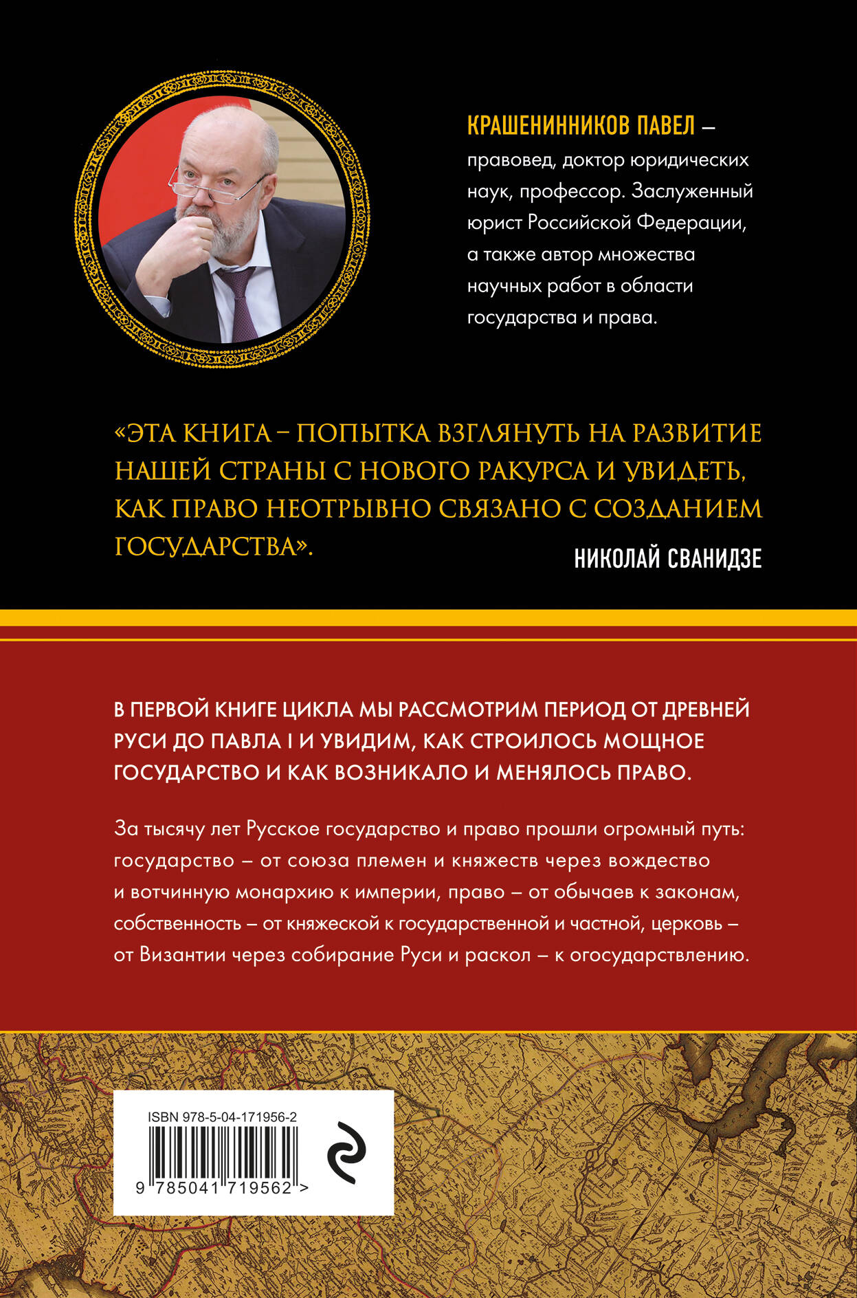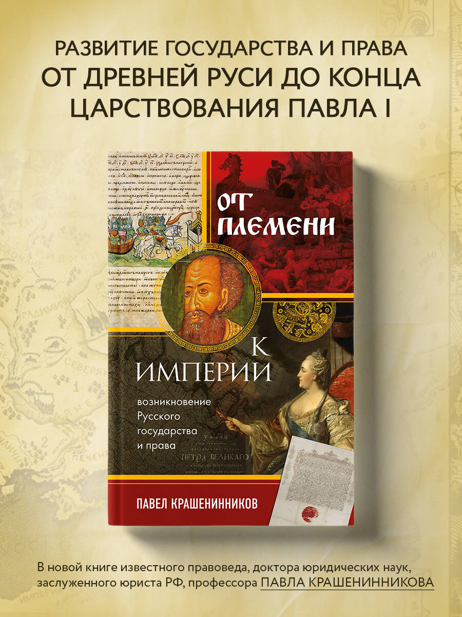 С момента появления первых цивилизаций люди столкнулись с проблемами, разрешить которые прежними способами они уже не могли. Так начало зарождаться право. Однако право - это не незыблемый свод правил и законов, а динамичная, постоянно меняющаяся система. И она зависит от государственного строя, уровня централизации власти и даже культуры страны. Книга известного российского правоведа «От племени к империи. Возникновение русского государства и права» охватывает период с момента формирования российского государства в IX веке до конца правления Павла I на рубеже XVIII-XIX вв. Прочитав её, вы узнаете, на основе каких юридических норм строилось древнерусское право и как на него повлияло татаро-монгольское иго. Что стало причиной дворцовых переворотов XVIII века, кого первым из русских правителей прозвали Грозным и почему - на эти и многие другие вопросы вы сможете найти ответ в этой книге. Если вам интересна история России и история государства и права, если вы хотите научиться видеть взаимосвязи между развитием государственности и юриспруденции, это издание станет для вас отличным подарком. Крашенинников Павел - правовед, доктор юридических наук, профессор. Заслуженный юрист Российской Федерации, а также автор множества научных работ в области истории государства и права.
