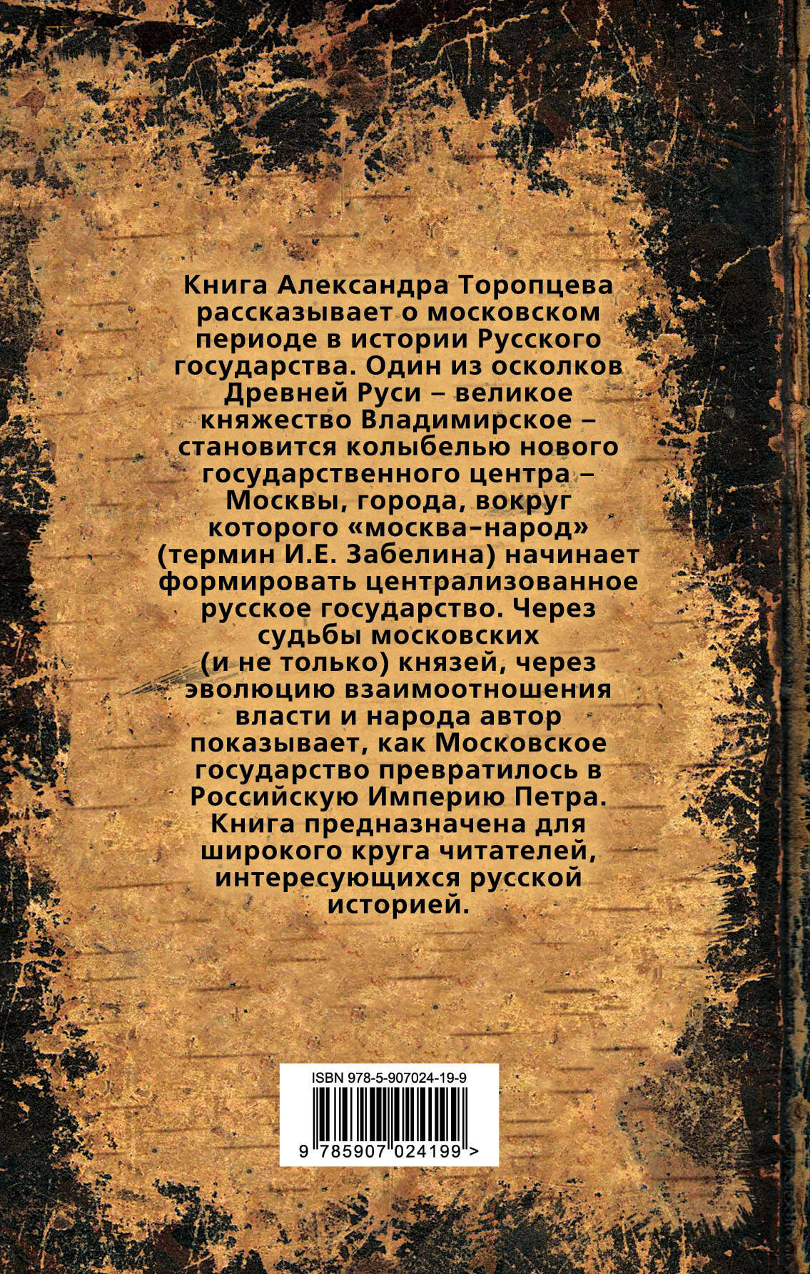 Книга Александра Торопцева рассказывает о московском периоде в истории Русского государства. Один из осколков Древней Руси - великое княжество Владимирское - становится колыбелью нового государственного центра - Москвы, города, вокруг которого "москва-народ" (термин И.Е. Забелина) начинает формировать централизованное русское государство. Через судьбы московских (и не только) князей, через эволюцию взаимоотношения власти и народа автор показывает, как Московское государство превратилось в Российскую империю Петра. Книга предназначена для широкого круга читателей, интересующихся русской историей.