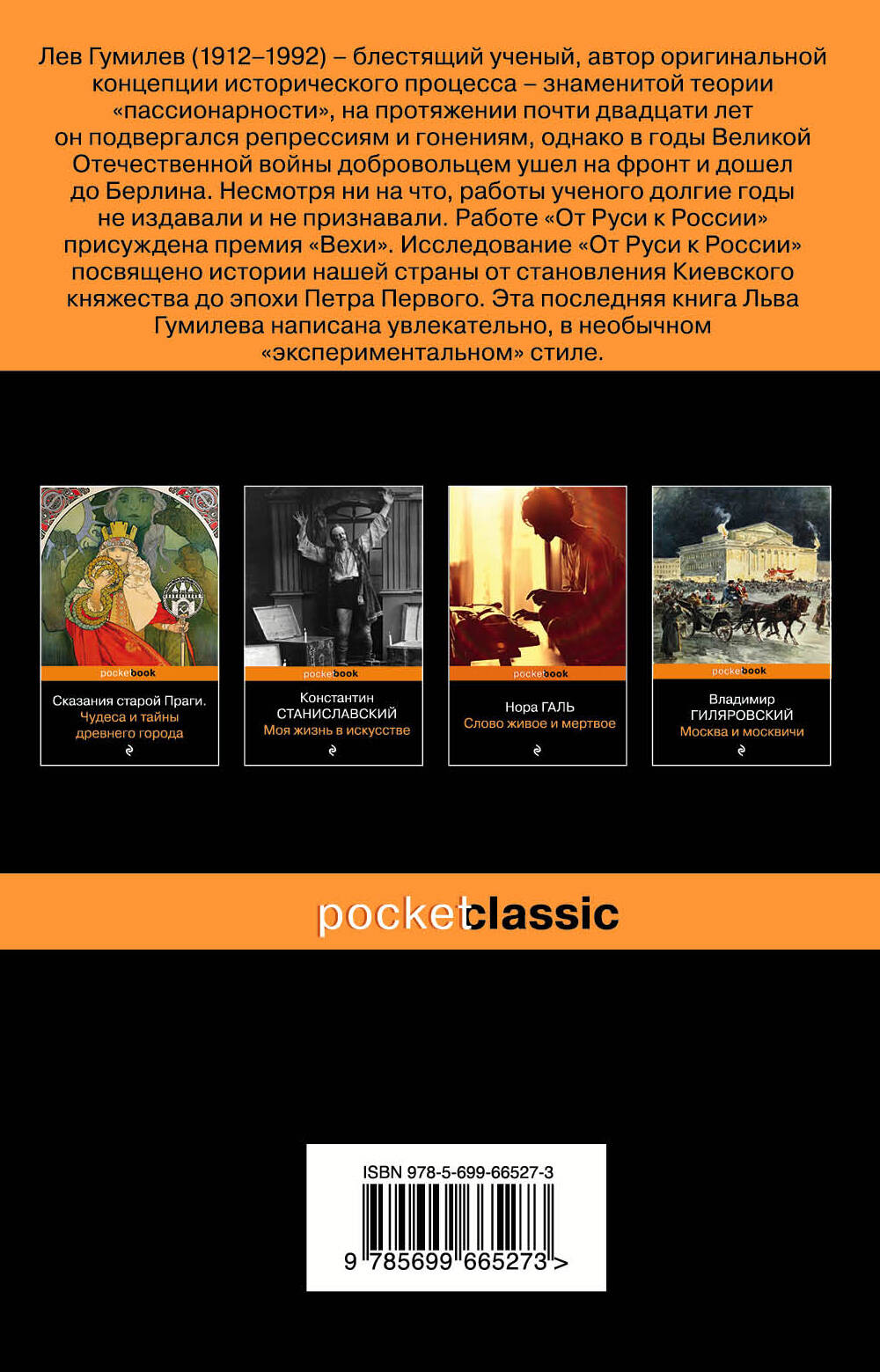 Лев Гумилев (1912 - 1992) - блестящий ученый, автор оригинальной концепции исторического процесса - знаменитой теории "пассионарности", на протяжении почти двадцати лет он подвергался репрессиям и гонениям, однако в годы Великой Отечественной войны добровольцем ушел на фронт и дошел до Берлина. Несмотря ни на что работы ученого долгие годы не издавали и не признавали. Работе "От Руси к России" присуждена премия "Вехи". Исследование "От Руси к России" посвящено истории нашей страны от становления Киевского княжества до эпохи Петра Первого. Эта последняя книга Льва Гумилева написана увлекательно, в необычном "экспериментальном" стиле.| Издательство | ООО "Издательство "Эксмо" |