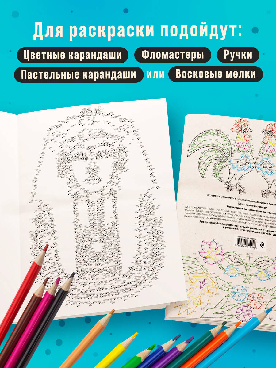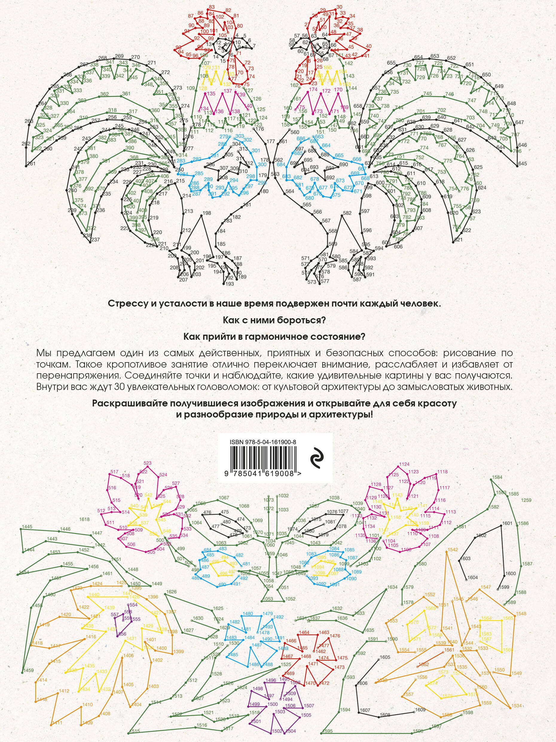 Стрессу и усталости в наше время подвержен почти каждый человек. Как с ними бороться? Как прийти в гармоничное состояние? Подарите себе увлекательный вечер головоломок! Внутри этого издания вас ждут иллюстрации на разные темы: культовая архитектура, замысловатые орнаменты, благородные животные и необычные насекомые. Переключитесь от будничной суеты и наблюдайте, как волшебным образом, на листе начинают появляться львы, ящерицы, совы и многие другие. Для удобства, на всех иллюстрациях есть несколько цветов, чтобы не терять нужные точки и помочь оживить ваши будущие картины. Плотная бумага страничек раскраски позволит применять разные художественные инструменты: цветные карандаши, фломастеры, гелевые или шариковые ручки, краски, пастельные карандаши или восковые мелки. Серия «Арт-терапия» - это множество причудливых узоров и фантастических рисунков, которые подарят вам спокойствие и умиротворение и помогут избавиться от стресса. Возьмите карандаш или ручку и полностью отключитесь от внешнего мира, проводя тонкую линию от точки к точке, и через некоторое время вы вернетесь уже полностью обновленным человеком. Когда закончите - можете раскрасить рисунок.| Издательство | Эксмо |